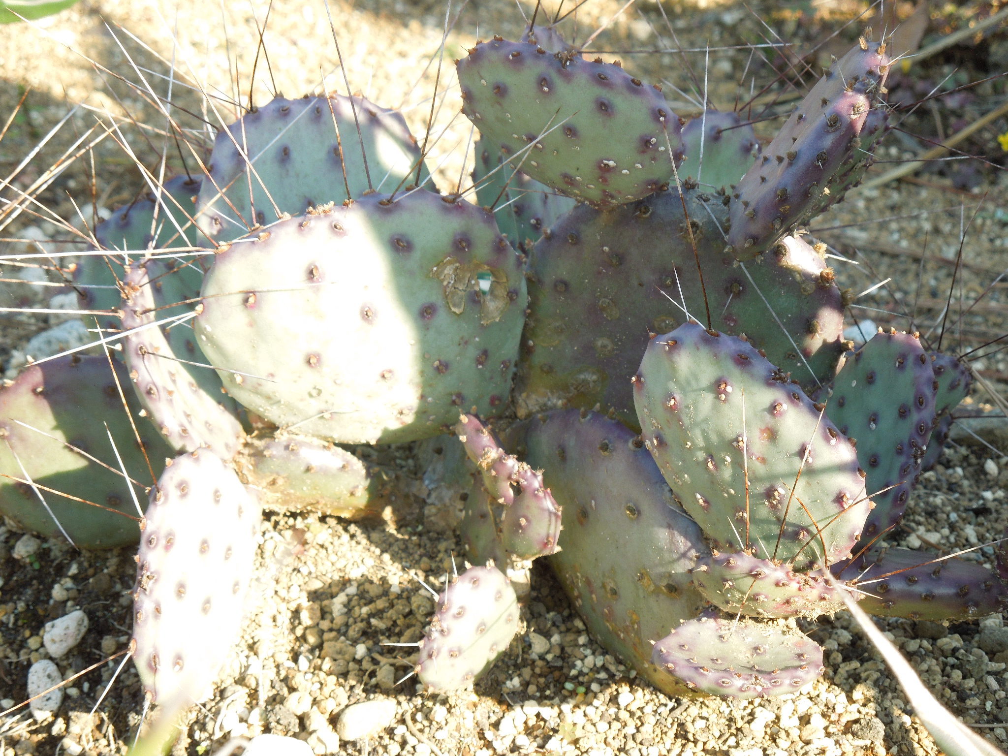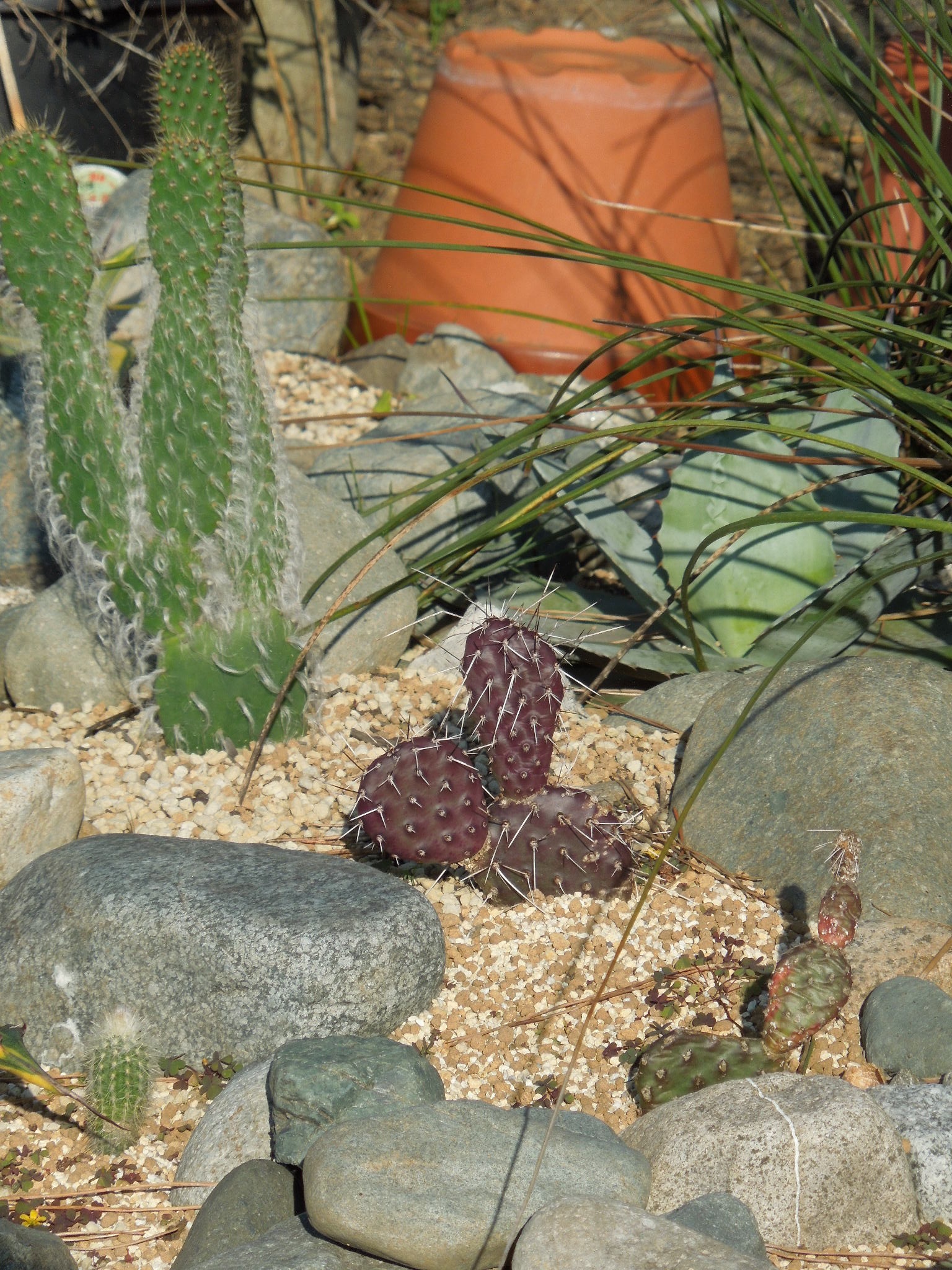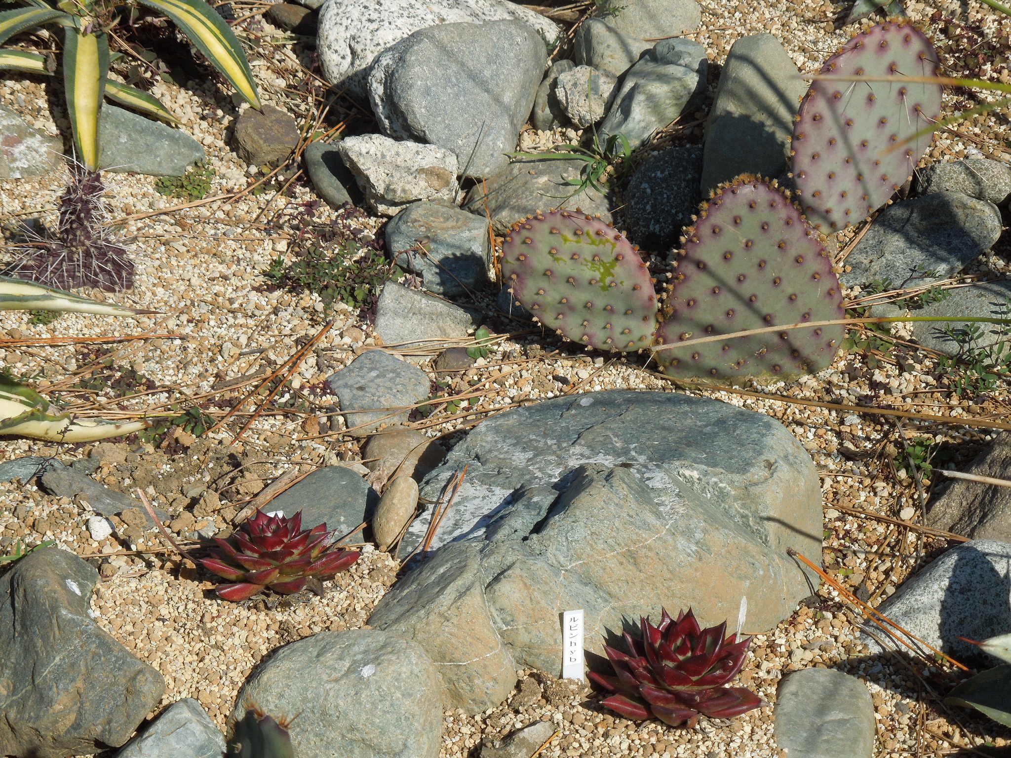 畑のオプンチアの様子。5月末頃までに地植えにしたサンタリタ。どれも活着したようで、新しいパッドを出して・・・最近の寒さで色づき始めた。これが一番紫になっているか・・・これも紅葉が進んできた???3株の中で、刺座のモコモコが一番多い???紅葉は、まだこれから???2段目のパッドは、まだブルー。どれも色づき始めてはいるが・・・サンタリタという名前で流通しているオプンチア・・・どれも微妙に違いがある感じ。産地違い???園芸品種???自然交雑種???訳が分からない。とりあえずは、綺麗な紫色を見たいだけなのだが・・・これからの、紅葉の進み具合に期待!