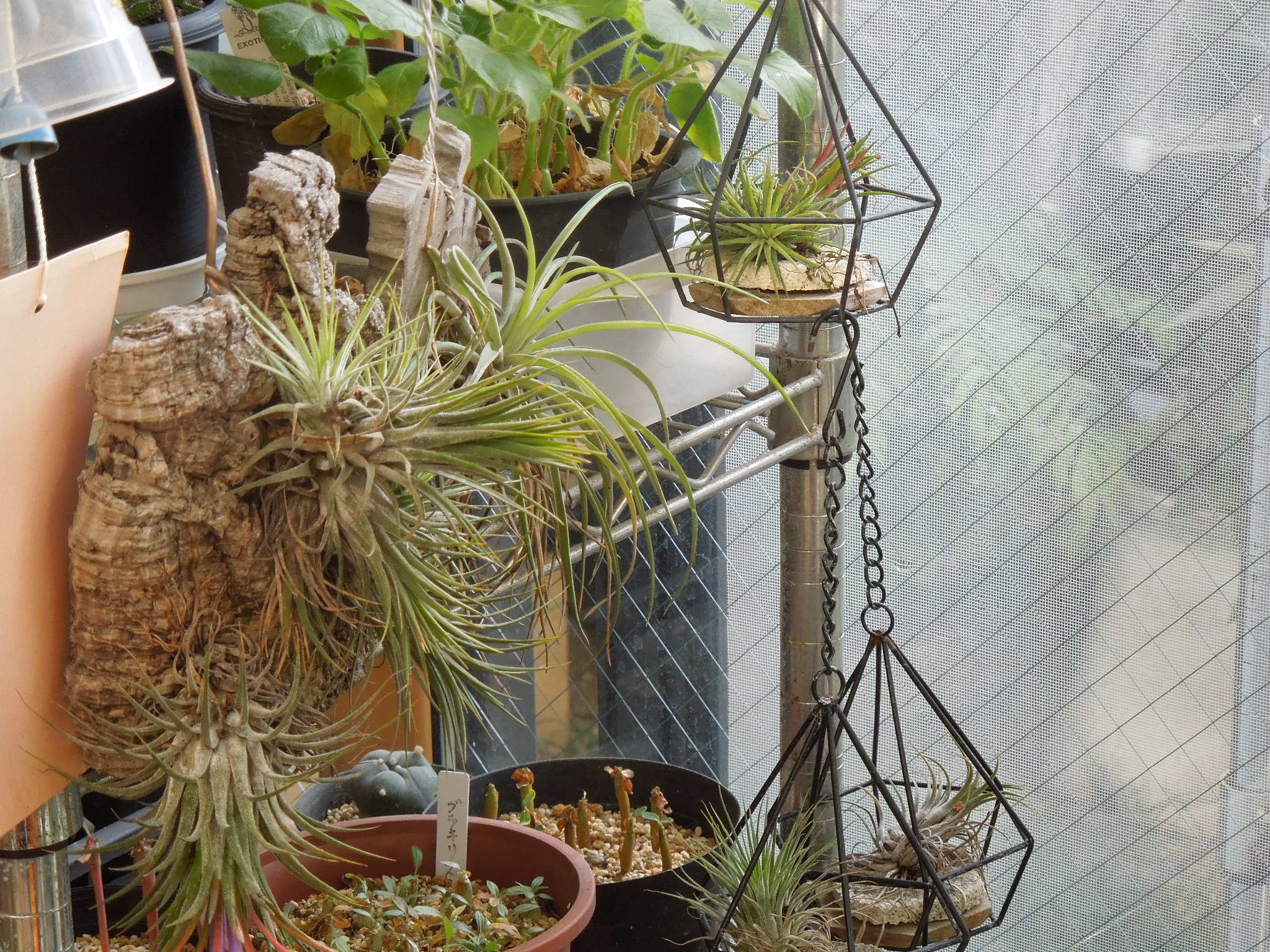 小さいチランジア(奥)の花が終わって・・・コルク板に付けたチランジアが咲き始めた。このチランジアはよく花を咲かせ、子株も増えている感じ。どこかに・・・ しっかり着床して成熟すると開花すると書かれていたが、その通りみたいだ。花が終わったチランジア。子株が少し増えた???キセログラフィカ根を出し始めてからは、生長に勢いがついた感じ。あまり変わらない、名前の分からないチランジア。生きてはいるみたいだが・・・