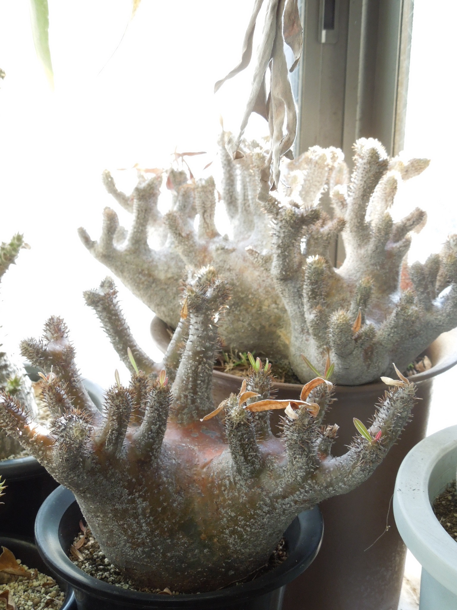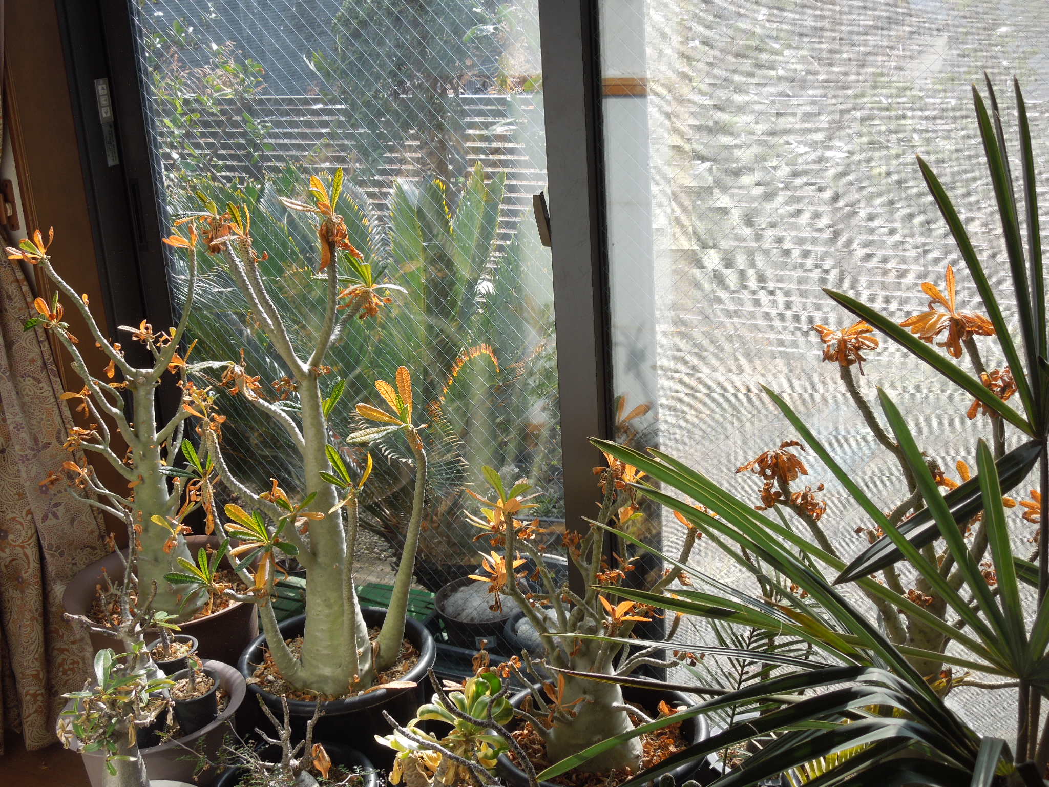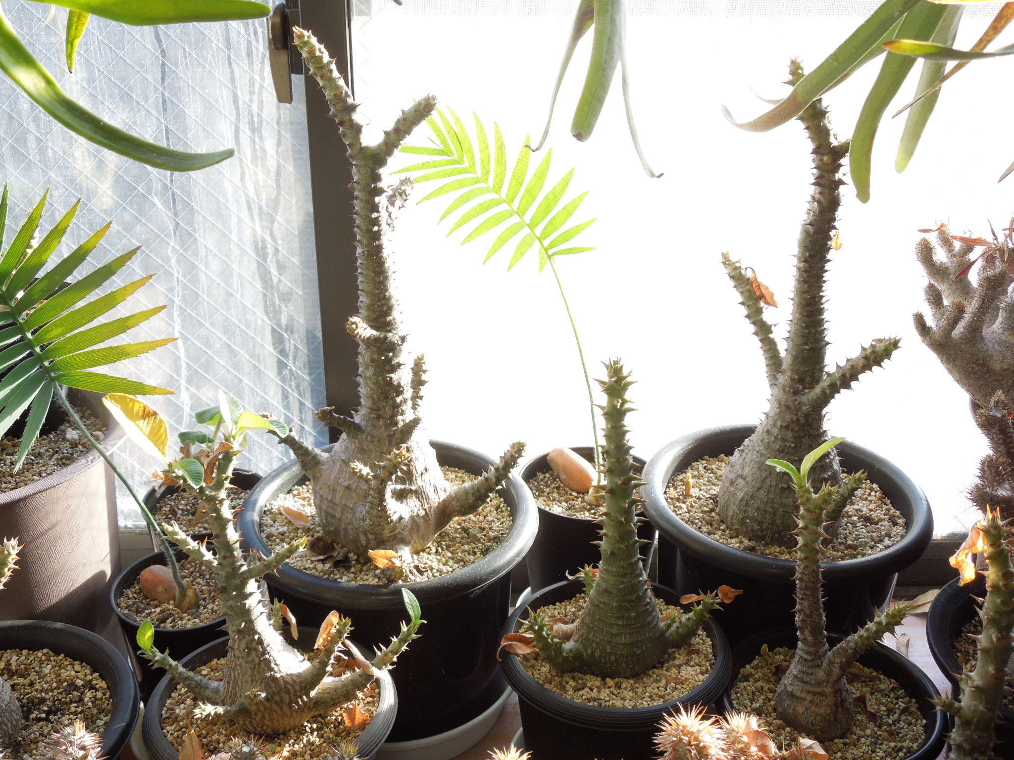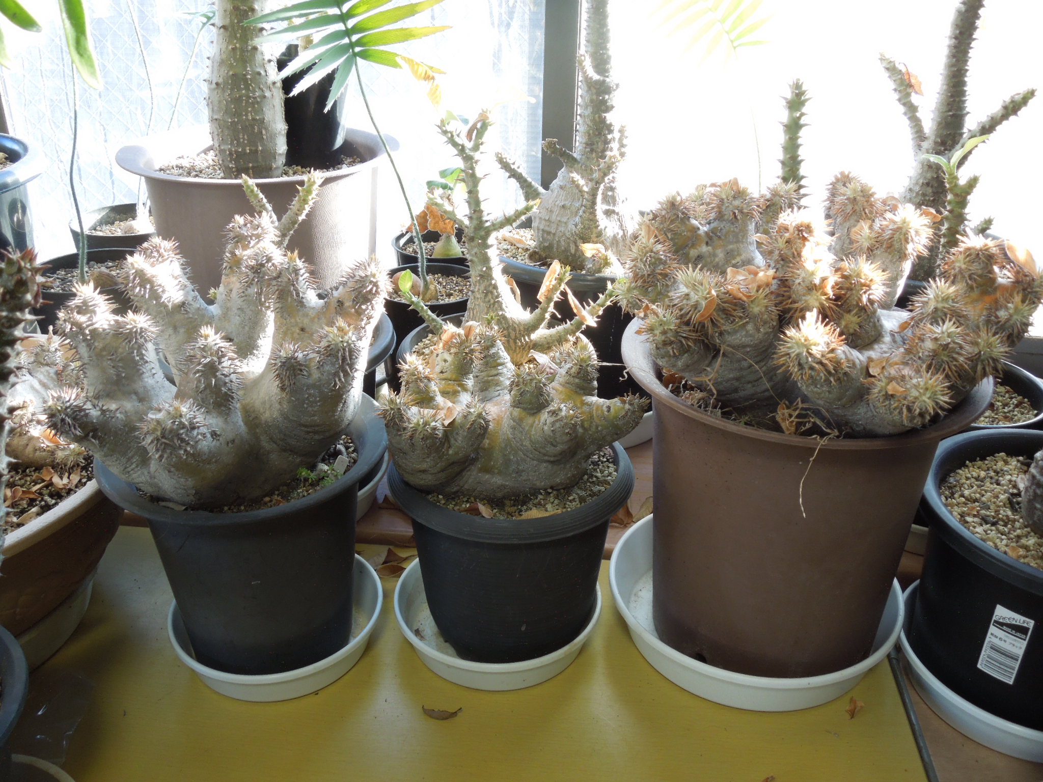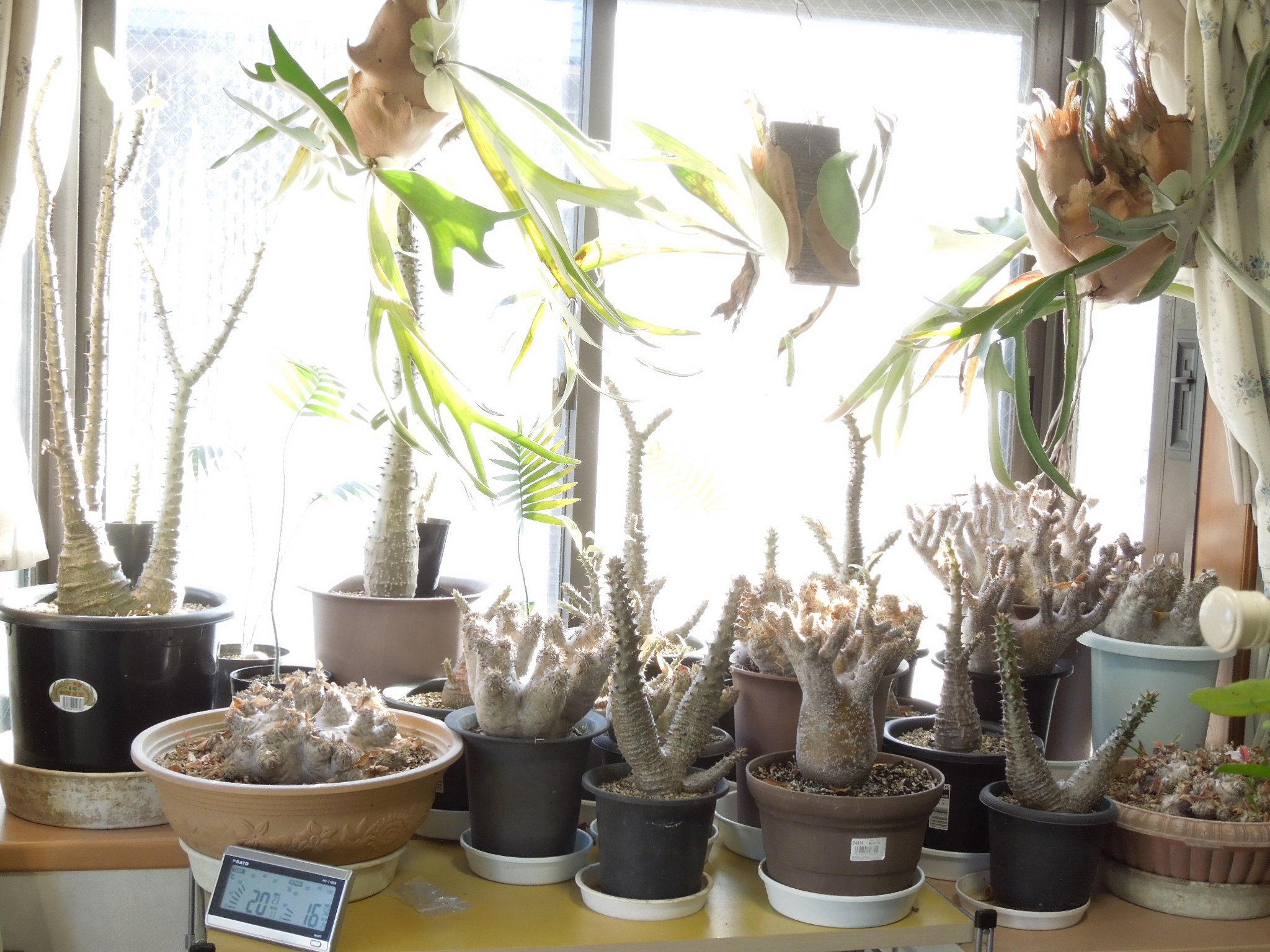 現在パキポディウムは、ほとんど出窓に置いてある。えびす笑いは、少し育てにくいようで・・・5~6株有った親株は・・・古さで1番目と2番目・・・大きさでも1番目と2番目の2株だけになってしまった。大きい方が、体力も有るのか・・・どちらも現地株。長く国内に居て環境に慣れたのか???1株は、まだ緑の葉が残り・・・もう1株は丸坊主。新芽を出し始めた。まだ寒いので、完全に乾いているようだったら・・・暖かい日を選んで、軽く水を遣る。