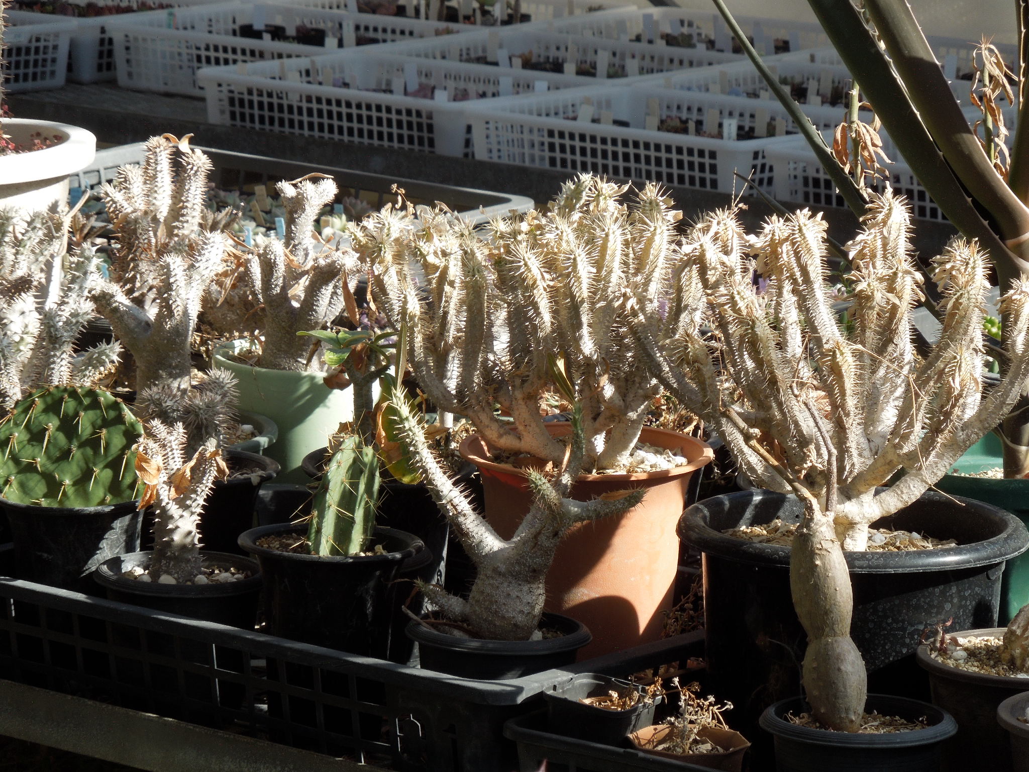 小田園芸さんのハウスに置いてあるギラウミニアナ。ほとんど葉は落ちたが・・・枝の先端に緑色の部分がだいぶ残っている。完全には休眠していない???よく見ると・・・新しい刺とか新葉みたいなものも・・・まだ、寒くなると思うが・・・どうなるか??? 2024年1月 2022年1月 2021年2月