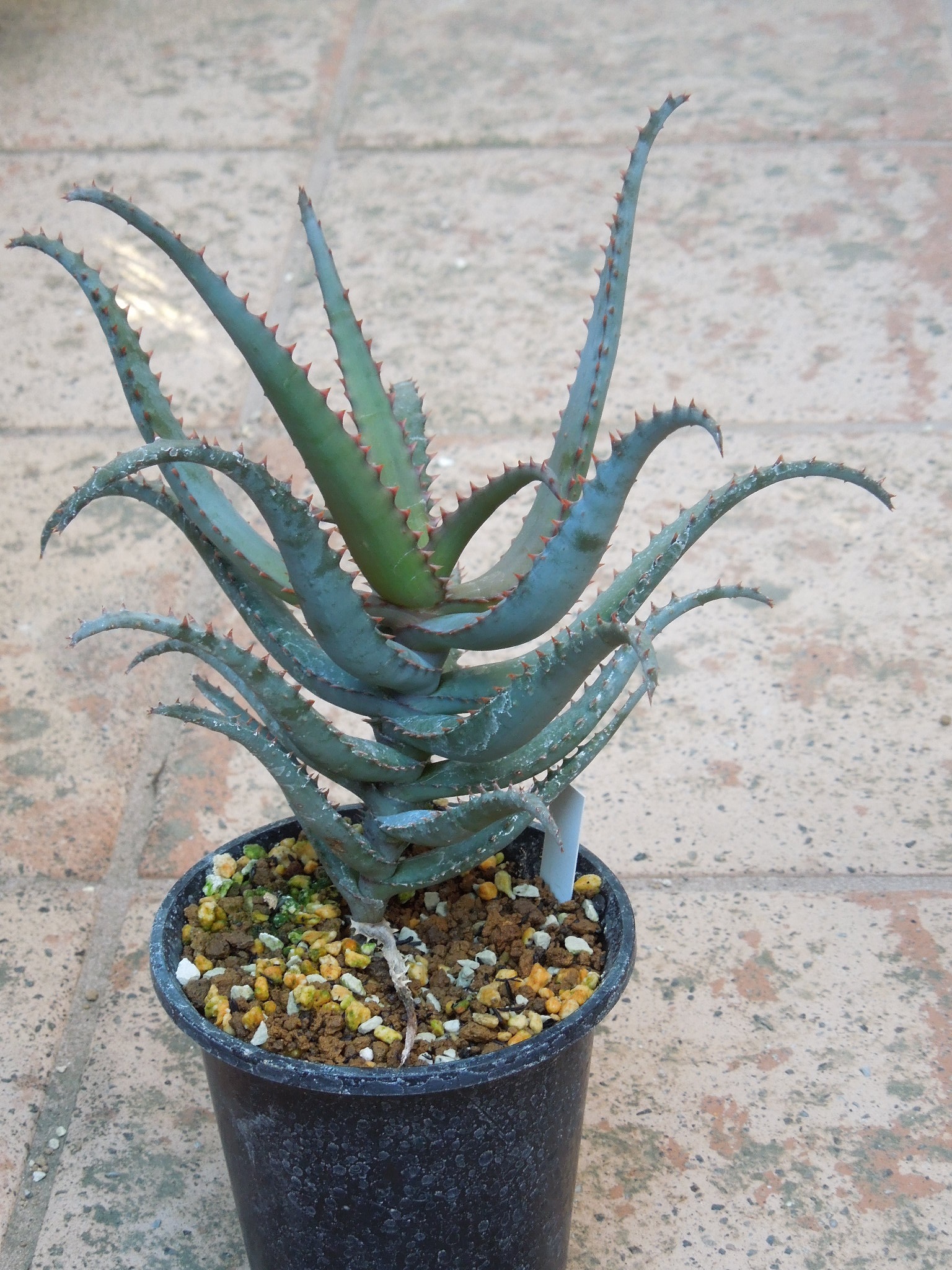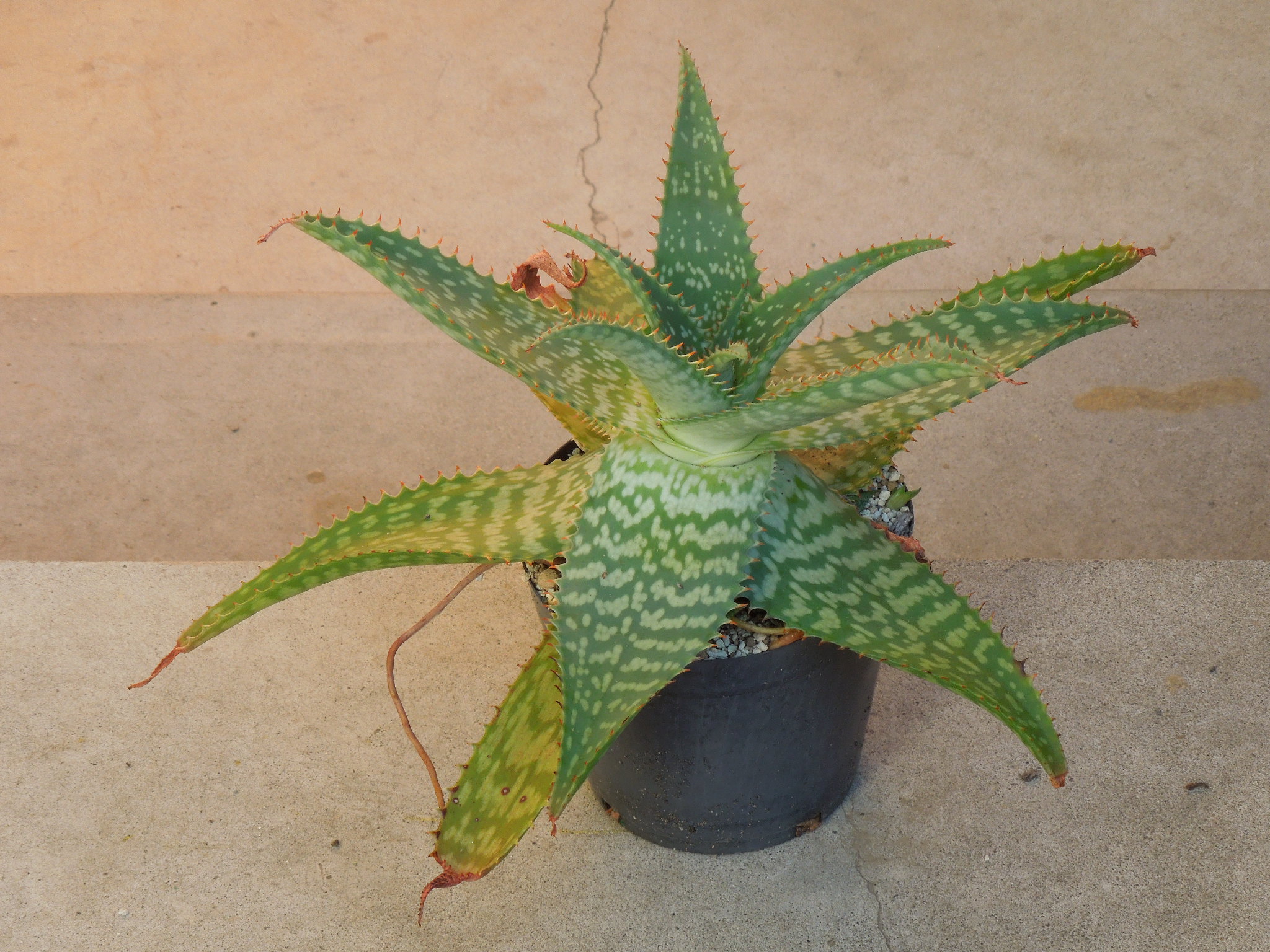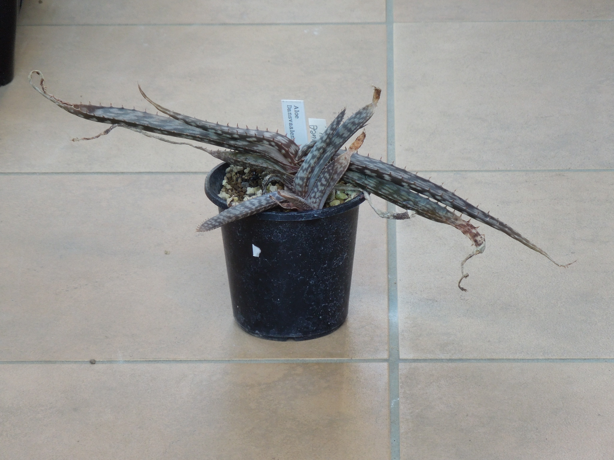 アロエ・スプラフォリーアタみたいな形だが、色違い。ちょっと気になってお持ち帰り。Aloe dansvaalensis と書かれたタグが刺さっていた。子株が2個付いていた。増え易いらしい。Aloe dansvaalensisを調べてみたが・・・該当無し。似たような名前でaloe transvaalensisがヒットした。これみたいだ。トランスバーレンシスは、ゼブリナの旧名らしい。ゼブリナはマクラータ系のアロエだとか・・・これは、葉が細いタイプらしい。本来の葉の色は緑らしく、現在の色はストレスカラーらしいので屋内の隙間に移動。しばらくは要観察。アロエもアガベ同様、いろいろ有って訳が分からない。