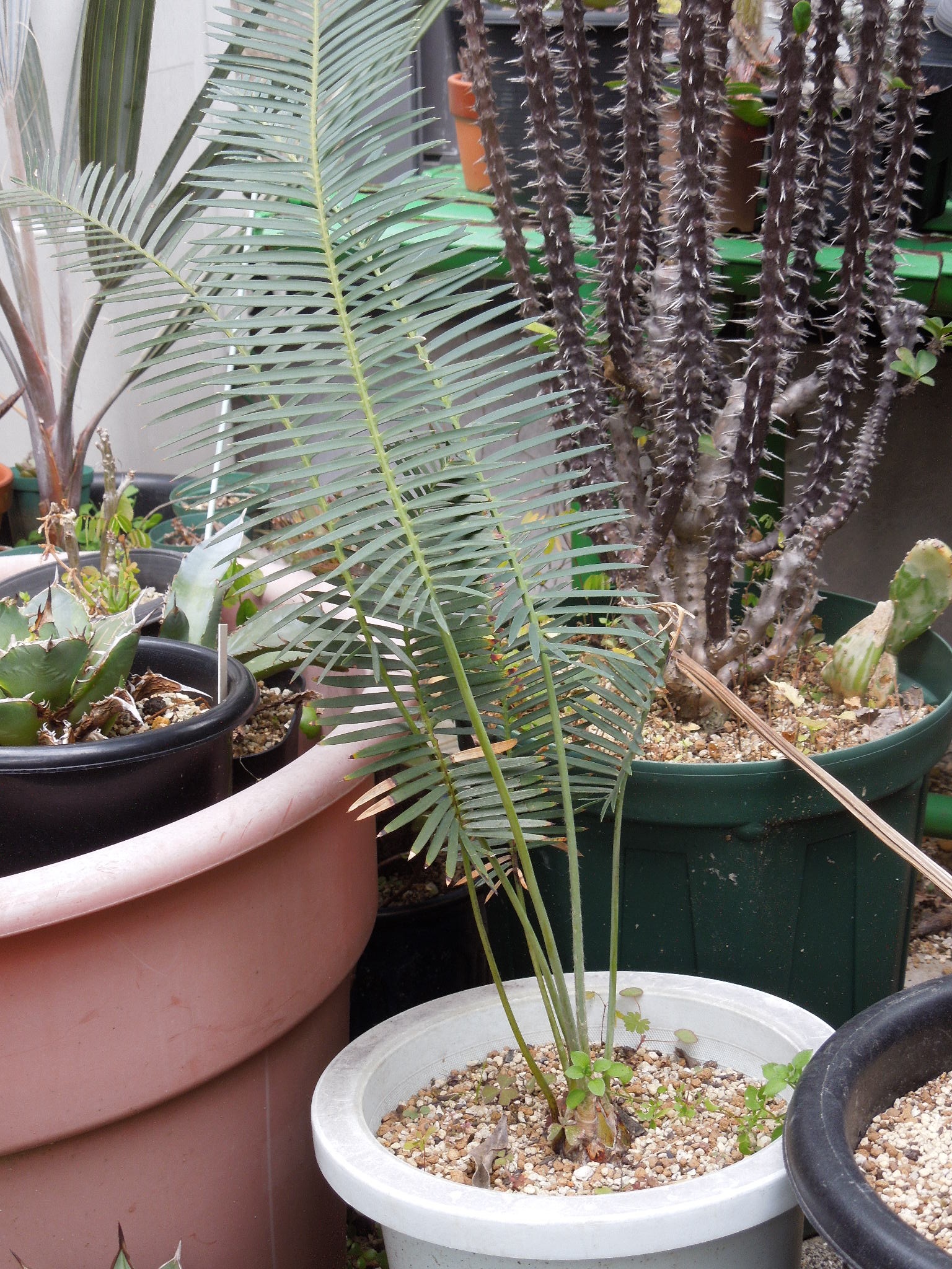 ディオーン・エデュレは強健種みたいで・・・2019年11月から小苗を6株購入したが、ダメになったのは1株だけ。1番大きくなったディオーン・エデュレ。現在は6号深鉢に植えてある。葉の数も一番多い。残りの4株。どれも、雨ざらしだが問題無さそう。幹も見えるようになってきた。大きい鉢に植え付けた方が生長が速い???2020年5月の様子はこちら。