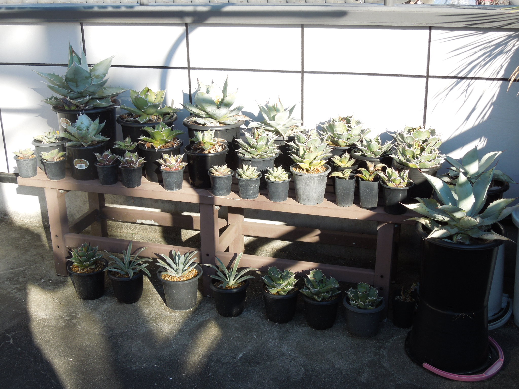 屋外越冬中のアガベ。先日のまとまった雨で、まだ用土が乾かない。物干し場の水も何回か凍ったが、今のところは問題無さそう。チタノタ・白鯨チタノタ・海王チタノタ・レッドキャットウィーズルピグマエア・ドラゴントゥースブルーウェーブマクロアカンサ錦