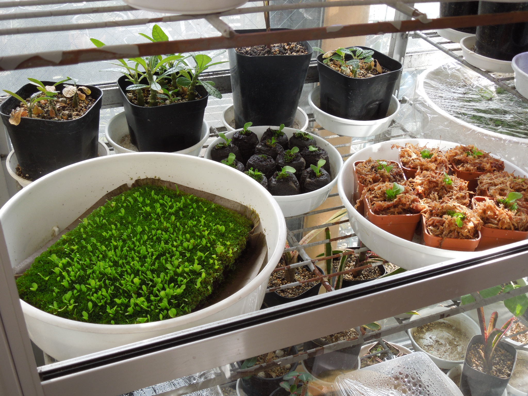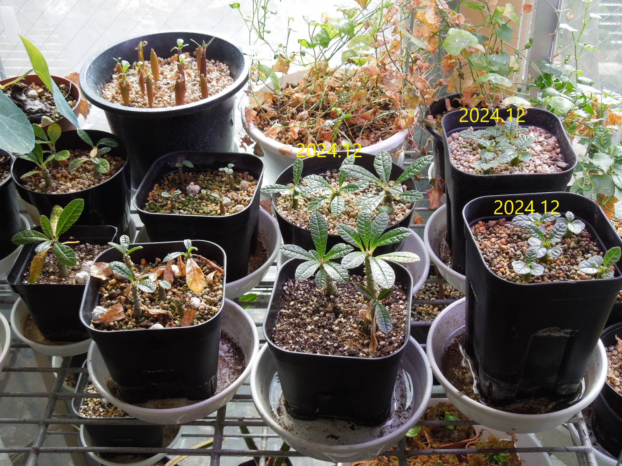 昨年初めて結実。晩春と初冬に種が採れて・・・即蒔き。現在は屋内用温室で管理中。初冬に屋内用温室で蒔いて発芽した苗の方が良く育っている感じ。温室内の温度計は・・・19℃から24℃。用土の表面が乾いて・・・受け皿も乾いたら水を満たす・・・という感じの水遣り。晩春の実生苗は・・・いくつか屋外に出して葉を落としてしまい・・・その後屋内用温室に戻した鉢も有るが・・・生長にバラつきが大きい。そこそこ育っている苗。小さく、葉も少ない苗。晩春の実生苗・・・屋内用温室、夏季の気温は最低24~5℃、最高35℃以上になっていた。水のやり方はほとんど変わらなかったと思う。あまり暑いのも良くなかった???