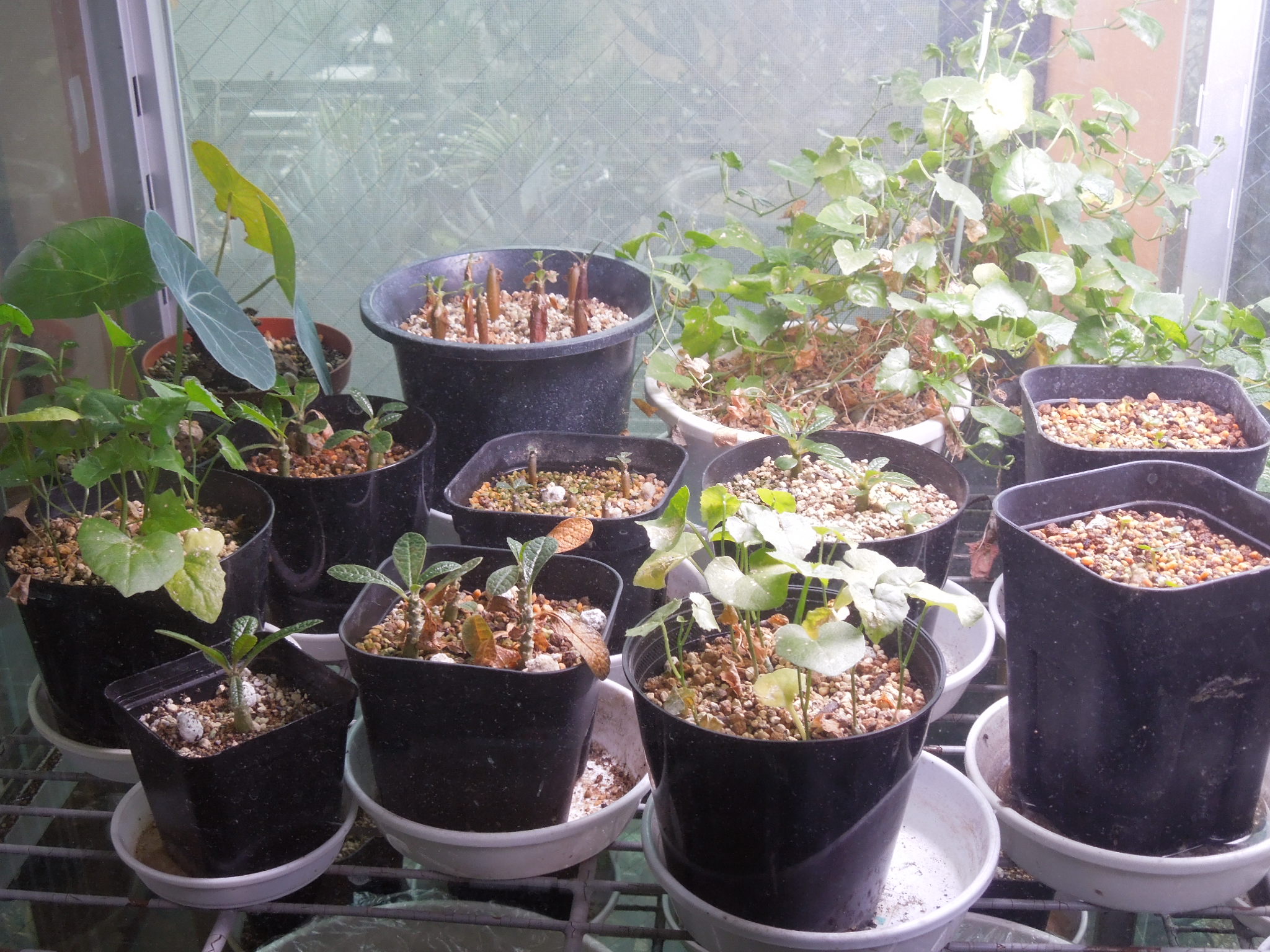 前回から約1ヶ月。屋内窓際で越冬中のドルステニアギガス。どれも紅葉して落葉中みたいだが・・・左の2株は・・・蕾が育っている。今年も実生できるか???数年前に上の画像の親株達から採った挿し木苗。親株も購入時はこのくらいの大きさだった。幹が太るか、と思って・・・主幹を切った挿し木苗。枝は出て伸びているが、太り方はあまり変わらない。これからか???