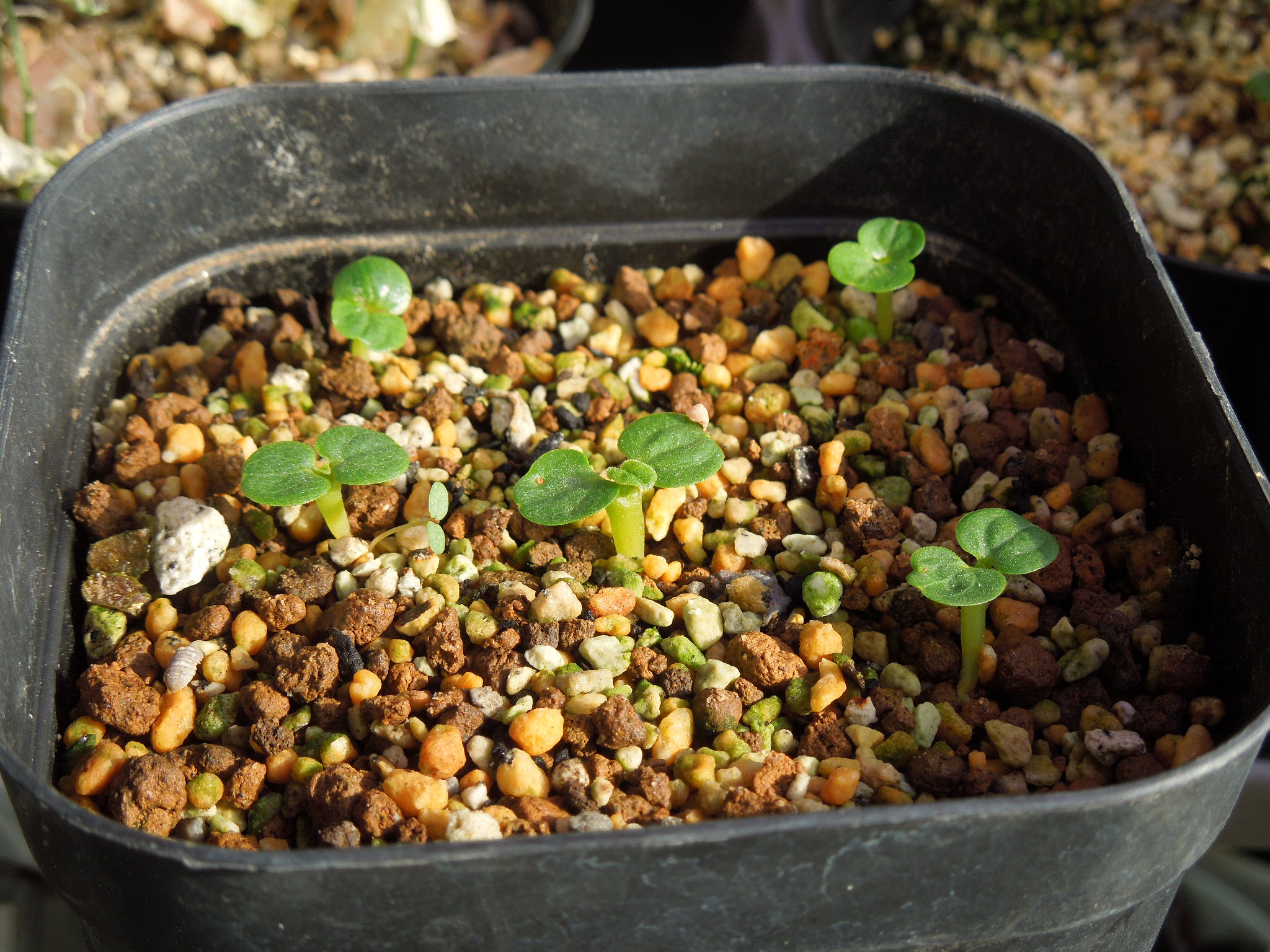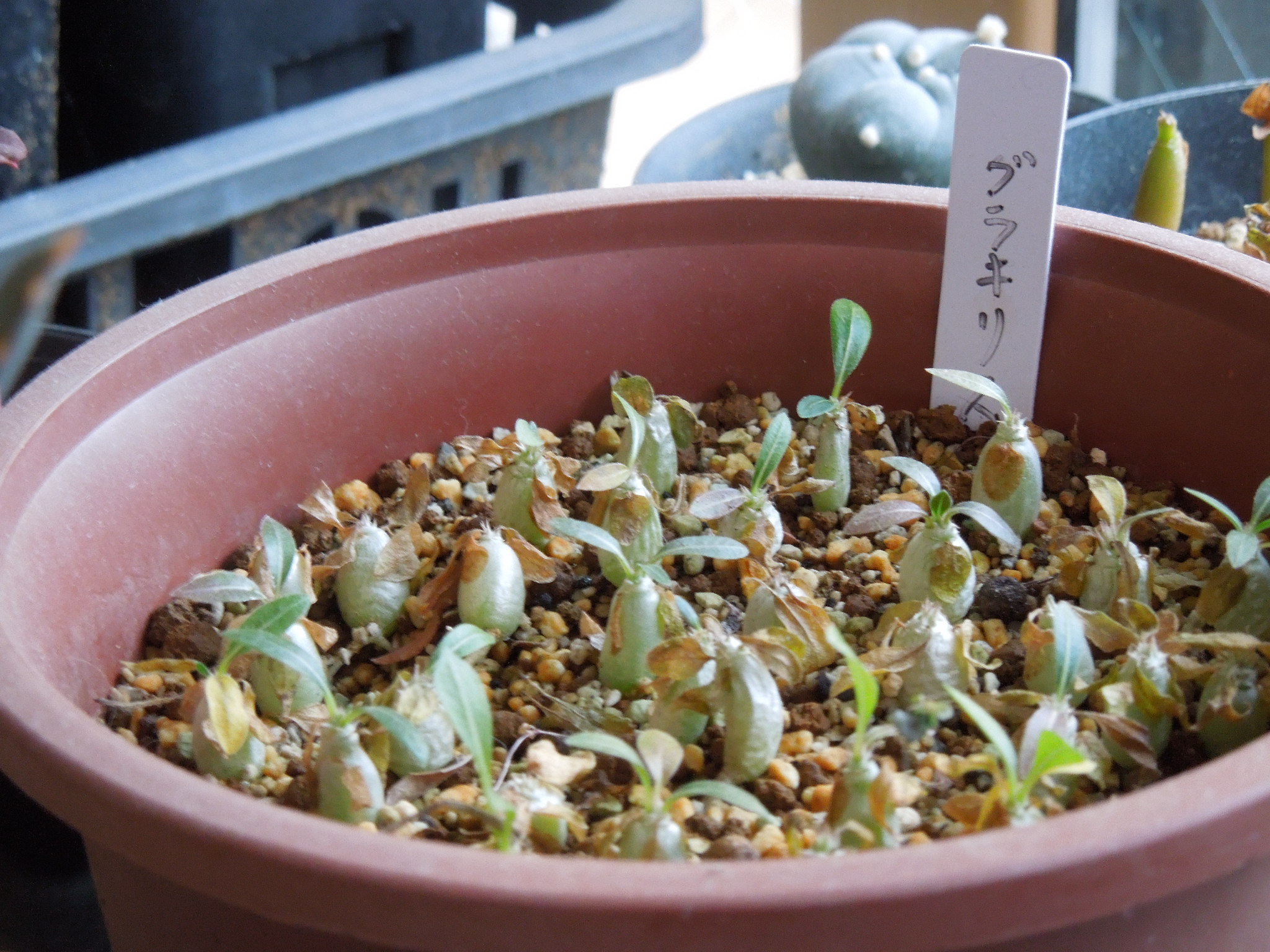 11月末から現在までにドルステニア・ギガス、イベルビレア・テヌイセクタ、ウンカリーナ・ルーズリアナを蒔いてみた。どれも親株は私が育てているもの。屋内用温室に置いて・・・温度は18~24℃くらい。ドルステニア・ギガスは11月から、3個(3個発芽)、2個(発芽無し)、15個・・・と、初冬に採れた種を3回蒔いた。最後に蒔いた15個は現在9個発芽。3個6個最高気温が上がらなくなった分だけ、発芽日数が掛かった感じ。イベルビレア・テヌイセクタ蒔き忘れていた種を発見、15~6個バラ蒔いた。ウンカリーナ・ルーズリアナこれも、15~6個蒔いたが・・・発芽には、もっと温度(25℃以上???)が必要な感じ。雑草だけしか出てこない。
