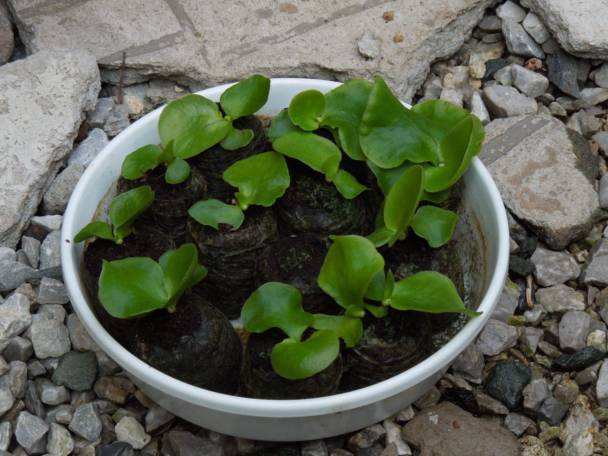 だいぶ暖かくなってきたので、過密気味な実生苗を植え替えることにした。葉がぶつかり合って、幹があっちを向いたりこっちを向いたり。枯れ葉を落として・・・鉢から抜いたらこんな感じ。全部で8本。大小、すごい差が有った。大きめの苗は・・・1本ずつ植え付け。小さい苗は、3本まとめて元の鉢に植え付け。元の屋内用温室に戻して、様子見。どうなるか・・・