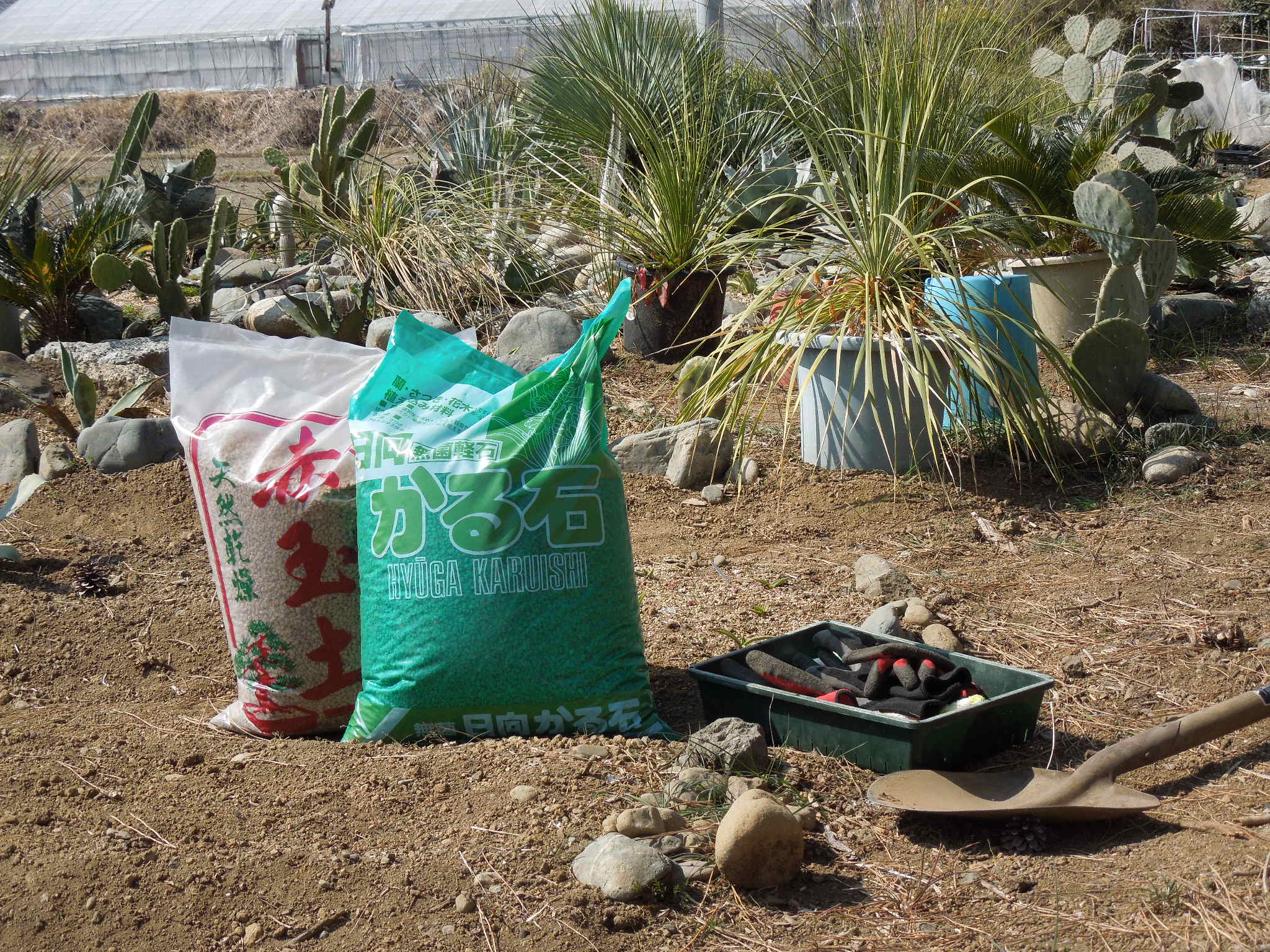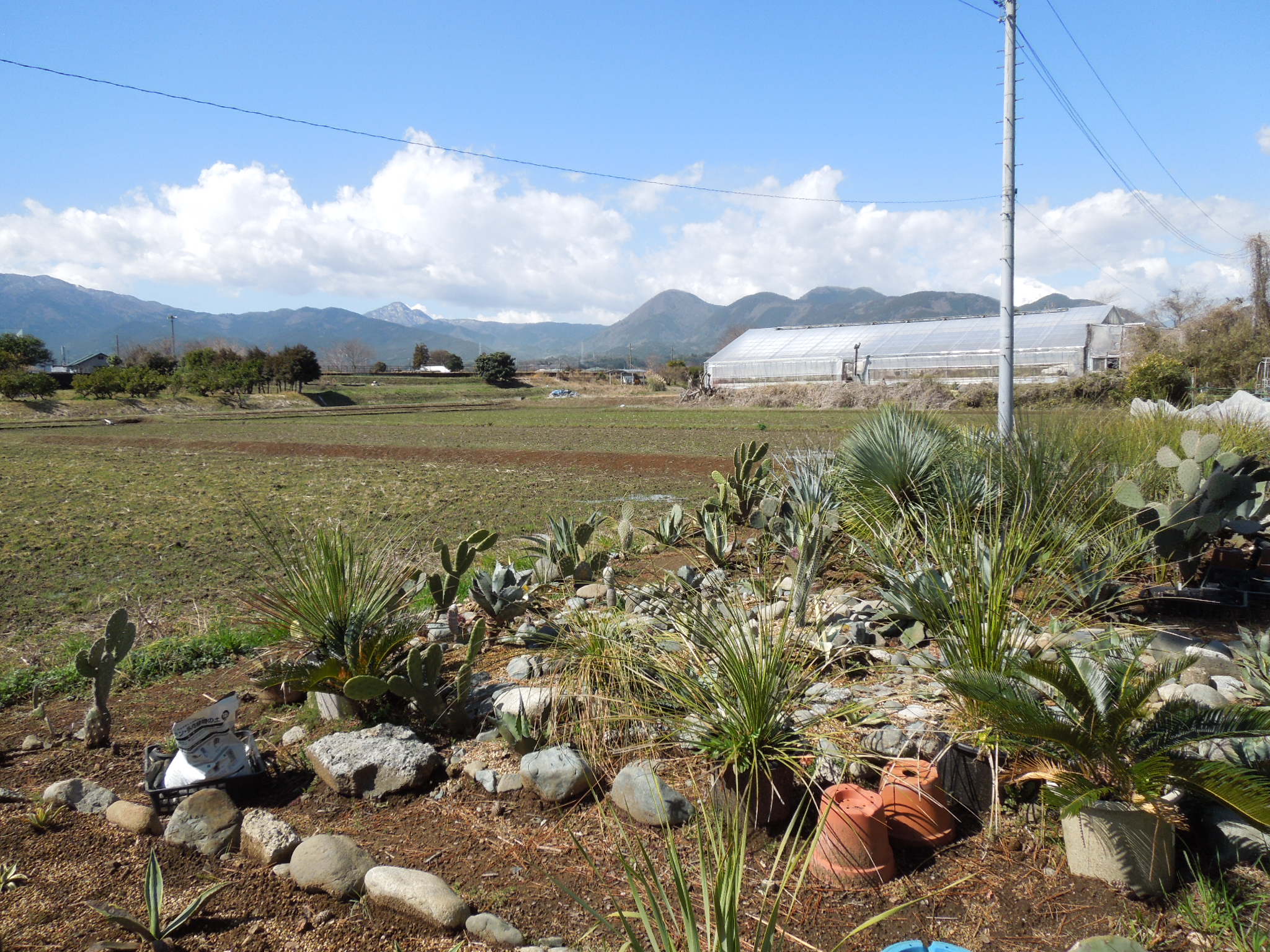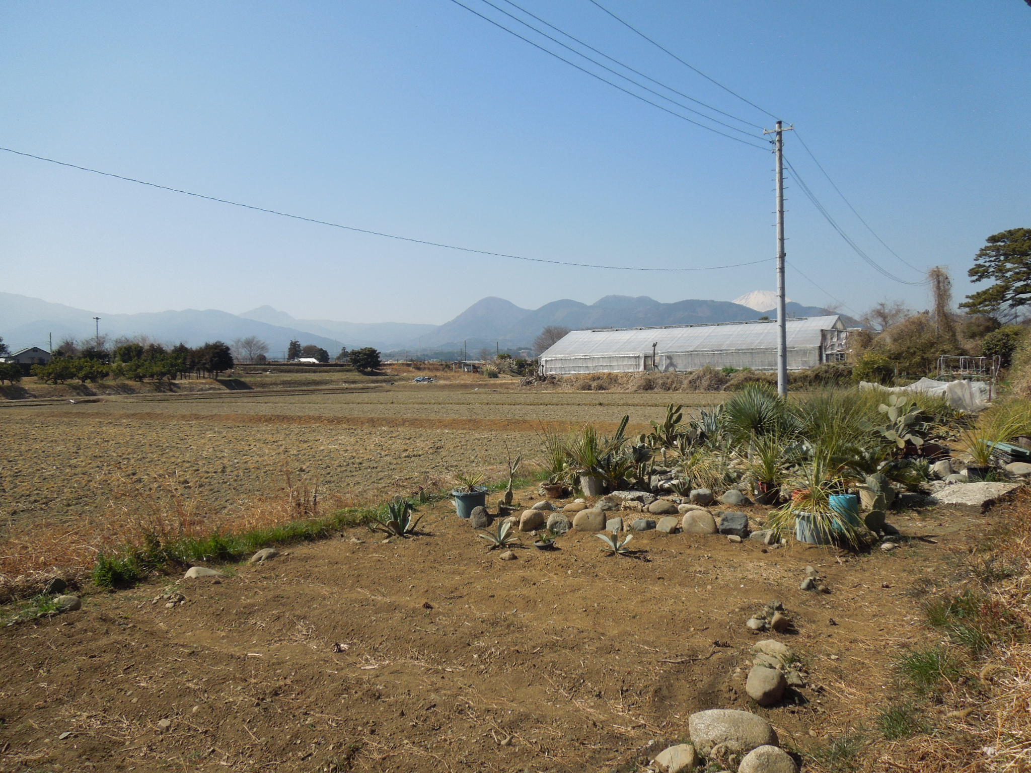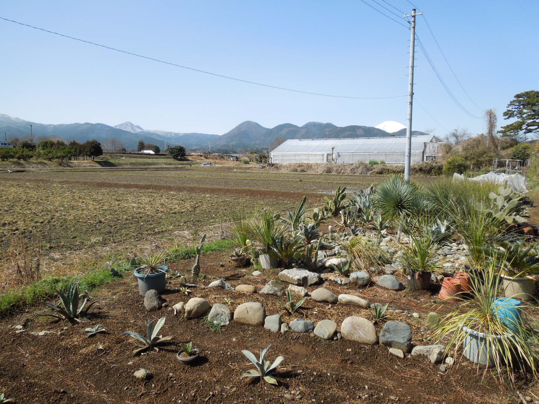ハウスの中は暑いくらい。小田園芸グループの若手の方々が、屋根の水アカ掃除をしてくれていた。ありがとうございます。箱根方面には、まだ雪が残っているが・・・だいぶ暖かくなって、少し日が陰っても上着は要らないくらい。先日、植え付けた子株も大丈夫そう。今日も植え付けのために、用土を混ぜ込んできた。次回は、自宅の鉢植えアガベを植え付ける予定。