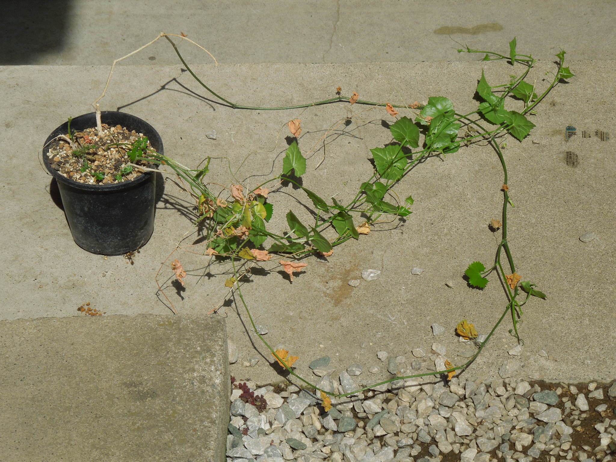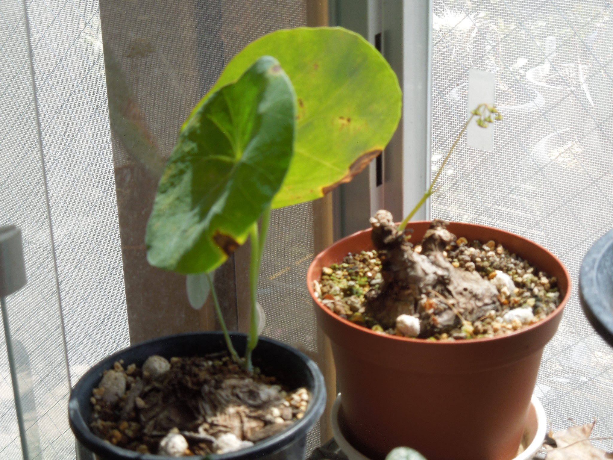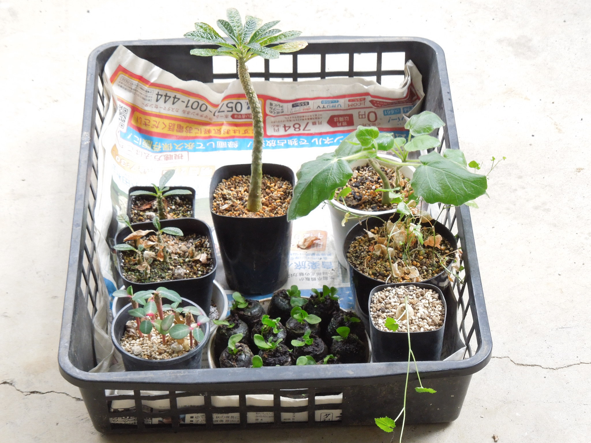 昨年初めて採れた種を実生した苗。屋内では休眠することなく、蔓がだいぶ伸びた。長い蔓が2本???ディプシス・デカリーの大鉢に置いてあったので・・・鉢底からは根も出ている。5株全員生きていた!鉢を切らないと取り出せなかった。塊根部の大きさにずいぶん差が有る。1株ずつ植え付けて・・・ディプシス・デカリーの鉢の上に戻した。