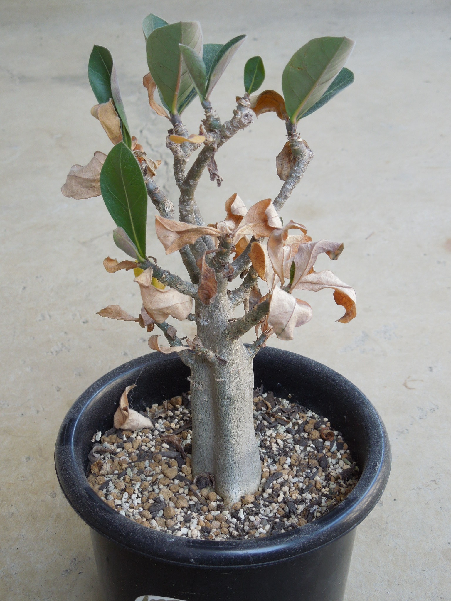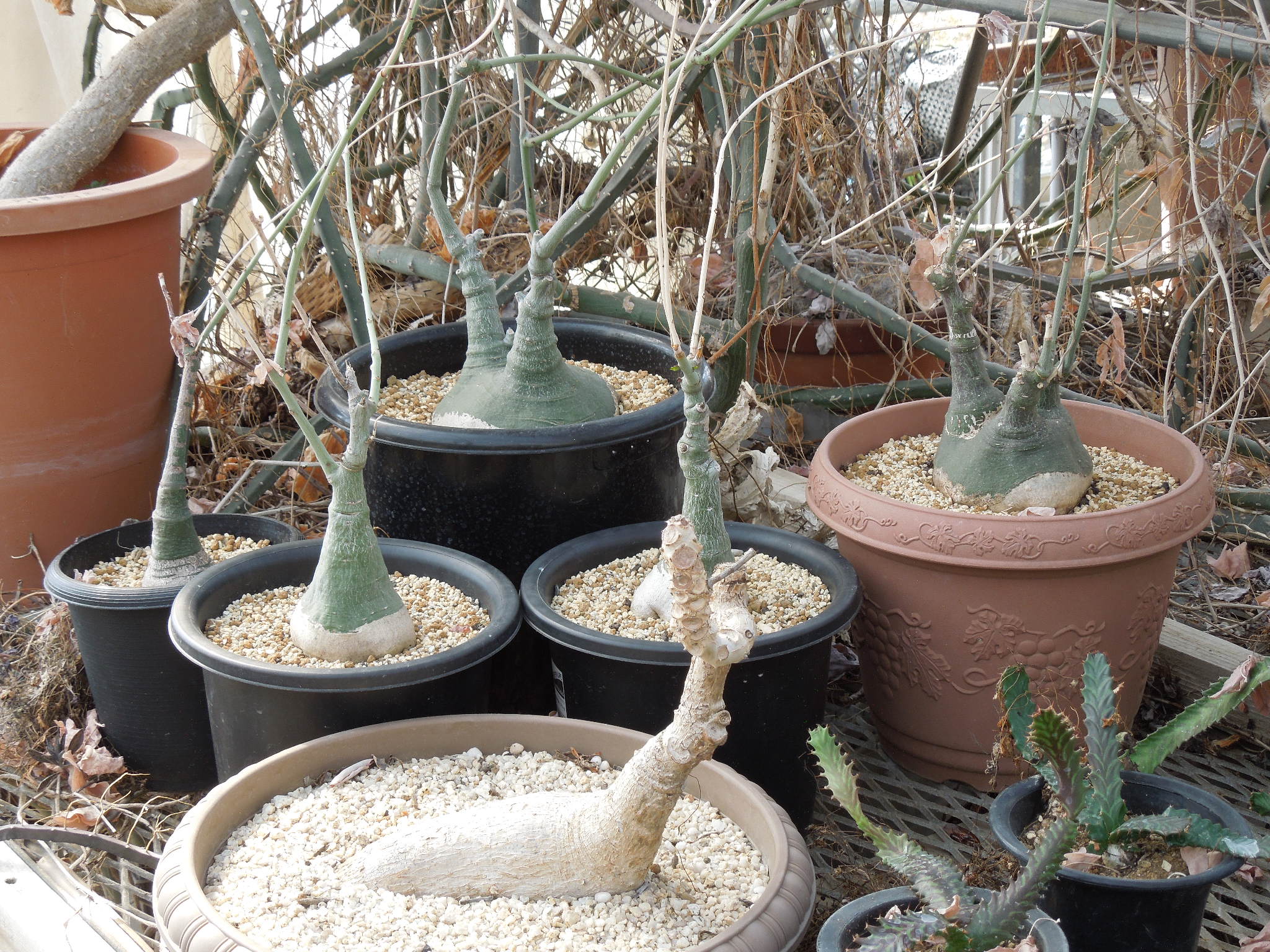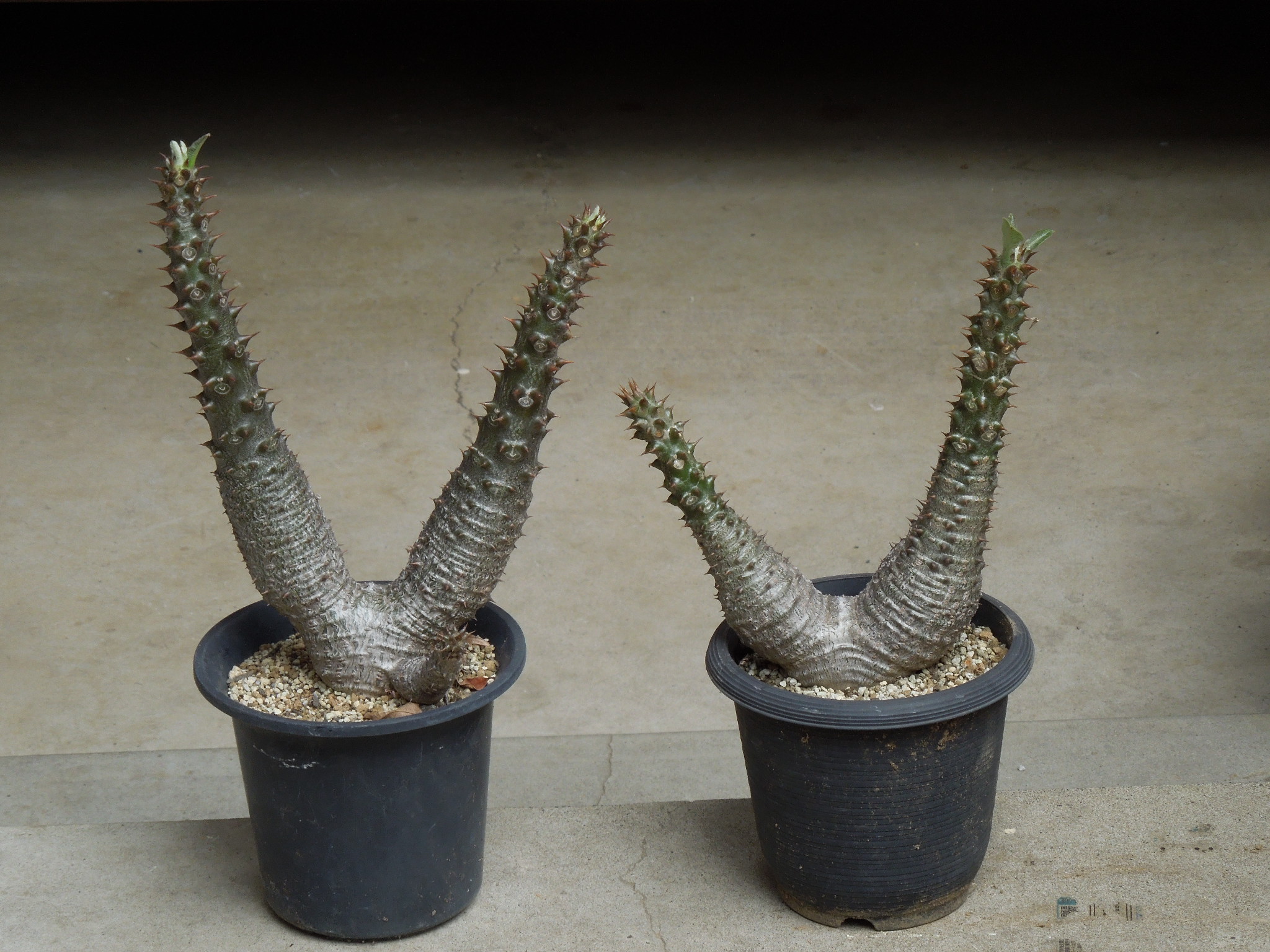 10年くらい前にCSSA(cactus & succulent society of america)から購入した種子からの実生苗。新種ということで一人5粒限定だった種子。2粒発芽したが、生き残っているのは1株だけ。今年は調子が悪そうで・・・少し葉を残したまま、幹が凹んできた。今までで、初めてだ。抜いて、根を確認。根が少ない???枯死しているような根も有りそうだ・・・枯れ葉だけ落として、元の鉢に植え付け。もう少し暖かくなったら、タップリ水を遣ってみようか・・・大きくなればこんな感じになるのか???これは、バオバオフォームという名前で購入した苗。