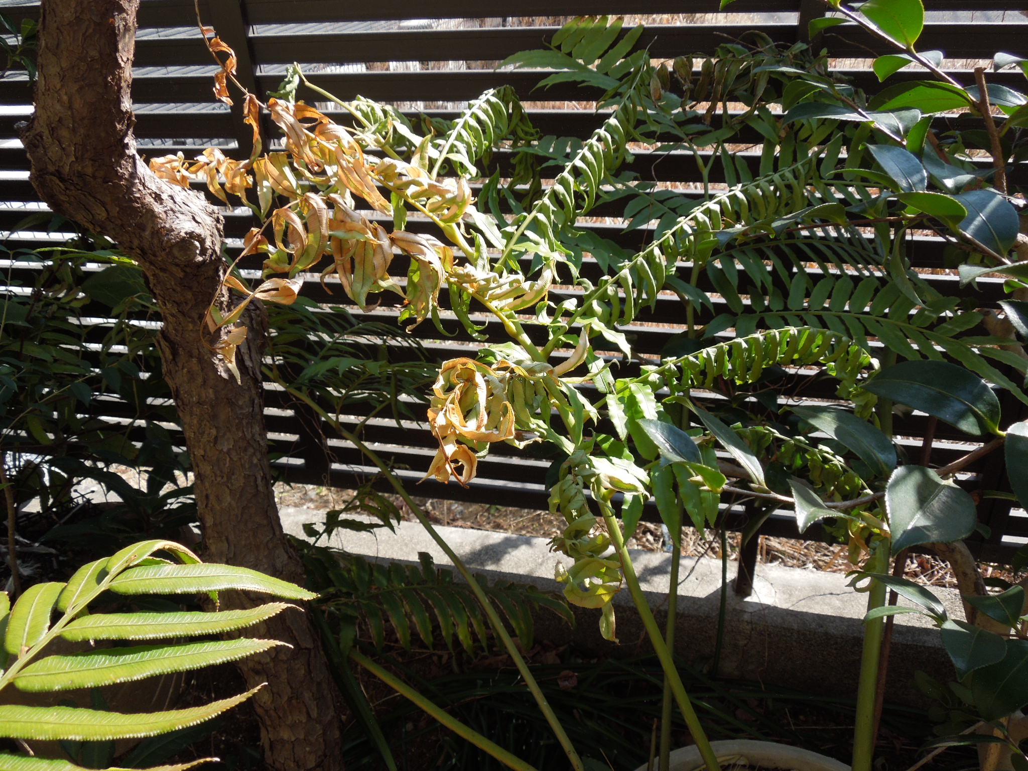 昨冬も屋外で越したオオタニワタリ。今冬も頑張っているみたいだ。クワズイモ数年前に100均で買った時は12~2cmだった。現在6号鉢ダメになったかと思っていた木立性シダ。ヒリュウシダ、ヒロハノコギリシダ、クロヘゴ・・・など鉢植えにしていたが、タグがなくなって何だか分からない。寒さに耐えているみたいなので、ヒロハノコギリシダか???寒さに強いはずのオシダはダメになっている。我が家最強の木立性シダは、ディクソニア・アンタルクティカ。地植えで育てたいシダだ。