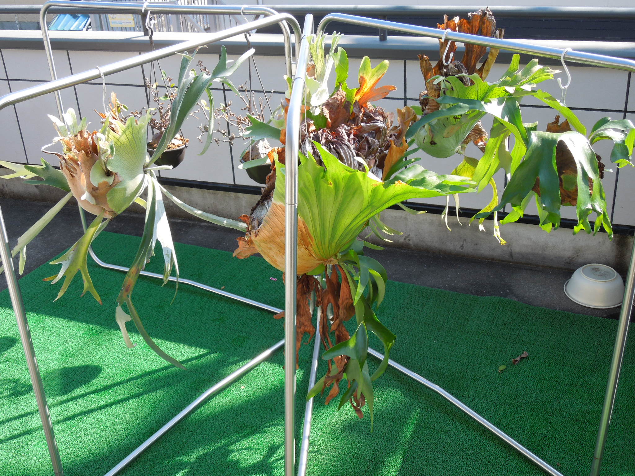 天気が良く風の無いときに・・・物干し場でビカクシダに水遣り。コロナリウム~我が家で一番大きいビカクシダ。ビーチー”シルバーフロンド”~胞子葉が2~3枚の苗だったが、5年経ったらこんな感じ。ホーンズサプライズ~マダガスカリエンセとアルシコルネの交配種。1株しかないが、しっかり育っている。環境が合った???強健???ビーチー”レモイネイ”~シルバーフロンドと同じ、ビーチーの白銀タイプ。ホルタミー~これも、コロナリウム同様の大型種らしいが・・・ まだまだ、小さい。アリ植物ヒドノフィツム・フォルミカルム~今冬は調子が悪そうで、だいぶ葉が落ちてしまった。 枯れている枝も有る。