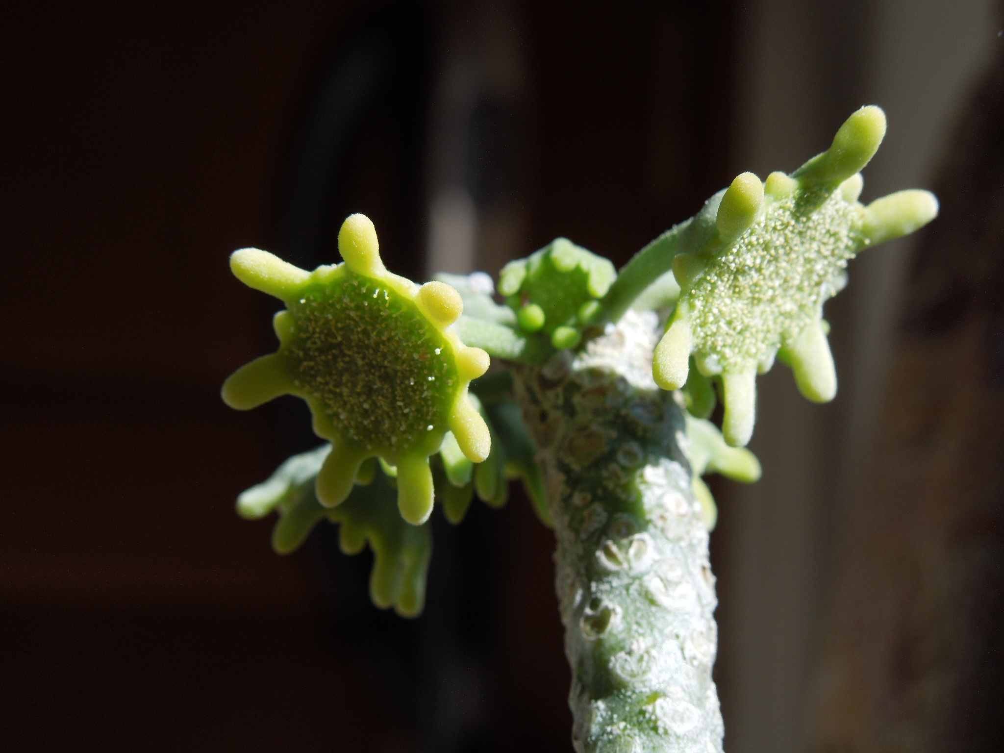 晩秋から屋内窓際で管理中だったパキポディウムの実生苗。だいぶ動き始めてきた。エブレネウムとイノピナツムは5~6年生エブレネウム初めて花茎が伸びてきた。まん丸の形が気に入って残してあったエブレネウム。どちらも無事に活動開始。イノピナツム小さい内から分枝したイノピナツムえびす笑い10年目くらいか???花茎が上がってきた。こちらは、5~6年か???いくつかは、まだ休眠中。腐りもなさそうで、張りもあるので・・・そろそろ動き始めると思うが・・・