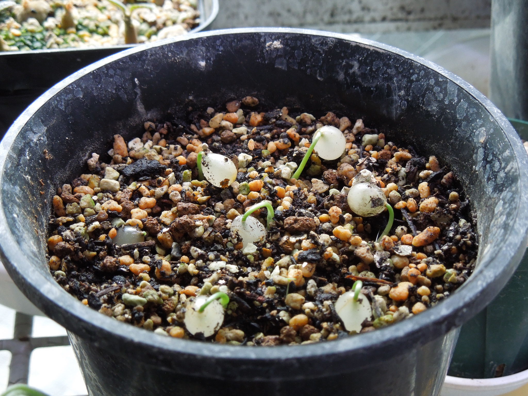 ハエマンサス・アルビフロスの種子。小田園芸さんからの頂き物。いつの間にか発芽していた。2週間少々掛かったか???(屋内用温室、20~25℃くらいで管理。)こんな感じの発芽。どの発芽タイプか???”種子と芽生え”、”remote germination”我が家の開花株結実した???耐寒性も強いみたいで・・・屋外雨ざらしでも無事に越冬???球根は3cmくらい。