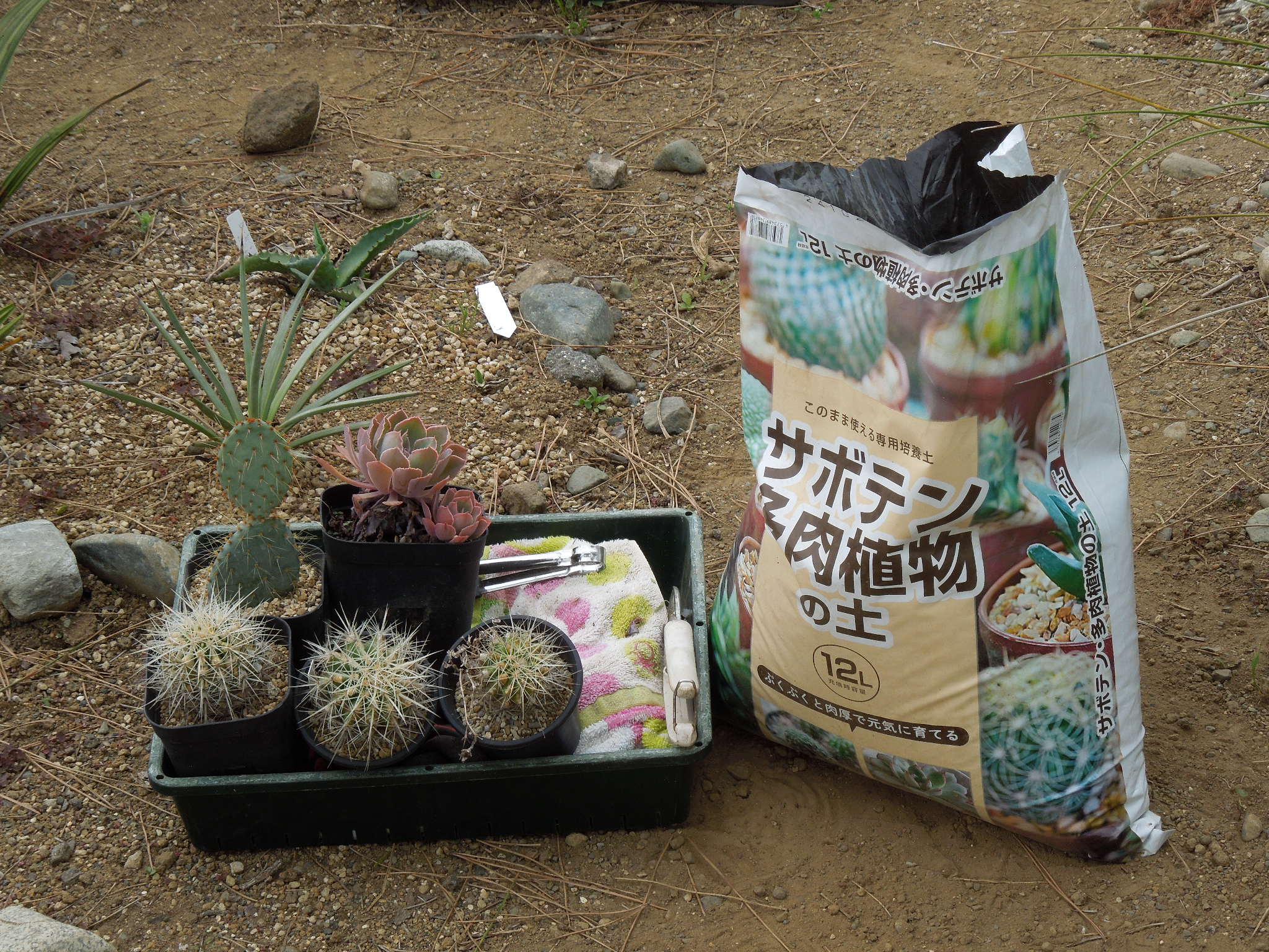 今回は、自宅軒下に何年も放置されていたキンシャチの実生苗など・・・。日差しは無かったが、動くと暑かった。畑は、相変わらず草だらけ。隙間に植え付け。キンシャチこれは、サボテンクラブ例会で購入した白刺キンシャチだったか???エケベリア・アフターグロー大きくなるらしいが、地植えでどこまで育つか???また買ってしまった、サンタリタ。大きくならないものならば、もう少し植えられるか・・・