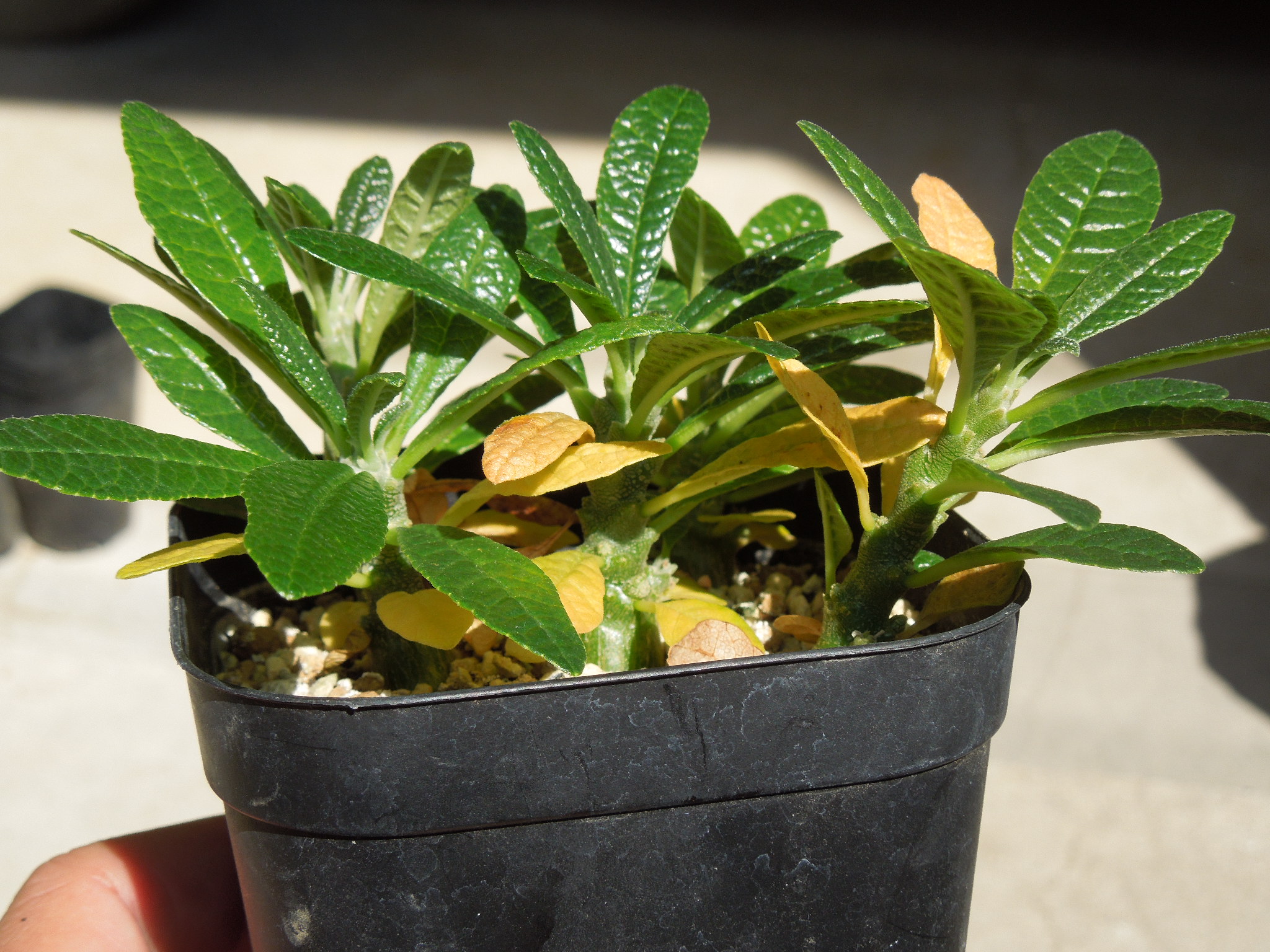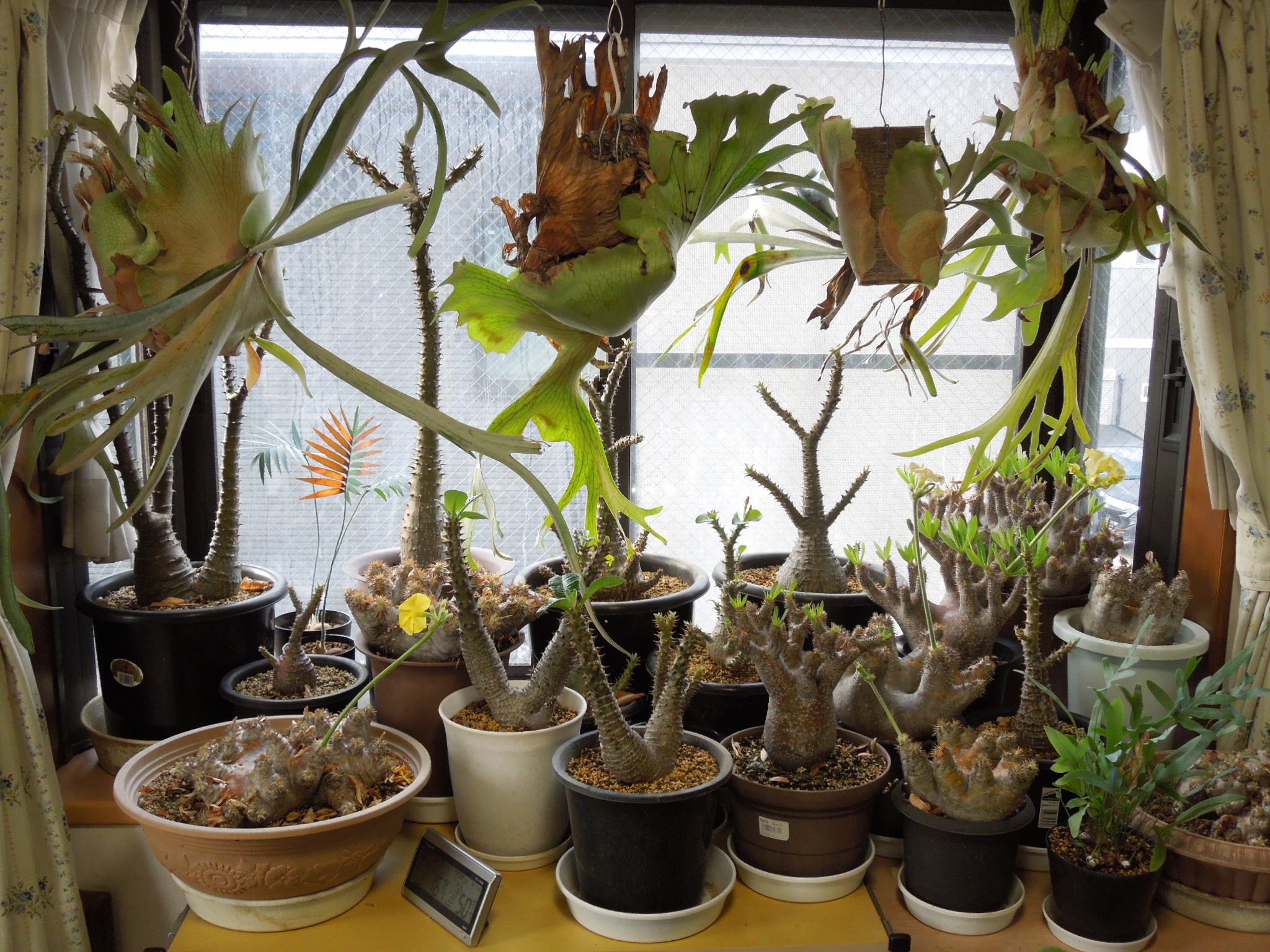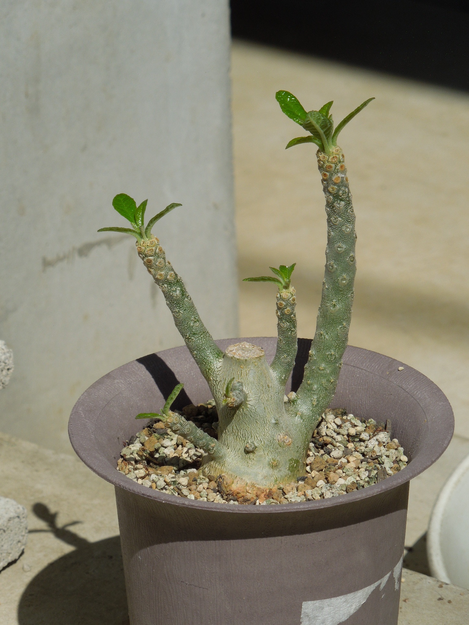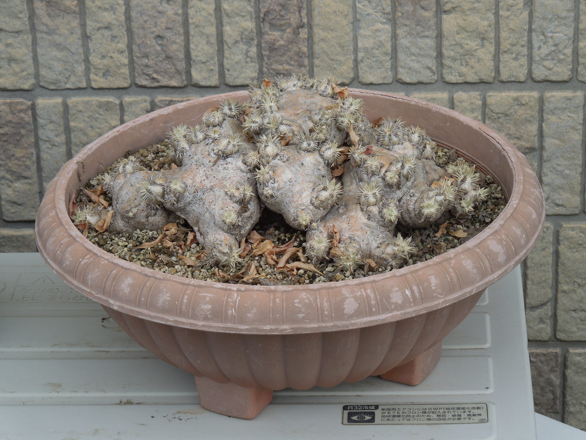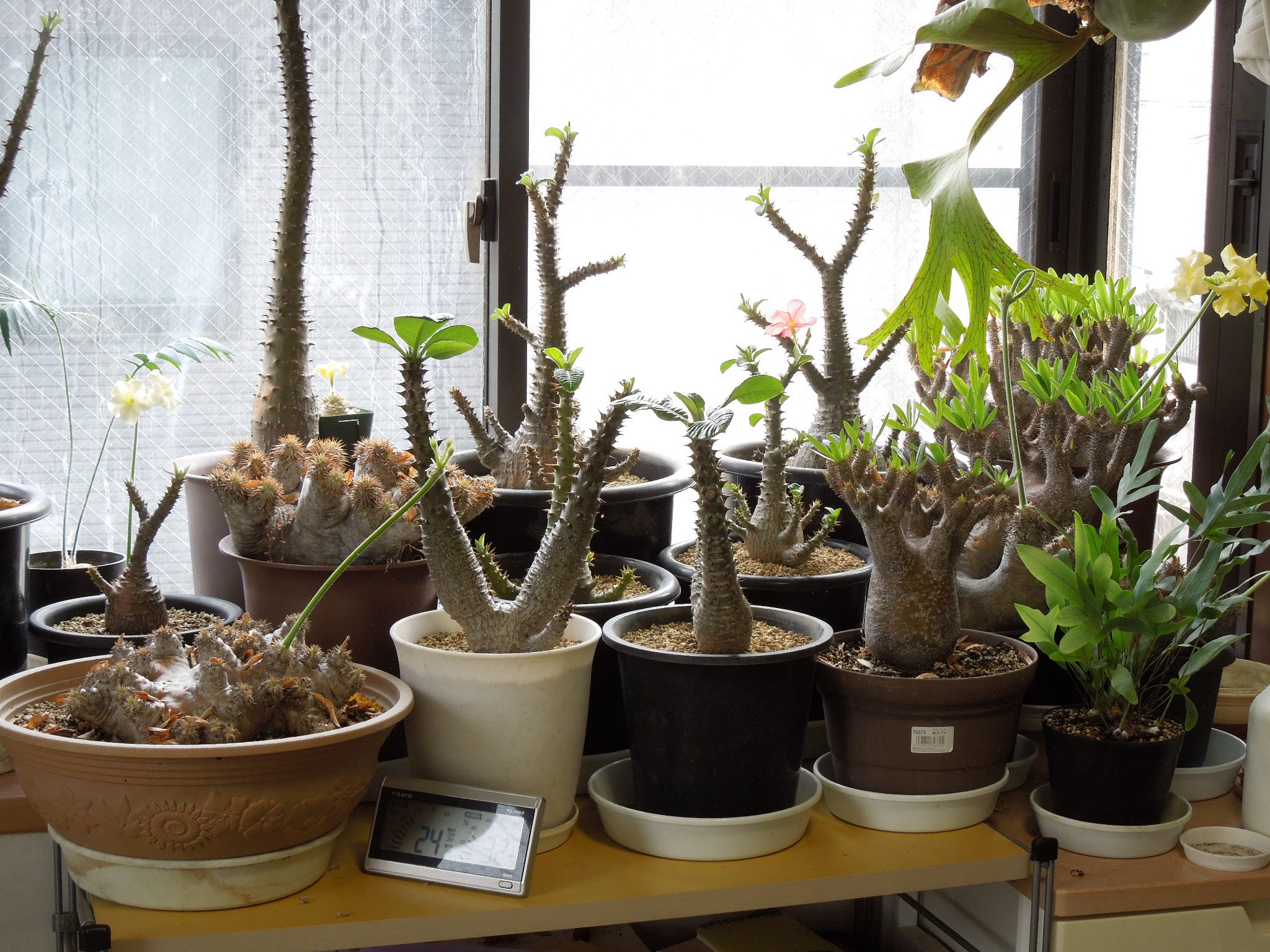 ほとんどのパキポディウムが、葉を出したり花を咲かせたりしているのに動きがなかったえびす笑い。10年少々前にサボオクさんから購入した株。他に15~6cmの現地株が2つ有ったが、いつの間にかダメになってしまった。小さい個体は、環境に適応出来る前にダメになってしまう?現地株は、少しでも大きい方が強いか???現在残っているのはこれと、出窓に置いてあるもう一回り大きい苗で、現在開花中。やっと成長点が緑になってきた。とりあえずは・・・生きていたみたいで一安心。