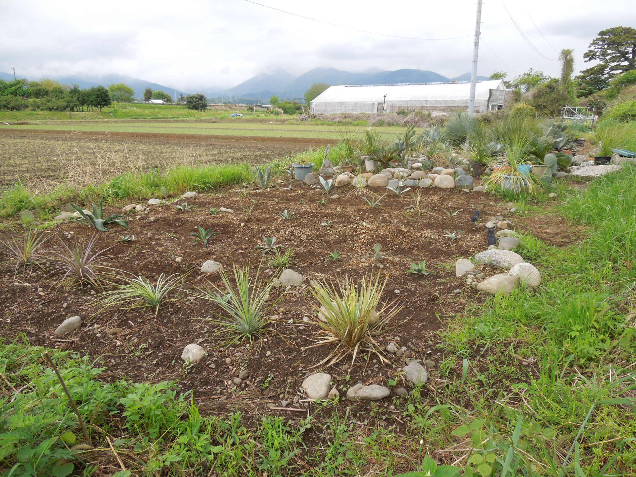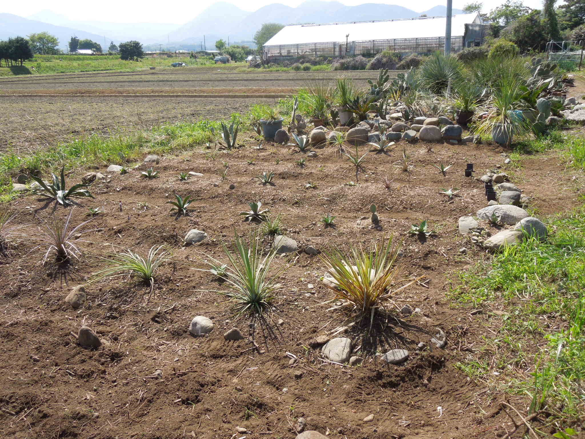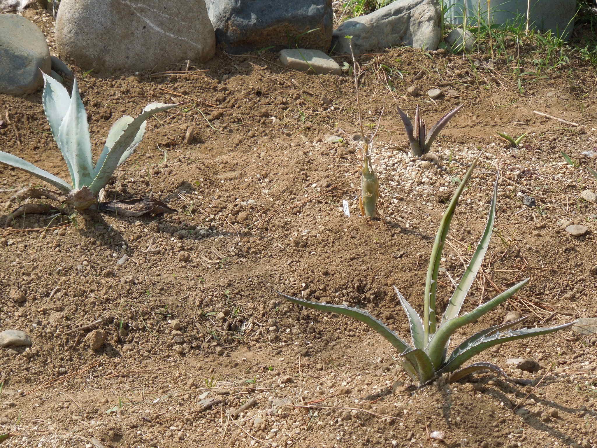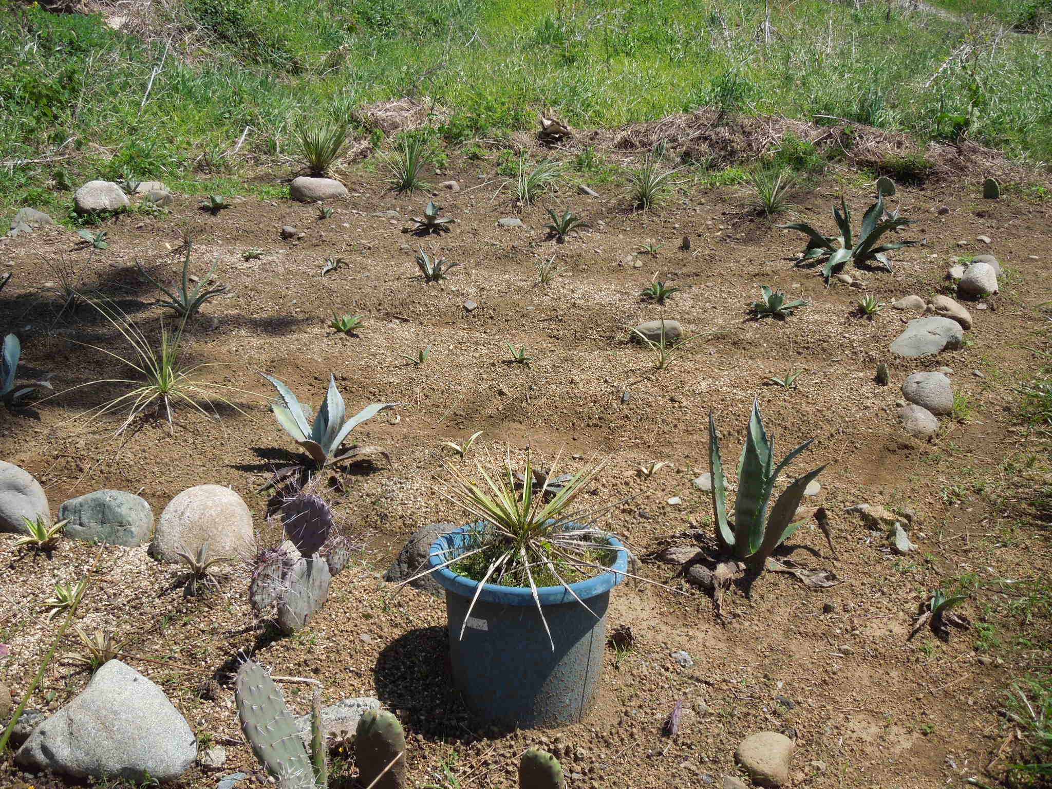 今年も、いくつかアガベを地植えにした。自宅で雨ざらし越冬した小苗とか、外した子株とか・・・大きいアガベは、先日内田農園さんで購入したフェロックス”ベルビル”オバティフォリア、パリー、コロラータ、キシロナカンサ・・・自宅で屋外雨ざらし越冬した、ストリクタ錦と・・・フィリフェラ地植えで越冬した、ピンチラと・・・ニッケルシーオカヒーはだいぶ大きくなった。鉢植えのまま放置していたニッケルシーの実生苗。いくつか、鉢ごと埋めてみた。