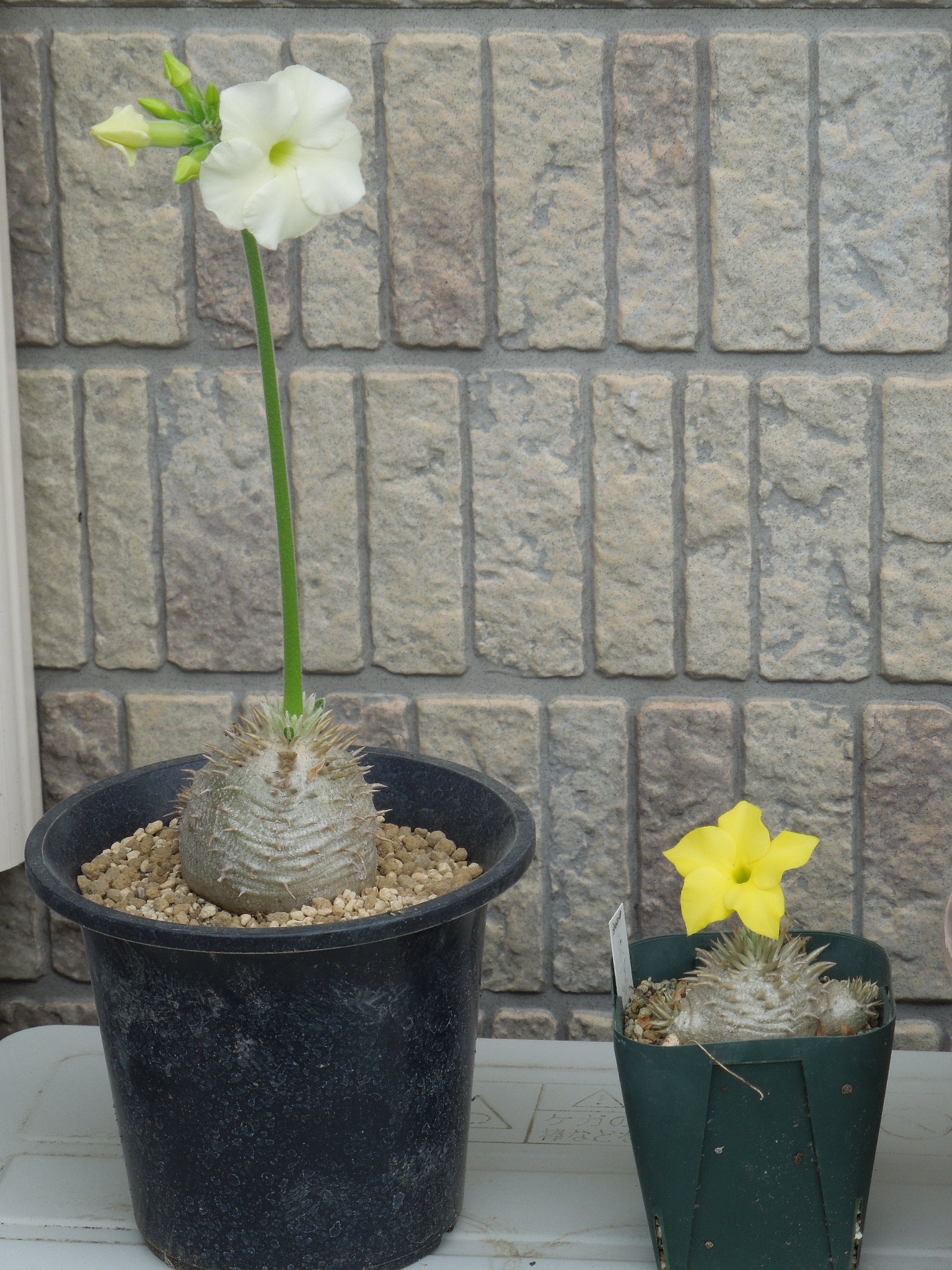 数年前、自宅の親株から採った種で実生したパキポディウムが開花した。エブレネウムとえびす笑い。エブレネウム花の数も多く、塊茎部も大きくなっているので・・・出窓に置いてあるエブレネウムの花粉を付けてみた。まん丸の良い形。えびす笑い。こちらは、まだ小さいからか花は1つだけ。まだ、小さいので何も弄らず。反対側から・・・花茎の短いタイプ???