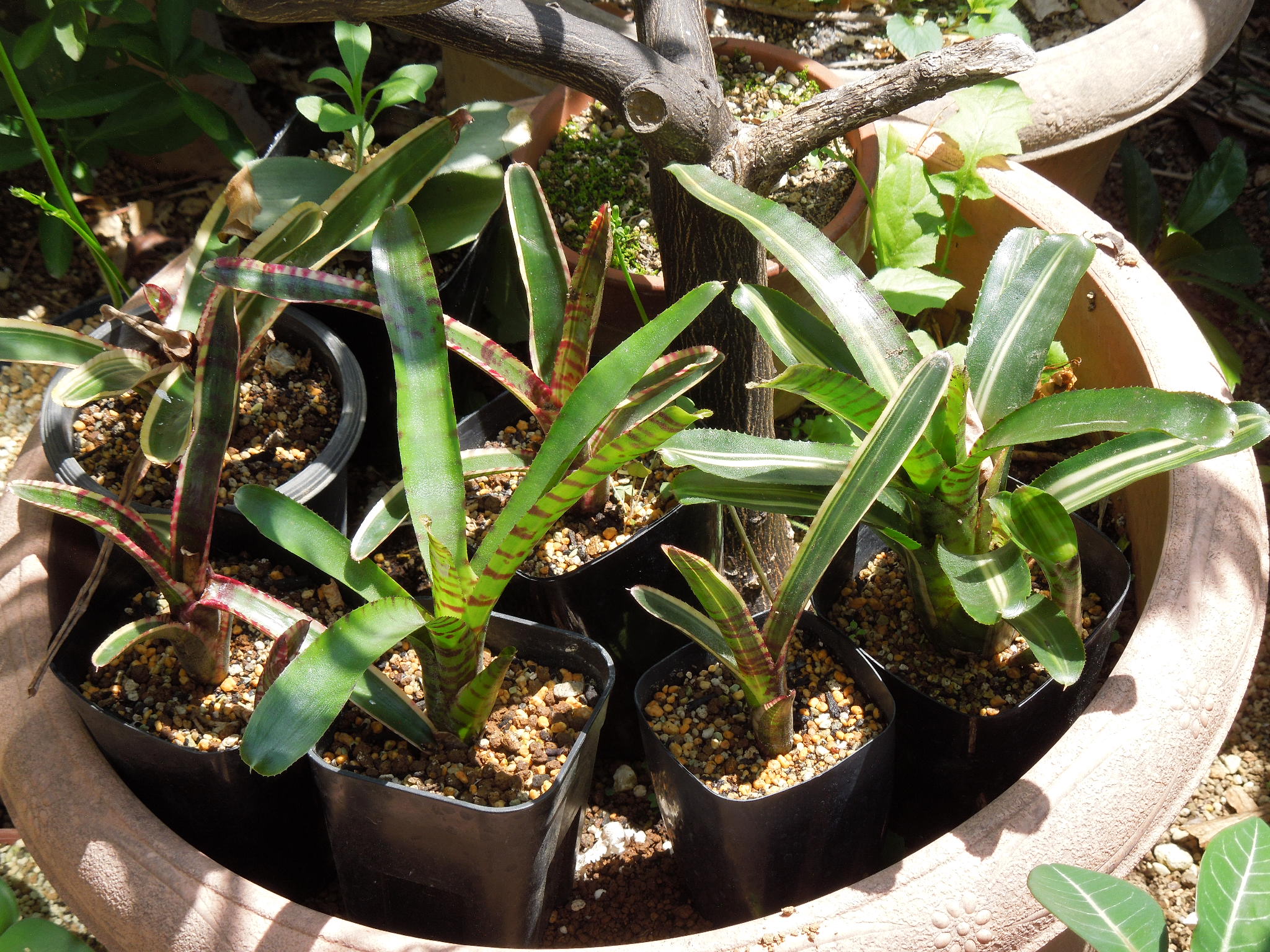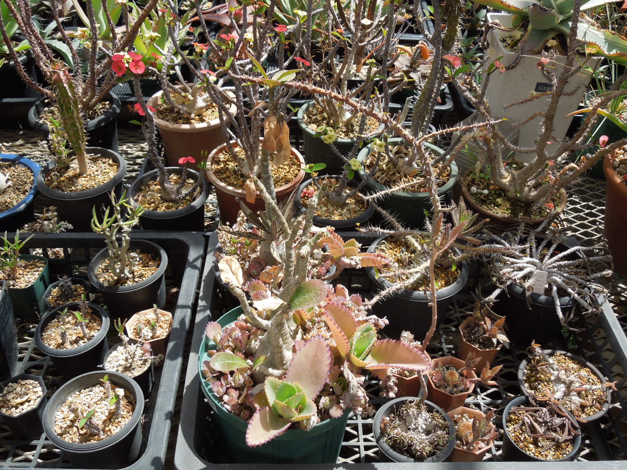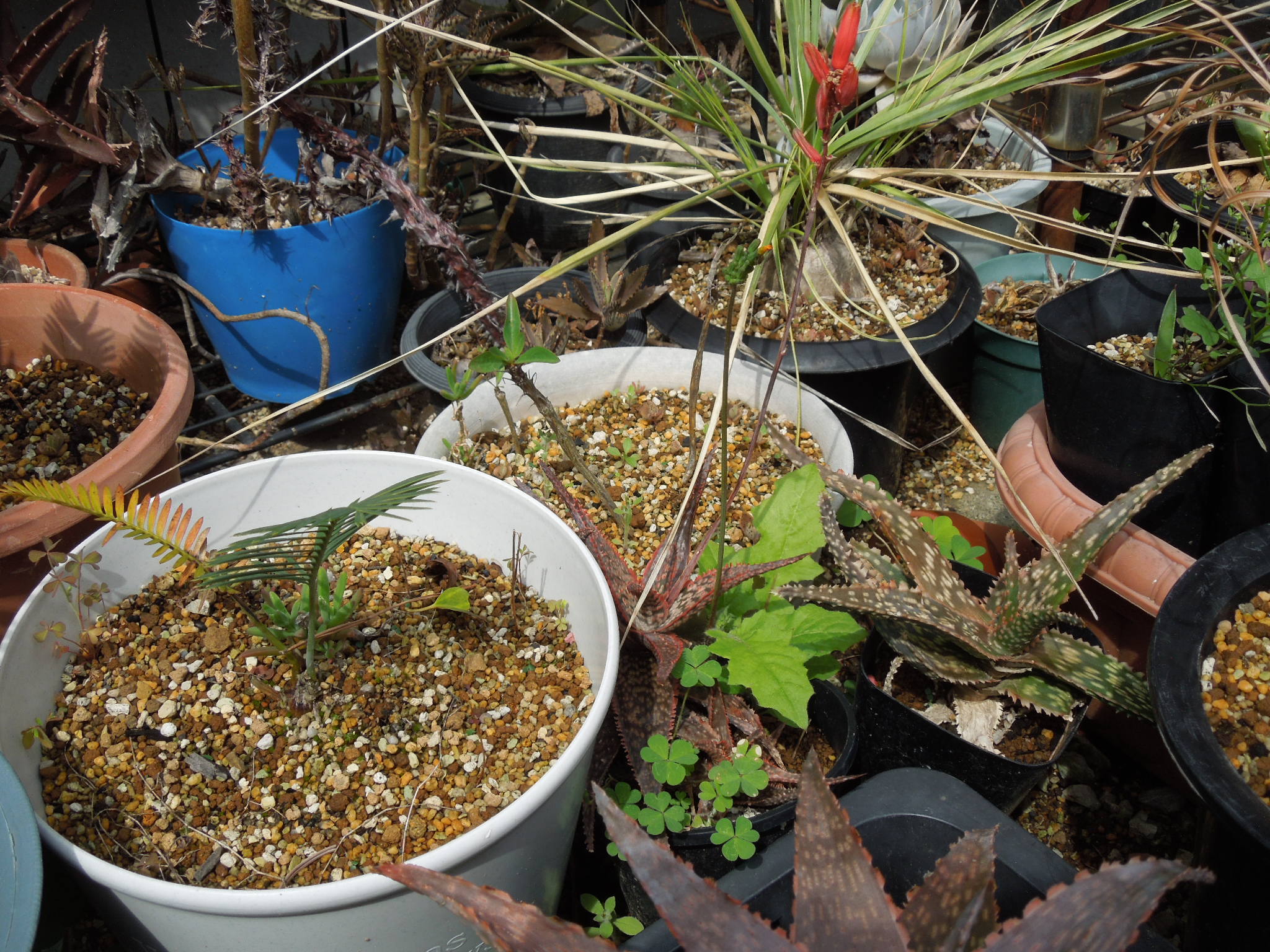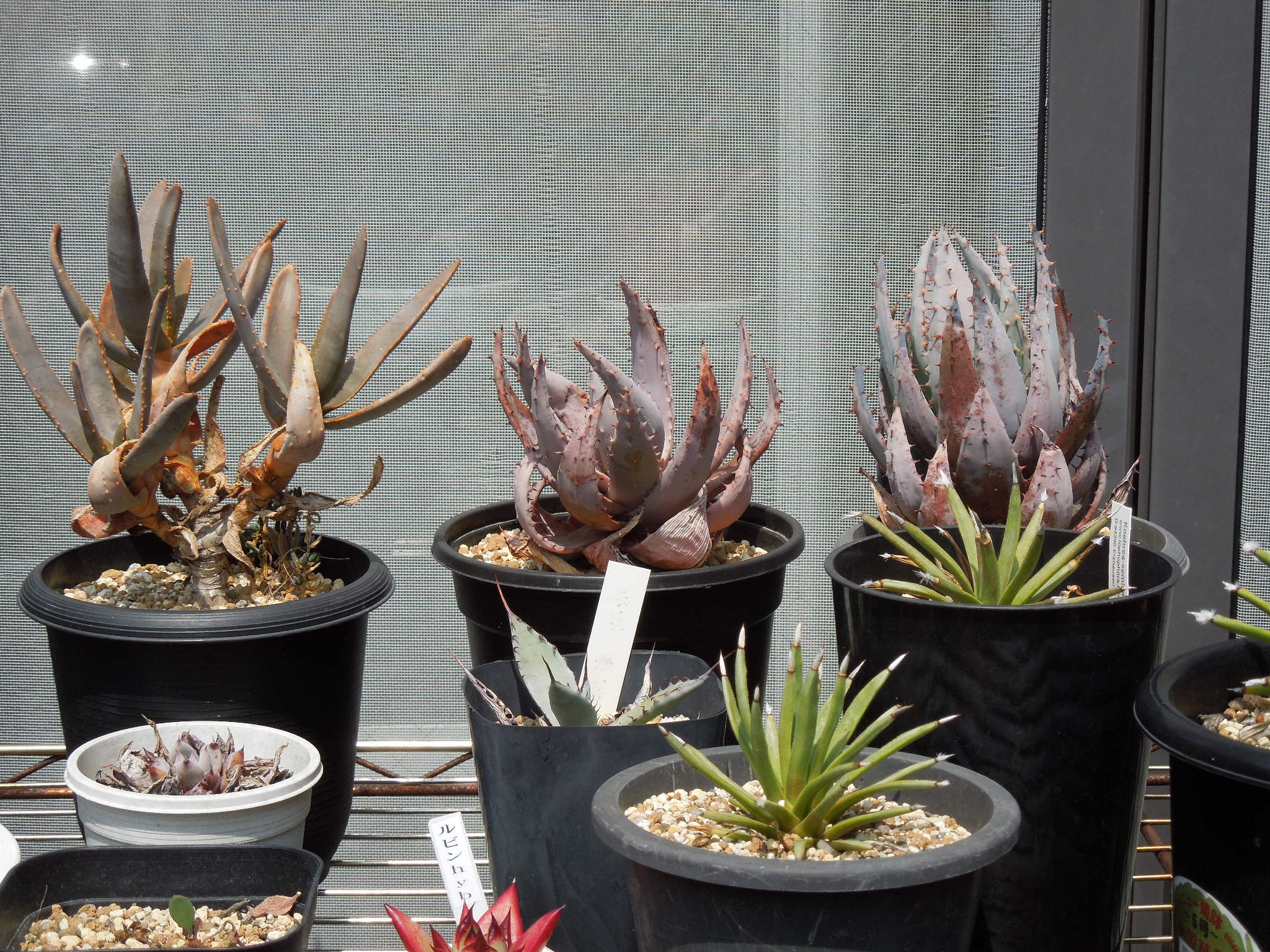 昨年株分けしたホワイトホットエンバーズ。ほとんど脱落者無しで越冬。1つだけだったパルマレスも、無事に越冬。暖かくなってきたので、屋外に出した。右端がパルマレスだったか???ホワイトホットエンバーズは生長が速い???いくつかは、越冬中に子株を出していた。綺麗な小型種で・・・これなら増えても問題無さそう。
