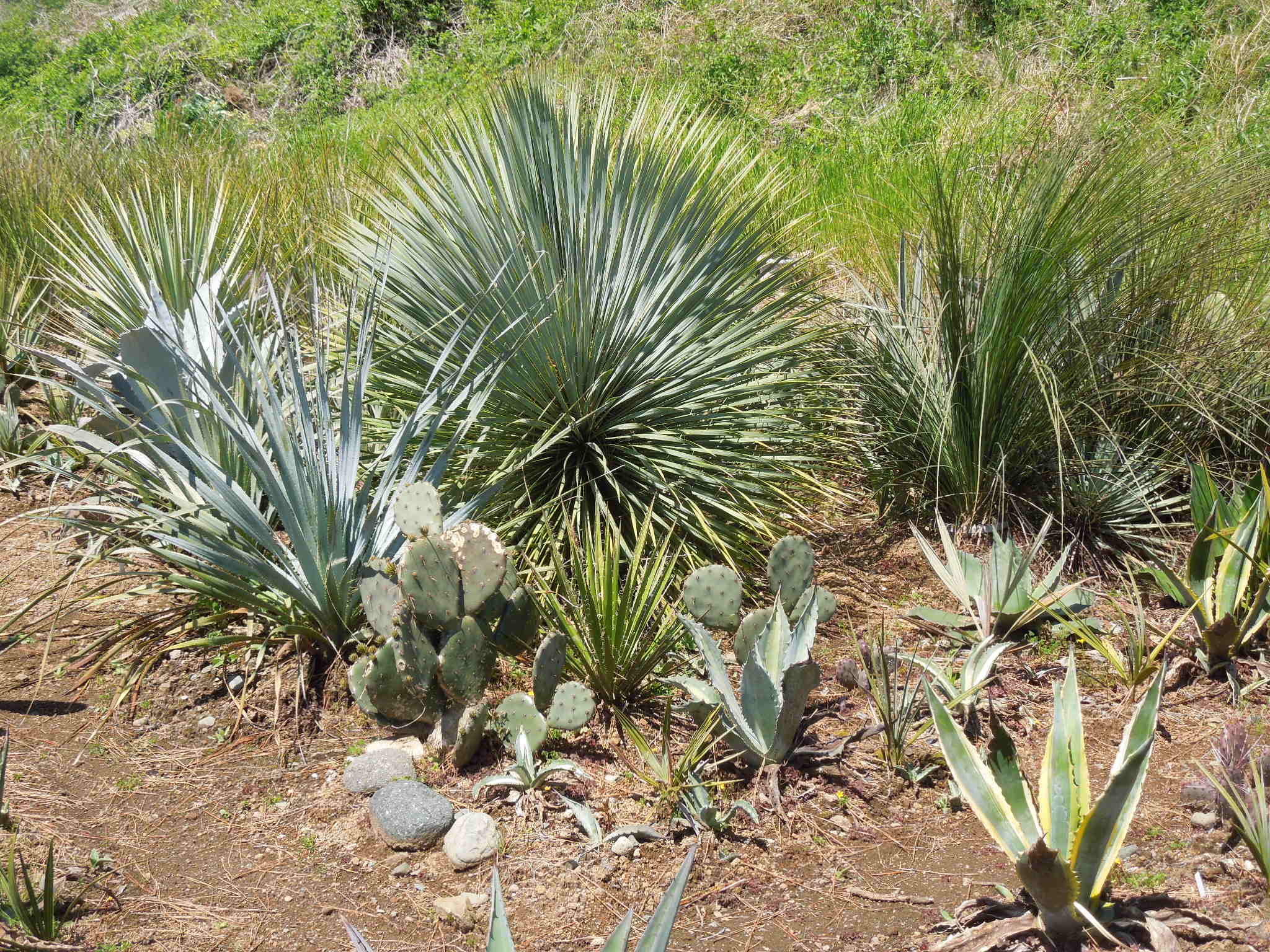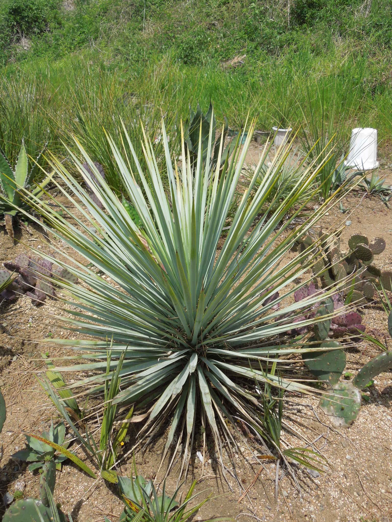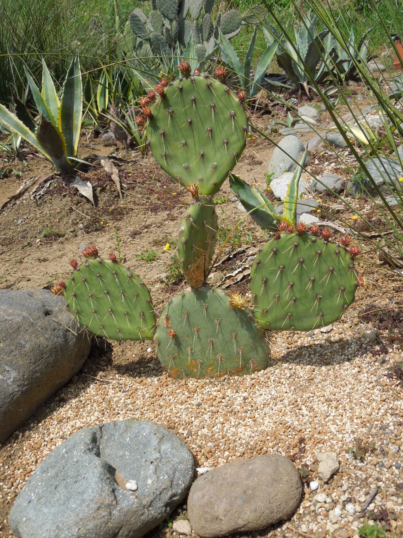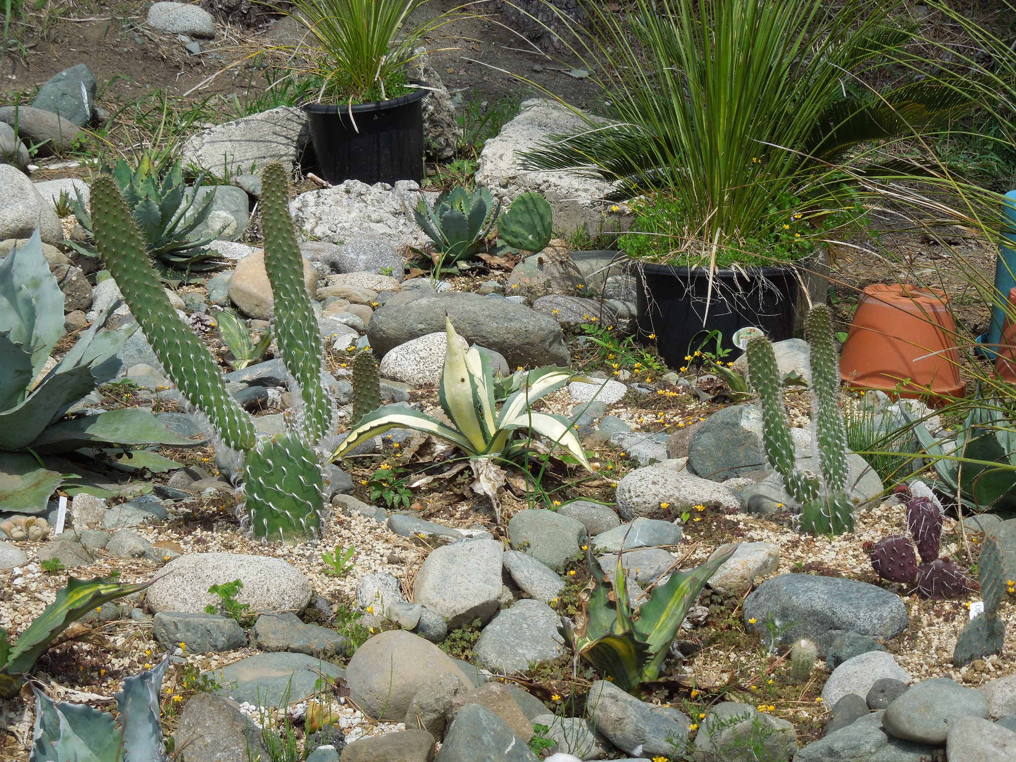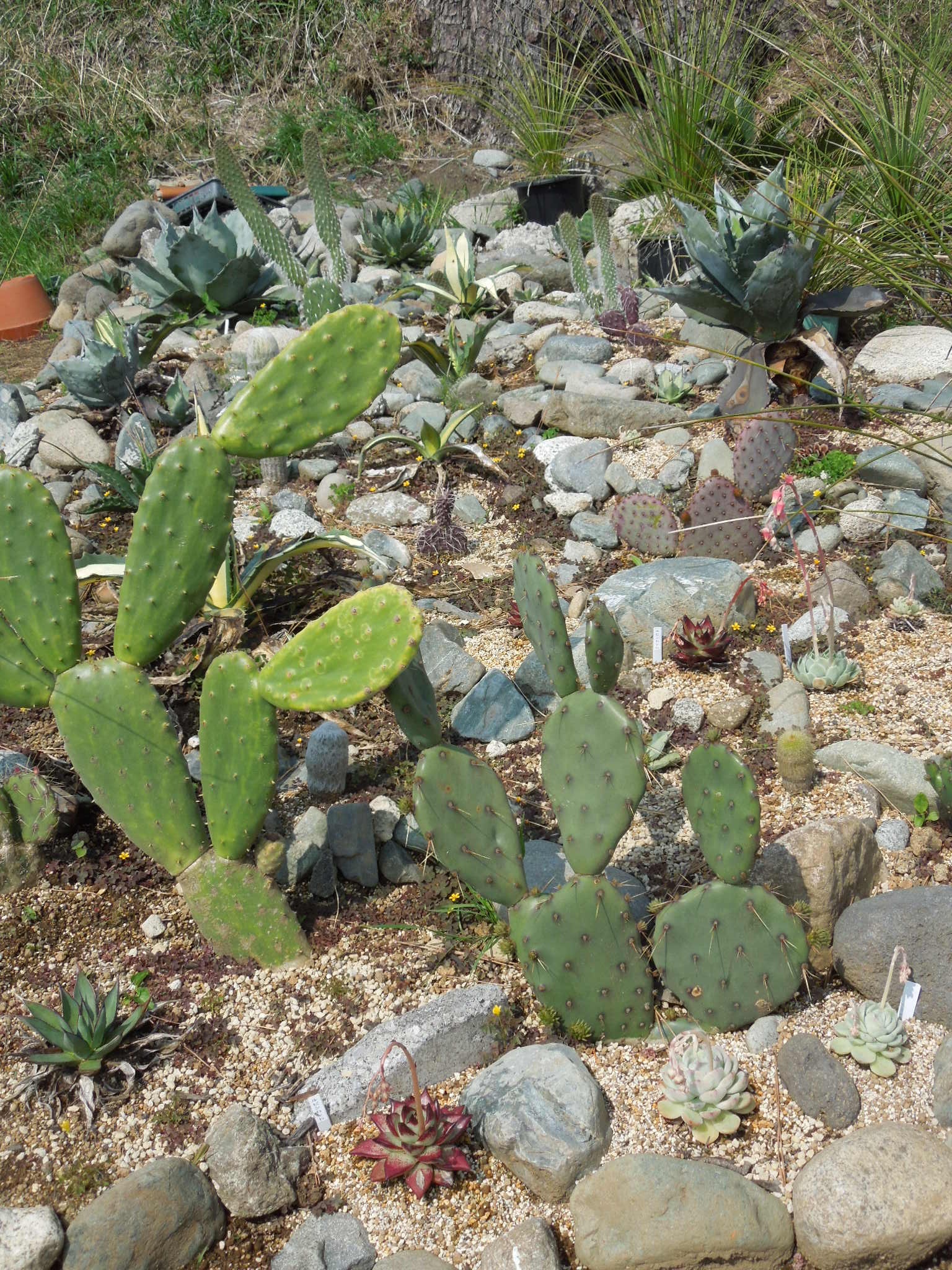 暑くなってきて、草取りに行く回数が増えた。雑草も伸びるが、他の植物も良く育っている。ユッカ・リギダ花茎がだいぶ伸びた。もう1株。開花時期が合いそうな感じもするが、どうだろうか・・・オプンチアも良く育っている。マクロケントラ~新芽だらけ。サンタリタダークナイトエケベリア~花が咲き始めた。
