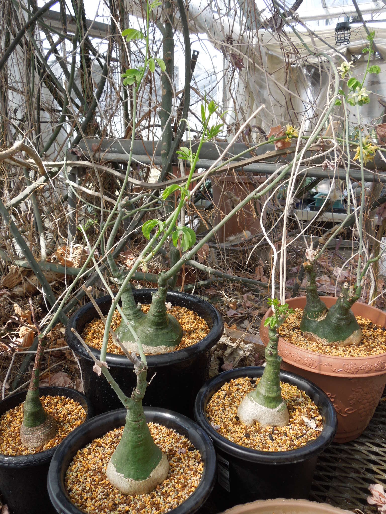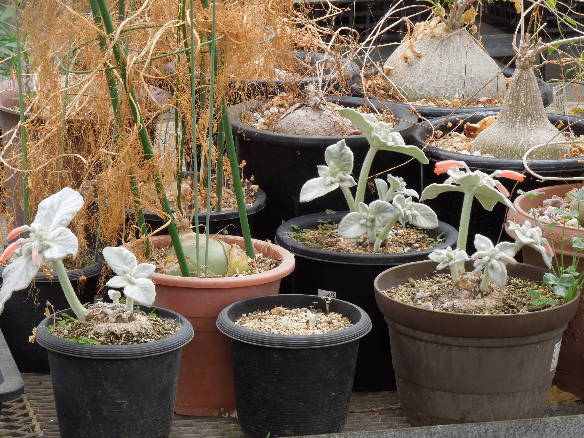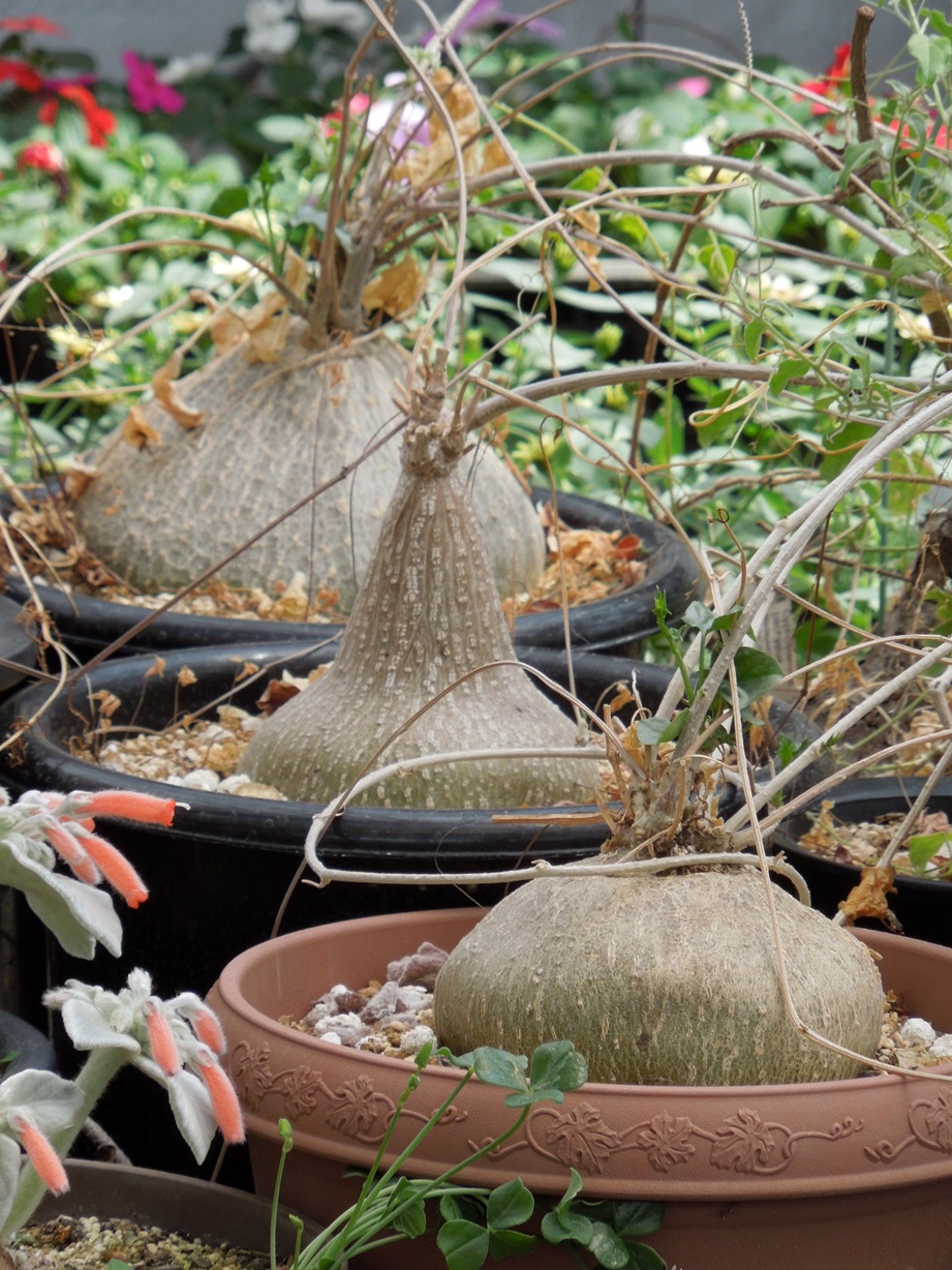 前回から約3週間。現在はこんな感じ。塊根が見えなくなって、ダメになったかと思っていた苗も・・・いつの間にか小さな新芽が出ていた。生きている部分が有った???この時期が一番綺麗か???今年も蕾も多く、いくつか開花している。昨年、一昨年は花はたくさん咲いたが結実しなかった。今年は、どうだろうか・・・
