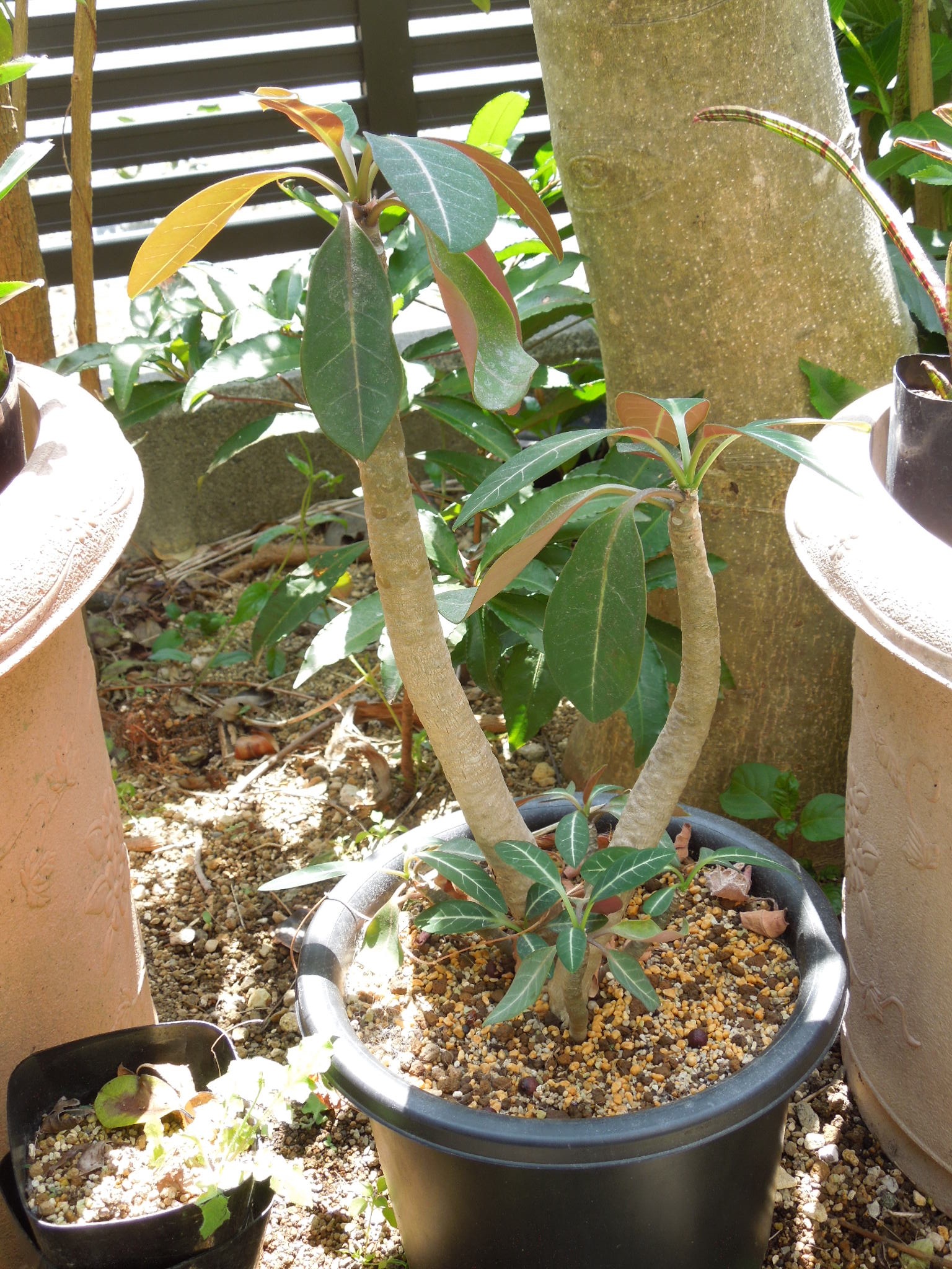 フォークイエリア・コルムナリス。2020年に実生。5年経ってもまだこんな大きさ。2年くらい前に・・・一番良く育っている感じの苗を・・・1本植え付けた鉢3年くらいは通年雨ざらし栽培でも・・・強健種のようで、半分くらいは生き残っているか???折れても・・・枝を出して生きている。現在は、この鉢の苗が一番良いか?少しだけ、太くなった???昨年はこんな感じ。