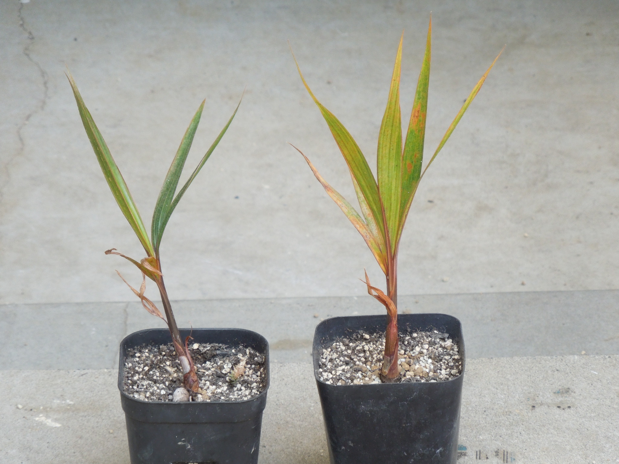 昨年実生したトックリヤシ。暖かくなってきたので植え替え。昨年、種と一緒に購入した苗と同じくらいの大きさだが・・・葉の色がおかしくなってきた。冬季の屋内栽培、日照不足によるダメージ???水切れ???鉢から抜く時に、用土はほとんど落ちてしまった。根が少ない???大きめの鉢に植え替え。木洩れ日が当たるくらいの場所で、腰水管理。昨年の小苗は、1週間くらい前から屋外管理。