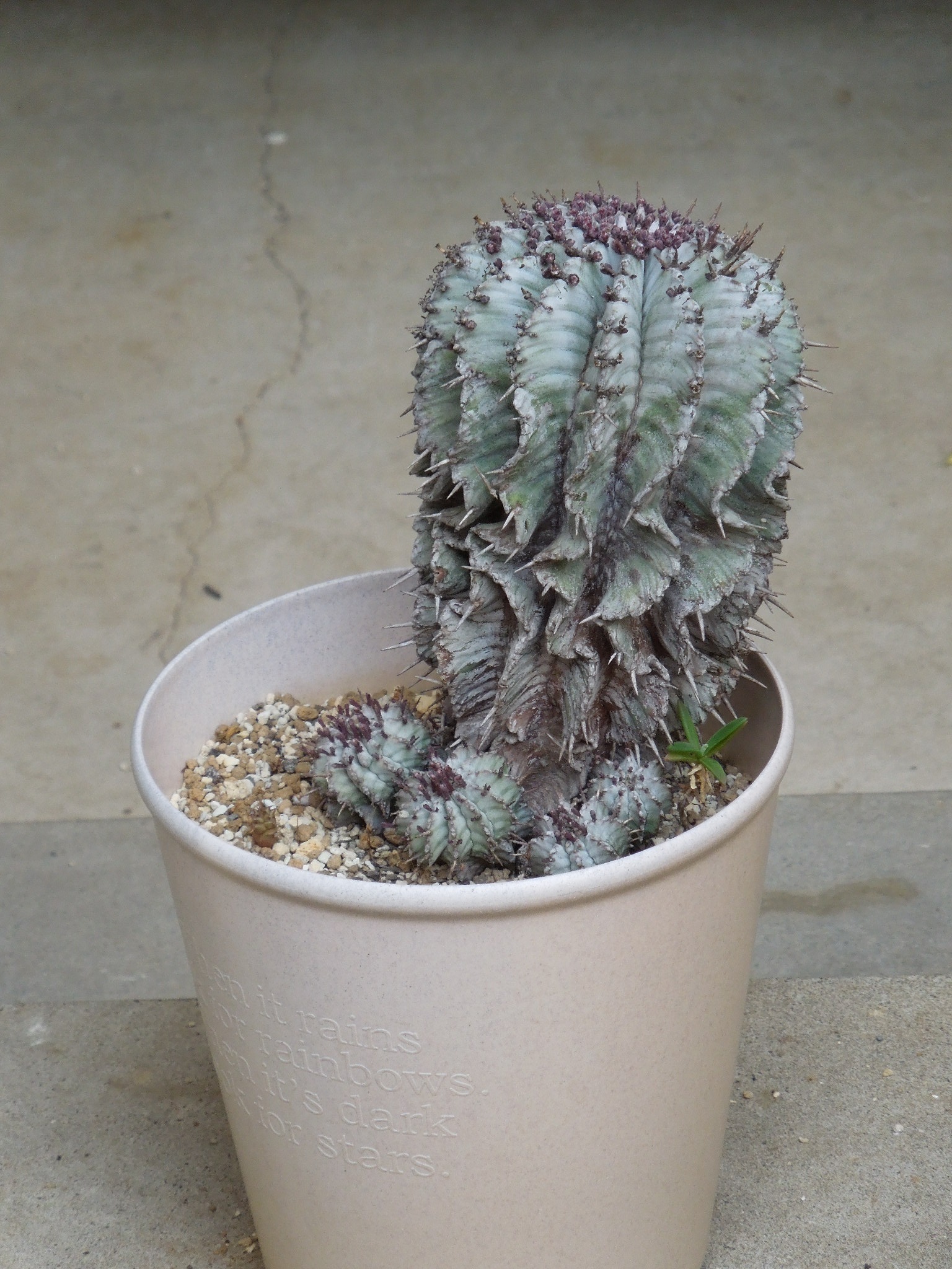 この辺りの芋花キリンからの実生苗。この2~3年は蒔いた記憶が無いので・・・いつの実生苗か???芋が出来ている苗は・・・1本も無し。苗は小さいが、花を咲かせたりつぼみを付けたりしている。種を蒔いたままで、そのまま放置していたのだと思う。植え替えをしないと、大きくならない花キリンも有るのか???1本だけ、幹が太めで螺旋状に刺が生えている苗が有った。植え替えてみようか・・・