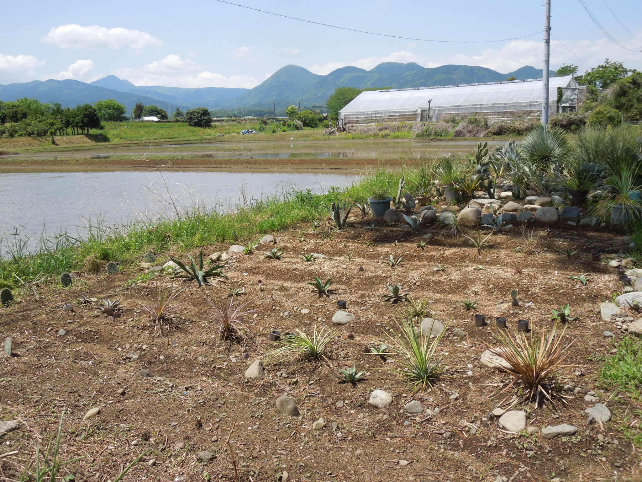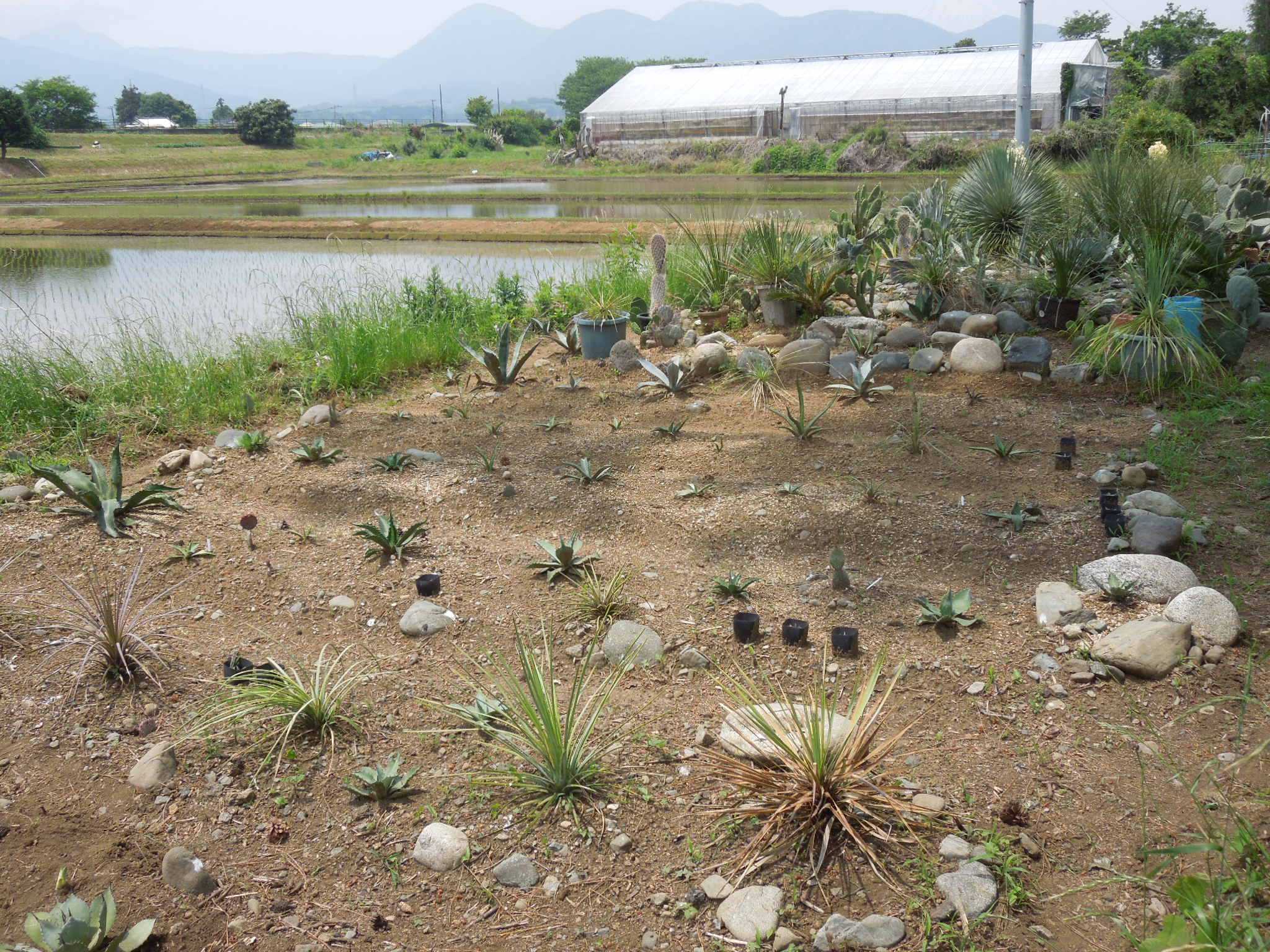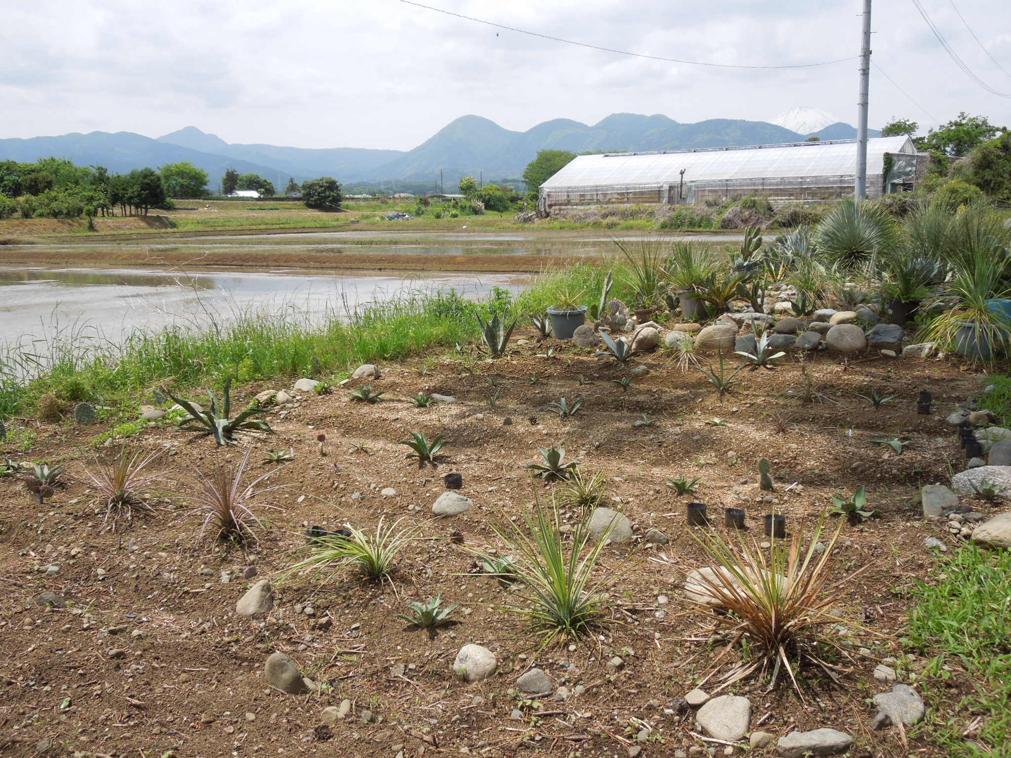 富士山の雪が少なくなってきた。日差しは少なくても、蒸し暑い。今日は軽作業。昨年、地面に直置きしたウィンゾリーが、鉢底から根を出して良く育ったので・・・今年も、鉢をいくつか畑の隙間に置いてみた。先日植え替えた・・・アデニウム・アラビカム・デザートナイトフォークドルステニア・ギガス(挿し木苗)パキポディウム・ウィンゾリーとバロニー晩秋までは、このままの予定。どうなるか・・・