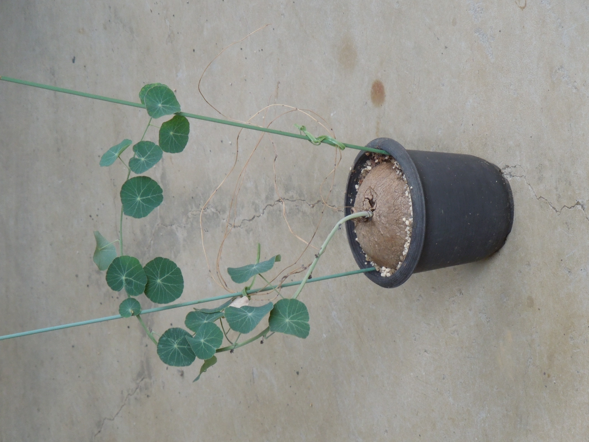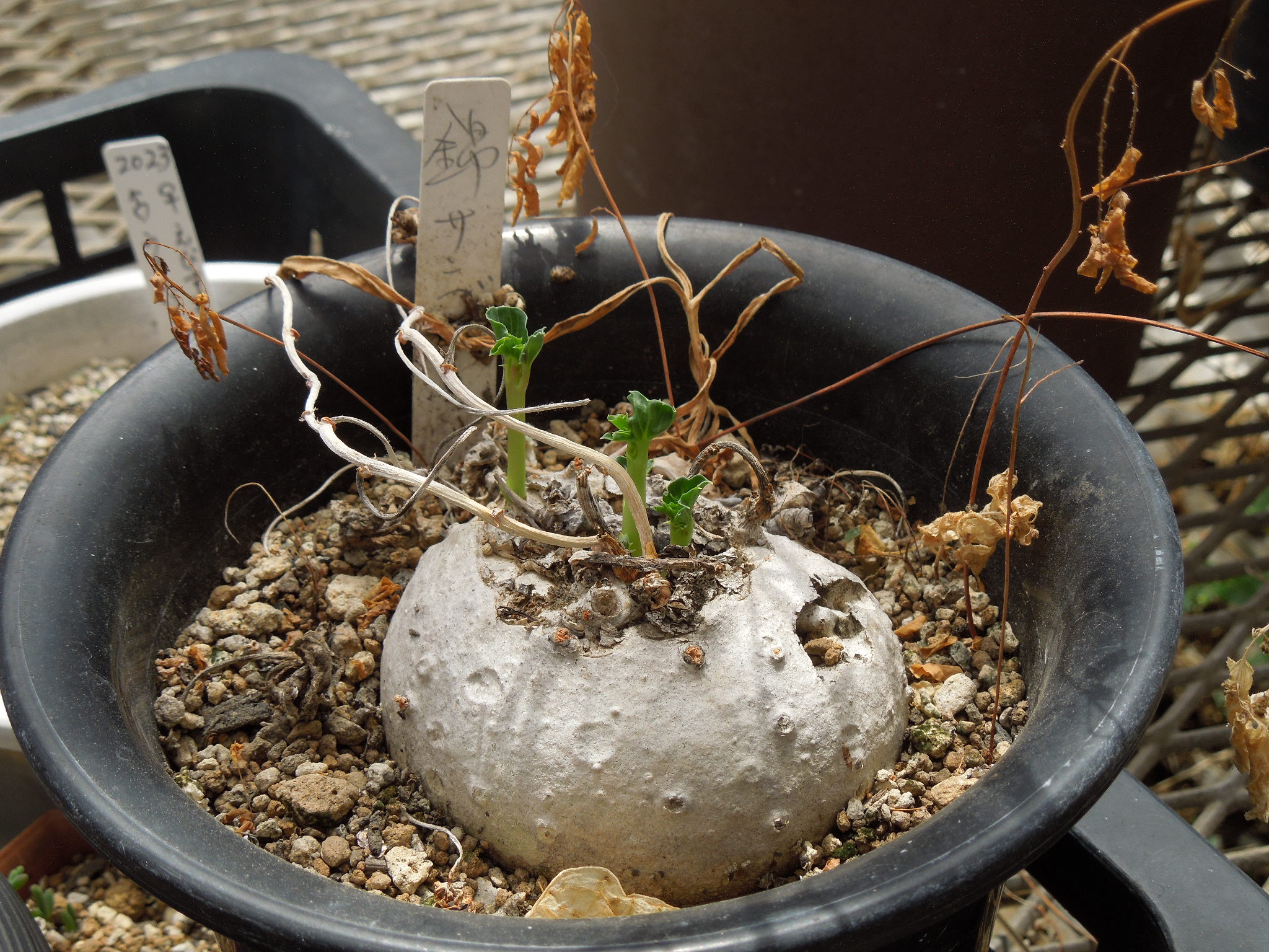 ステファニア・エレクタを、屋外に出すついでに植え替えた。一番大きいエレクタ。2022年に購入。購入時は、蔓も根も無い・・・ただの芋だった。植え付けてからそのまま。蔓もよく伸ばしているし・・・塊根も少し窮屈そう。この葉の、色形が好き。根は少ない。根も蔓も、毎年更新するのか???根に付いている白い物は、根ジラミ???「乾燥していると根ジラミが付きやすい」気温も上がってきているので、あまり気にしないで植え付け。タップリ水を遣って、そのまま屋外に出した。拗れ気味だったのか動きが無かったエレクタ。屋内用温室で管理していた。塊根から離れたところから、蔓が出てきた。こぼれ種から発芽した???気になる。屋外に出す前に・・・しばらく屋内窓際で様子見。