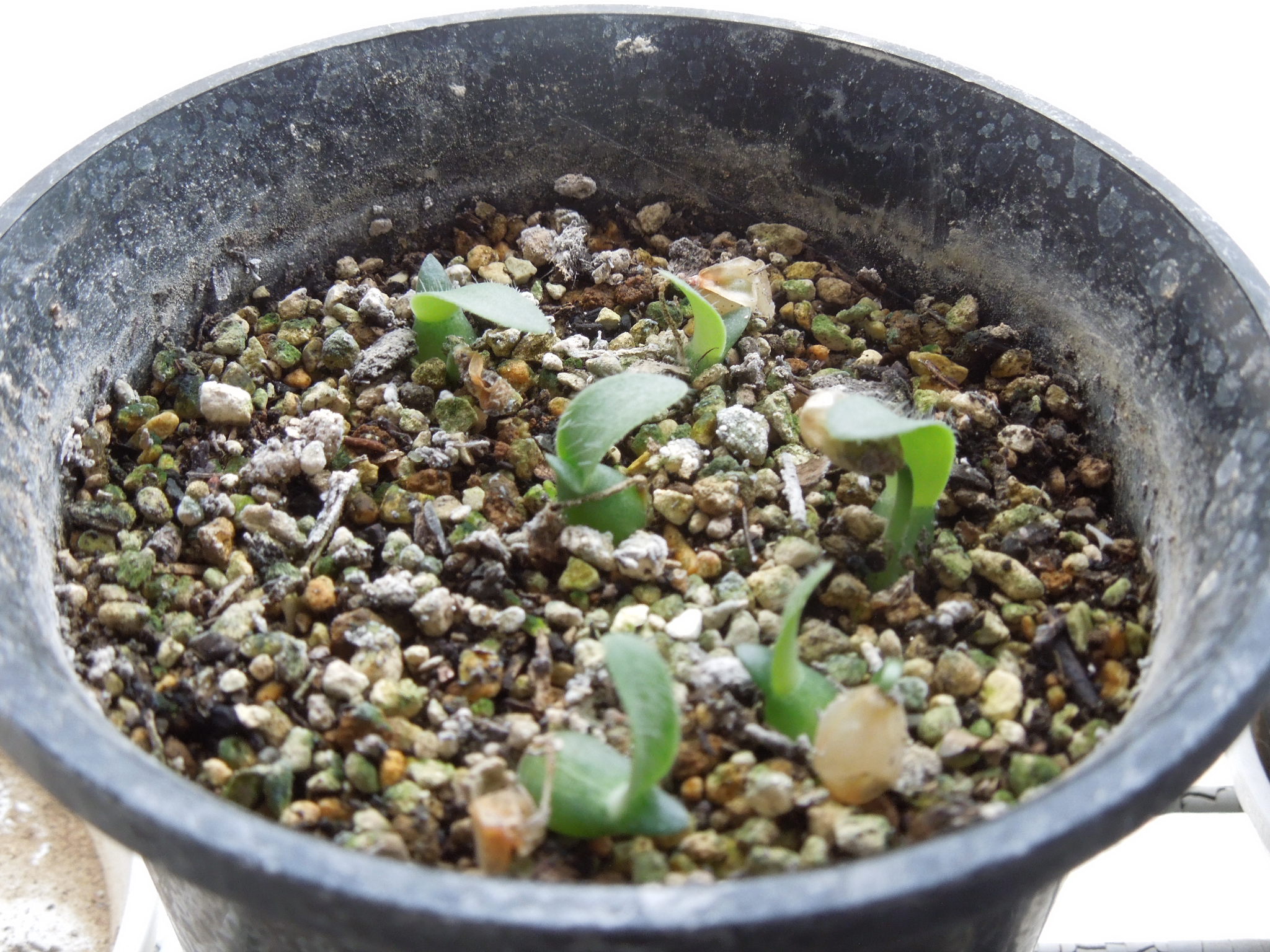 2月終わり頃、小田園芸さんに頂いたハエマンサス・アルビフロスの種。2週間少々で発芽。最近は、すっかり忘れていた。屋内用温室の中で、葉を出しているのを発見!白い半透明な卵みたいな物が無くなっていて・・・直ぐには、何だか分からなかった。7個蒔いて、6個発芽。全員育っている。同じ頃に花を咲かせていたハエマンサス・アルビフロスは・・・結実しなかったのか、種は落ちてしまったのか・・・花茎が残っているだけ。庭先の、木の下に置いてあるハエマンサス・アルビフロスは・・・あまり変わりなし。