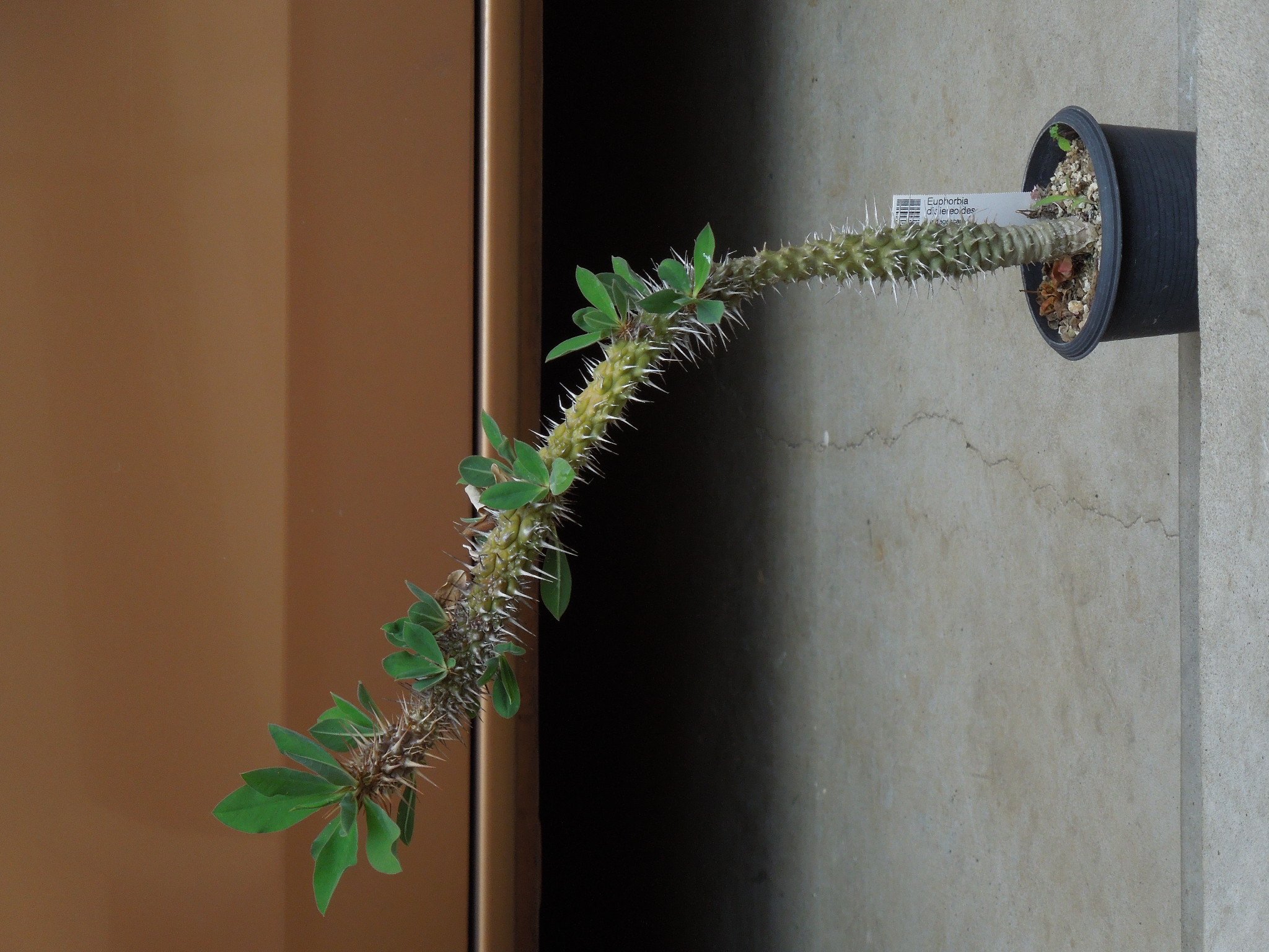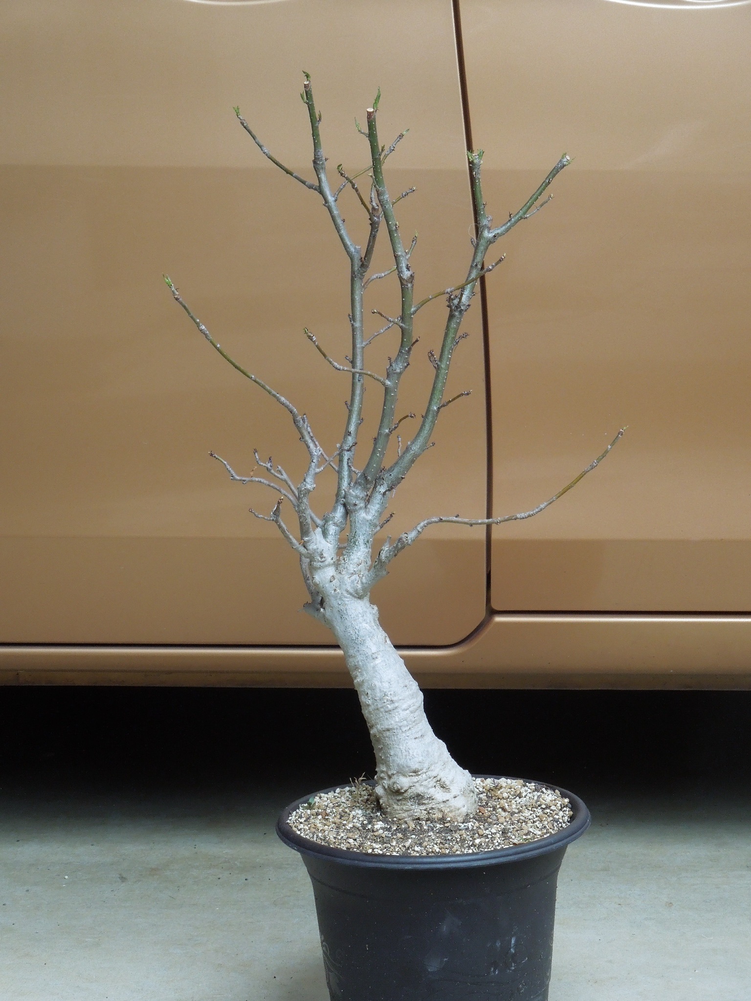 ずいぶん前にExoticaから購入した苗。特に欲しかったわけでも無かったが・・・「お一人様2本まで」との個数制限が気になってポチり。高さ15cmくらい、単幹の苗を植え付けて現在まで放置。少しだけ太くなった。数年前に枝が出てきたが・・・植え替えもしていないから、それほど育たず。購入してから、10年以上経っている。ということで、初めての植え替え。ついでに、先端もカット。カチカチの根鉢。EXOTICAのタグも刺さったまま。こんな感じで植え付け。これからは、もう少し面倒をみてやろう。