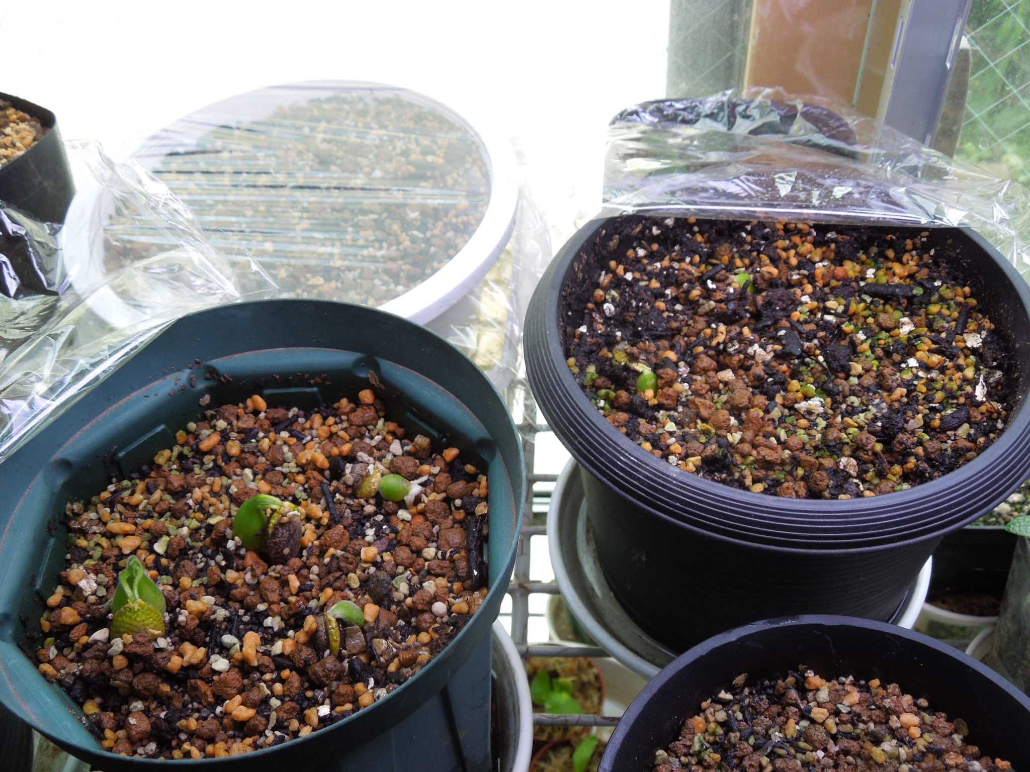 発芽が始まって、約1週間。双葉が、まだ展開しない・・・と、鉢を眺めていたら・・・形は、だいぶ変わってきている。塊茎部が太くなった。双葉が展開していないのに、本葉が出始めている。ピレナカンサの発芽は、こんな感じ???種子を、軽く覆土した鉢も・・・発芽が始まった。ピレナカンサの実生は・・・種子を覆土しないで、半分くらい埋め込む程度が良い???
