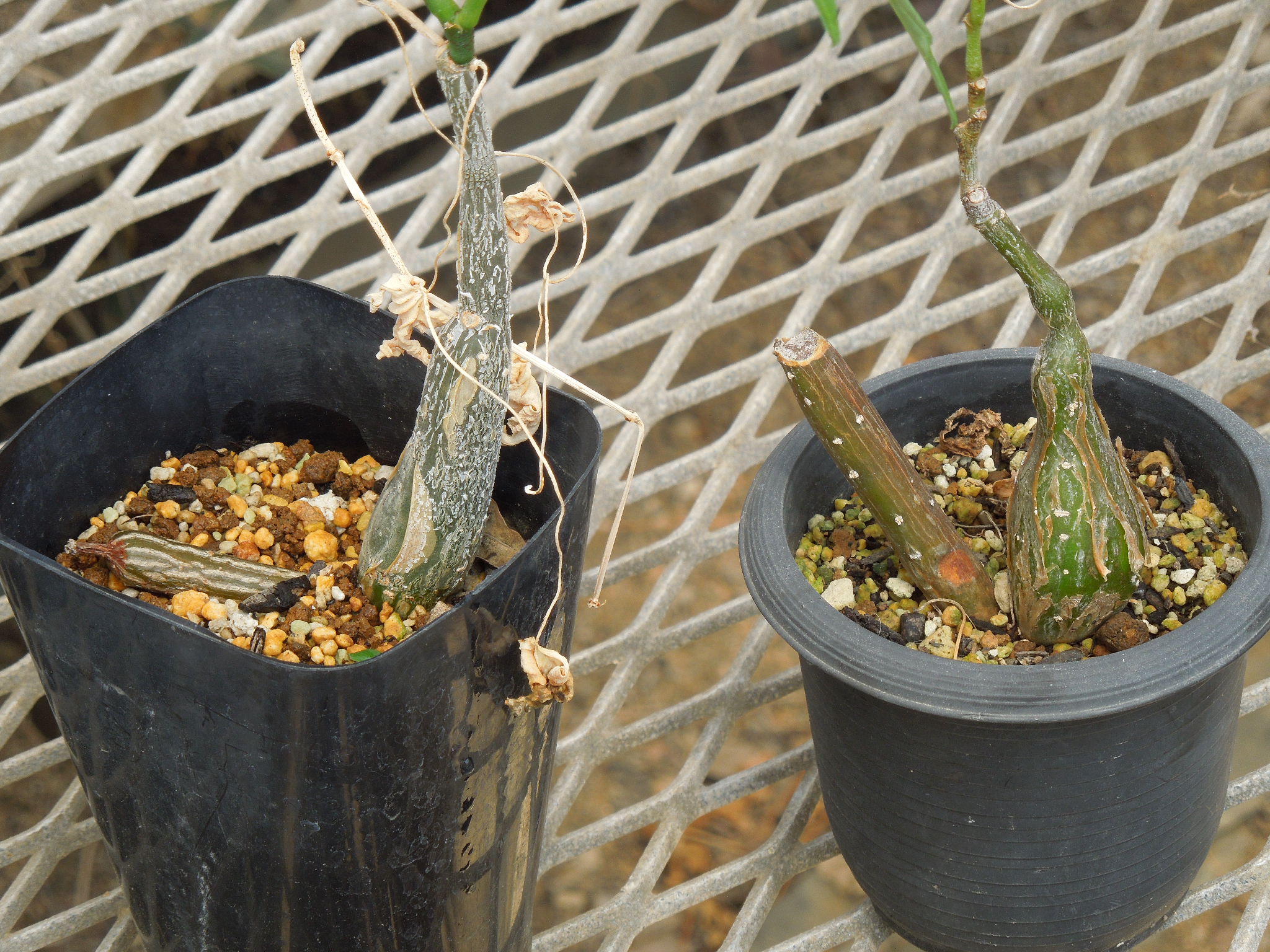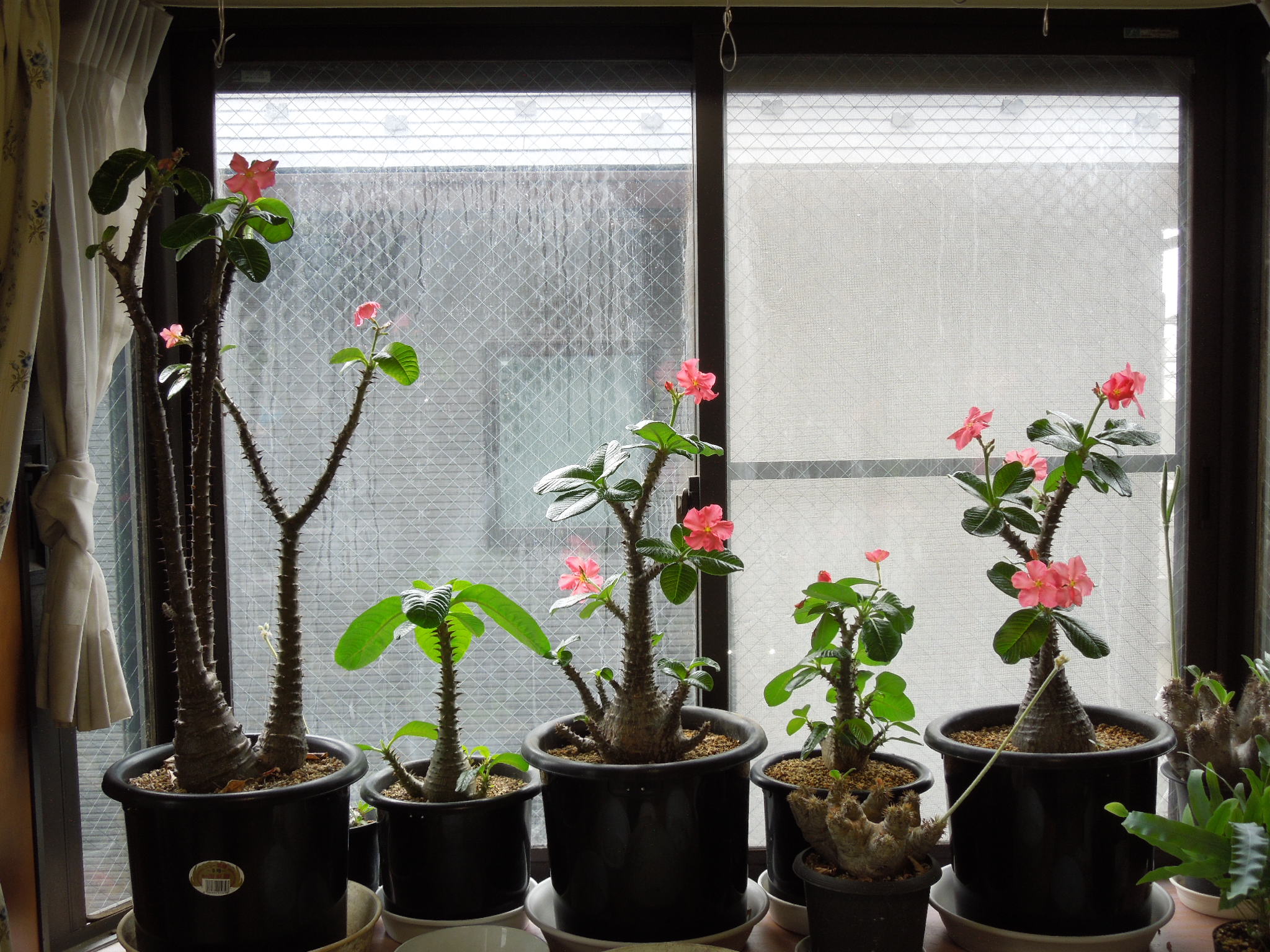 10年以上前に実生したアデニウム。数年前に植え替えてから放置状態だった。右の鉢は、子宝草だらけ・・・自宅に持ち帰って、植え替え。酷い根鉢になっていた。少しは、機嫌を直してくれるだろうか・・・塊茎部は、好きな形なので、今後に期待!外した子宝草は・・・捨てられずに、2号鉢に植えてしまった。