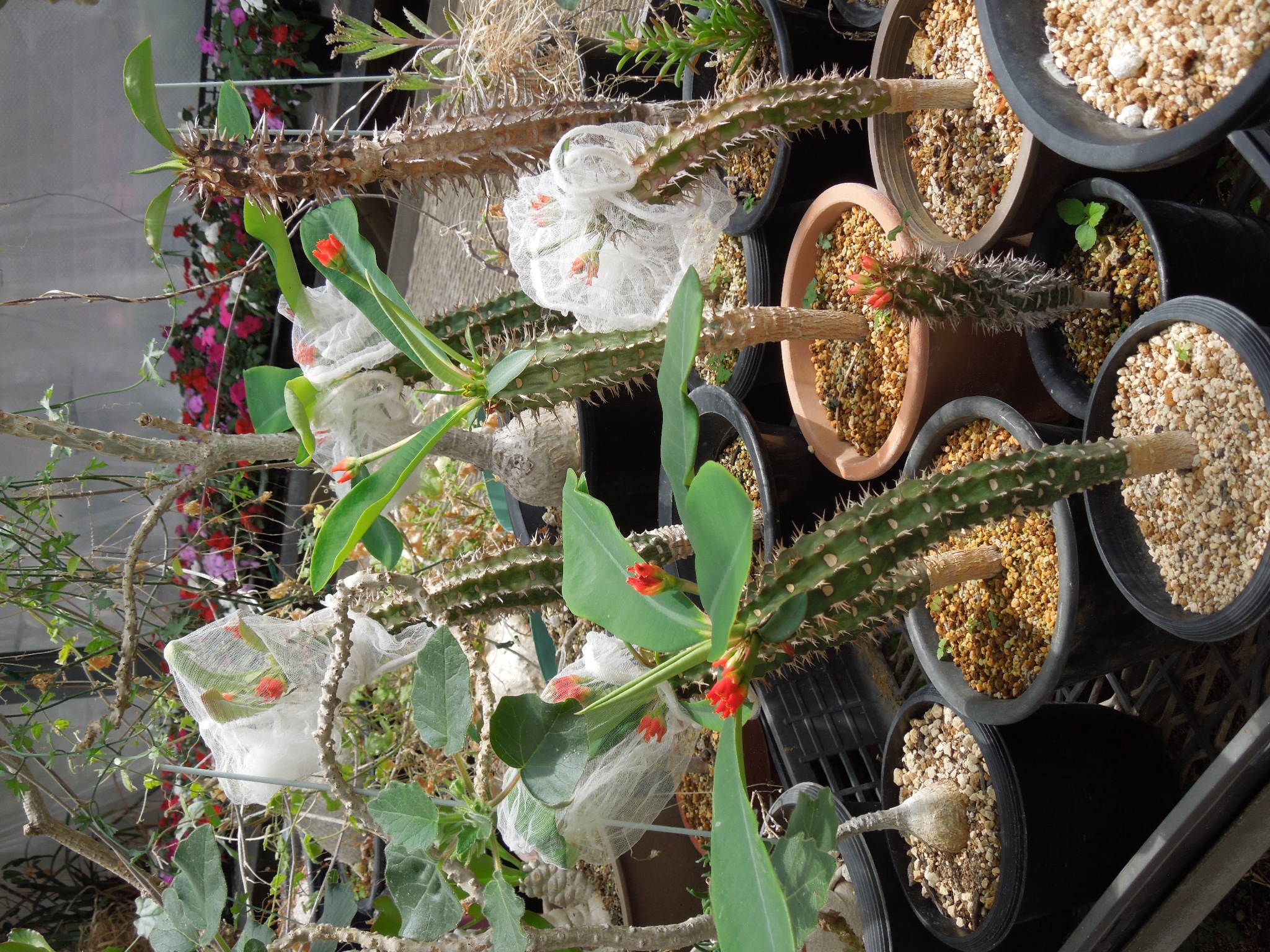 先月末に植え替えをしたホリダ(右側)。植え替えのダメージもほとんど無かったようで・・・拗れることも無く、順調に生長・・・今年も、結実した???外した子株も順調に生長中。雄株まだ花粉は、タップリ出ているので・・・授粉してみた。昨年、外した子株。順調に育って、開花中。