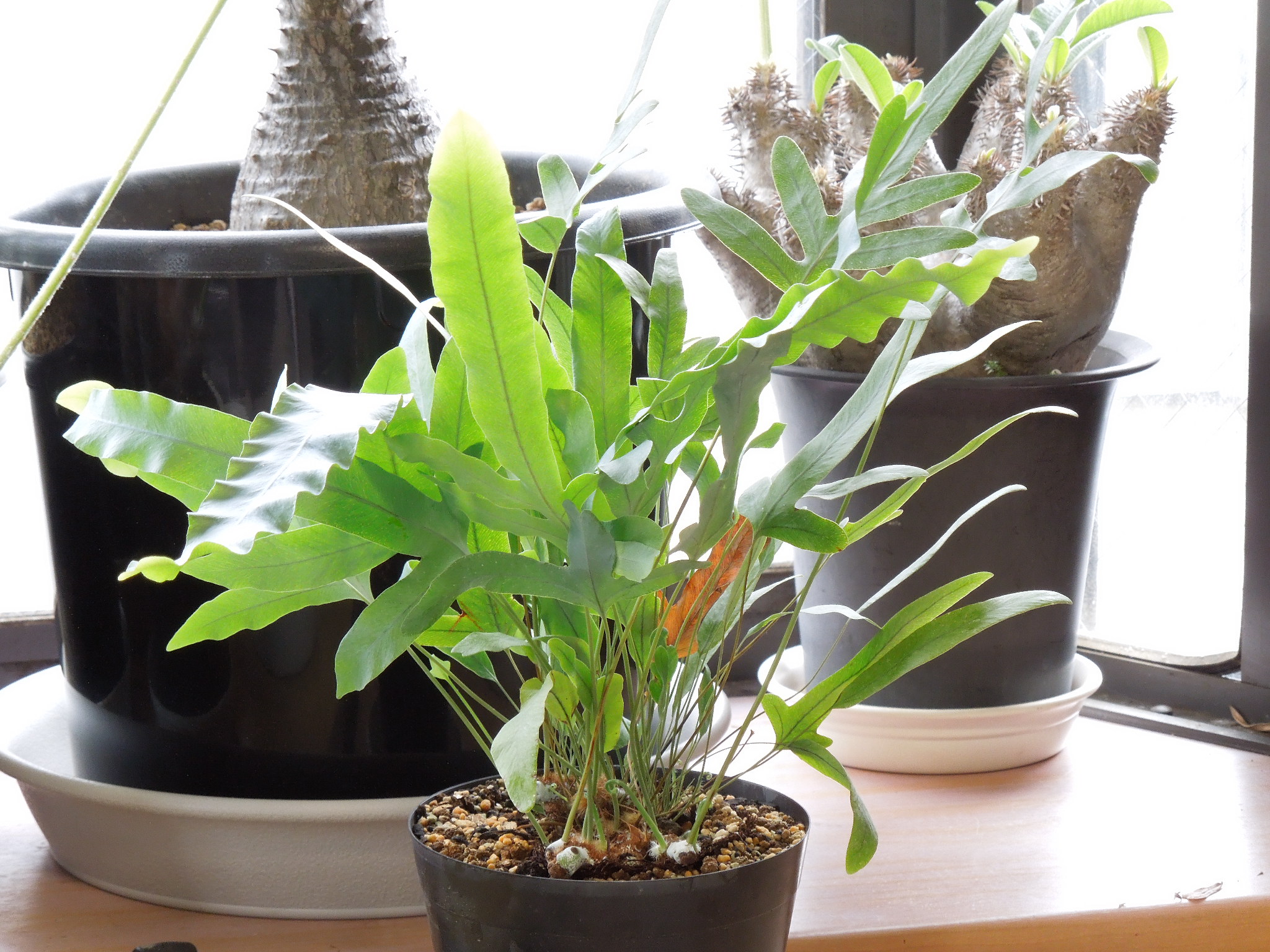 3月初めに購入したフレボディウム。しっかり活着したようで、だいぶ育った。このシダ、生長するにつれて・・・出す葉の形が変わってくるらしい。最初は、何の切れ込みも無い1枚の葉。次は、こんな感じ。成熟してくると、切れ込みの多い葉を出すようになるらしい。根茎も伸びて、新芽を出してきた。どのくらい、新芽が出たらカットできるのか???