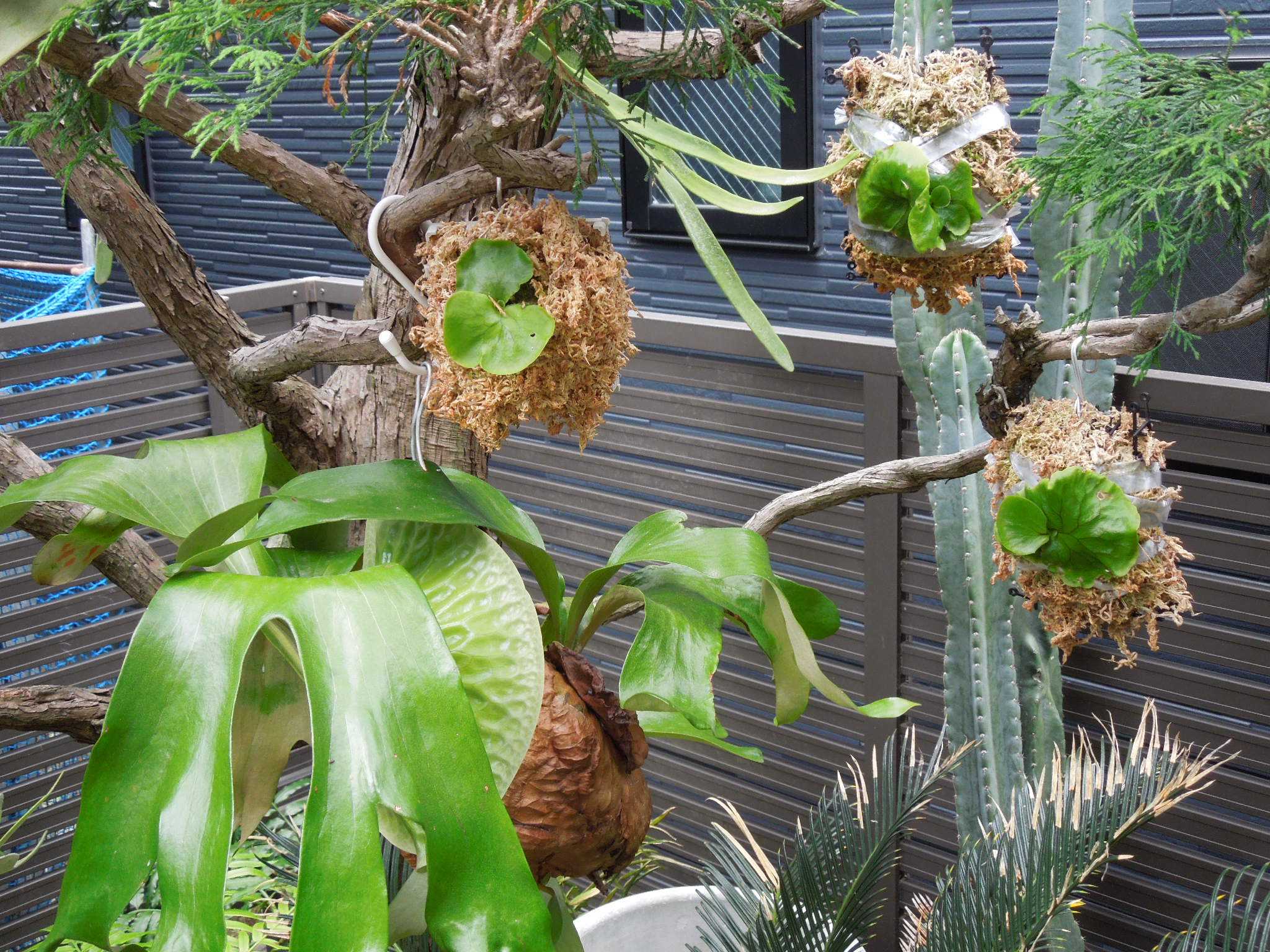 マダガスカリエンセとアルシコルネの交配種。マダガスカリエンセより、管理が楽らしい。2019年春先に購入。我が家では・・・夏季は屋外、庭木の枝に吊して・・・冬季は、屋内の明るい場所で管理。付けたミズゴケが、乾ききる前に水を遣っているだけ。マダガスカリエンセに似た、貯水葉の葉脈。反対側も貯水葉が生長中。