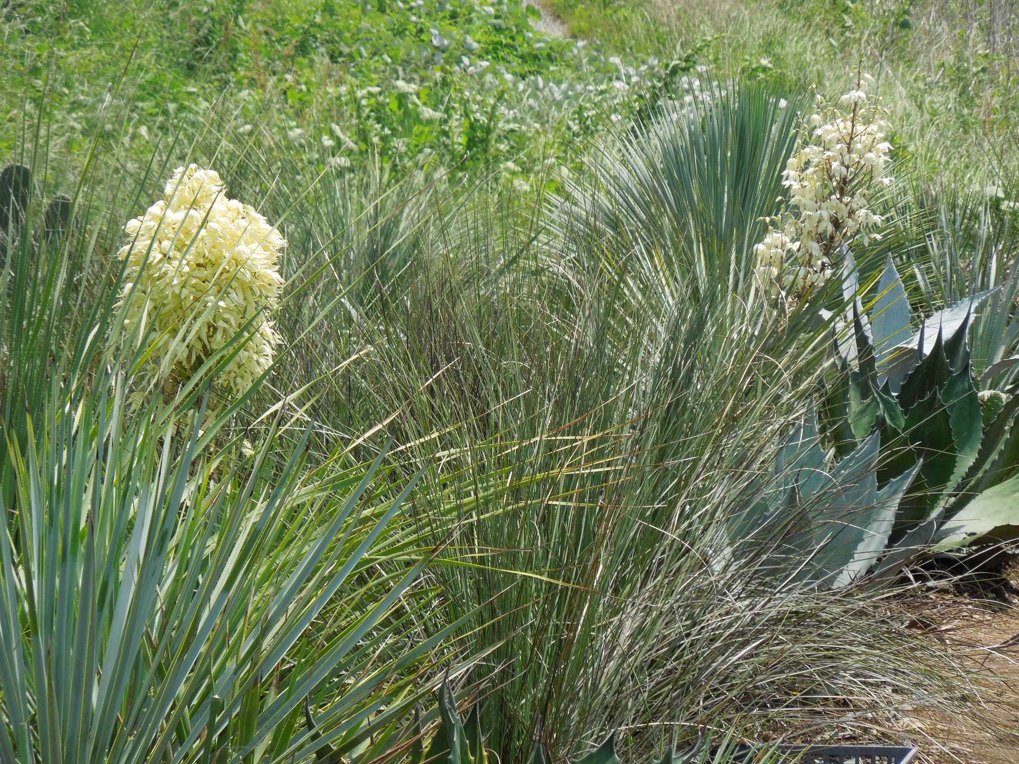 ユッカ・リギダは・・・まだ、良い感じで開花中。草取りをしながら、外した子株を植え付け。一番白い、フランゾシニーの子株。売れ残っていた・・・フェロックス”ブルー”新しい子株も発見。毎回毎回、新しい発見がある。