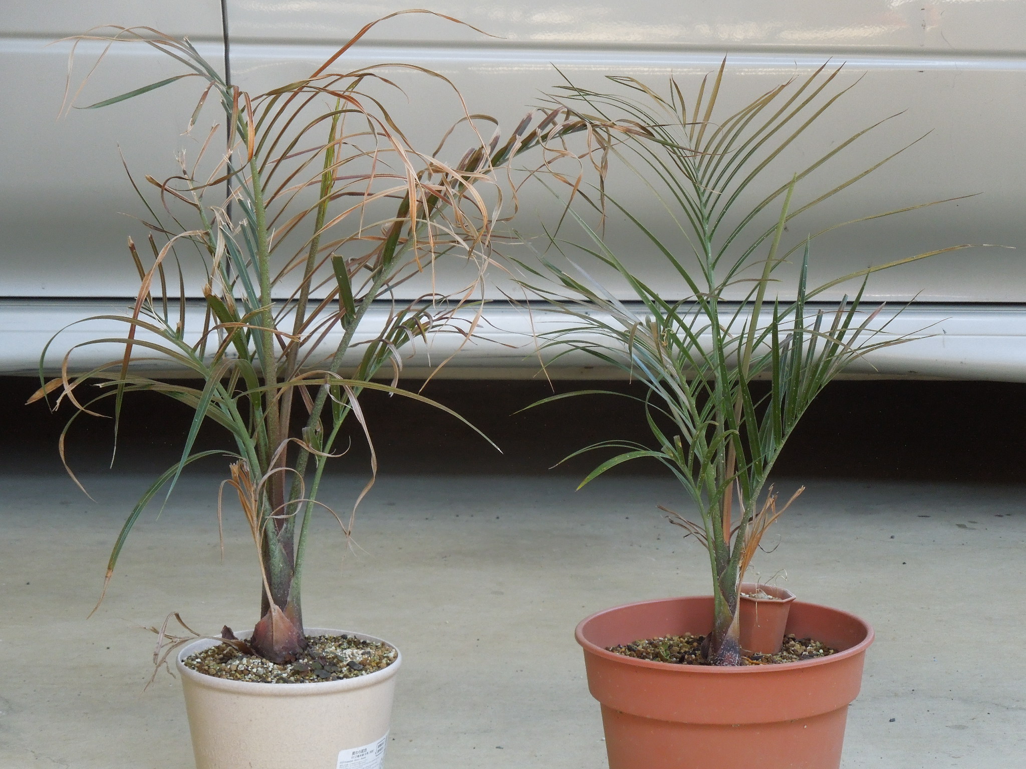 2021年に実生した苗。この2鉢だけは・・・冬季は屋内管理。幹も三角になって、それらしくなってきた。新しい穂先が伸びてきた。こちらは、屋外越冬株当地では、 「なんとか越冬できる」という感じ。寒さで、ボロボロになっている。2022年、試しに地植えにした苗は・・・まだ、それほど寒くない12月中に枯れてしまった。
