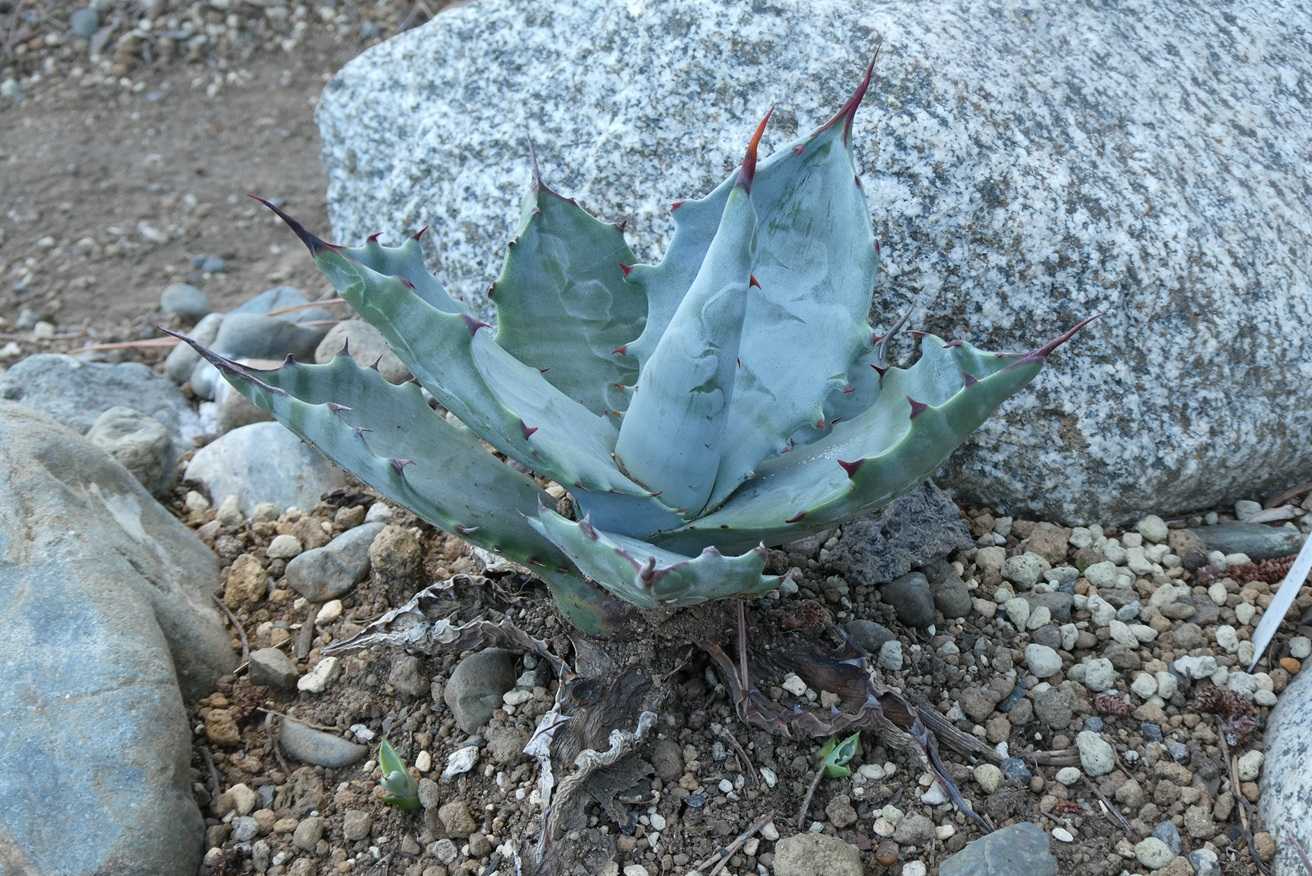 フェロックスらしい頂き物のアガベ。葉の色、形など気に入っているが、名前が分からない。地植えにしてから、いくつか子株を出して・・・倍くらいの大きさになった。葉は、幅広で短め???黒っぽい刺で・・・大きい刺と、小さい刺がある。上の画像の親株から外した子株。フェロックス”ブルー”に似ているような感じもするが・・・写真などを見ると、フェロックス”ブルー”の刺は赤色みたいだ。このアガベ、何だろう???