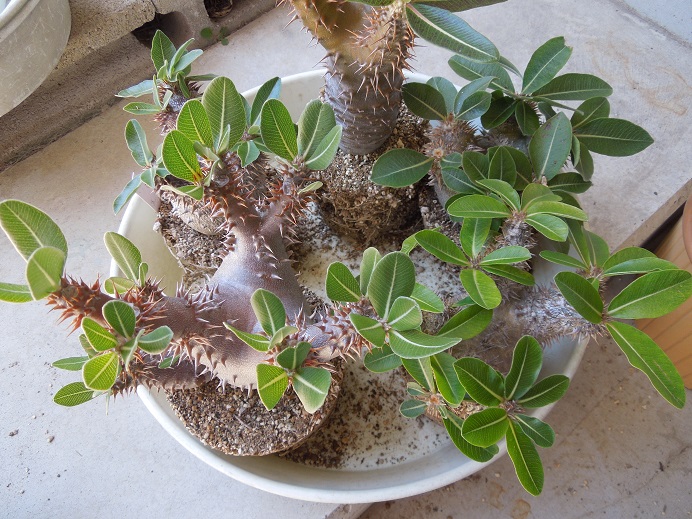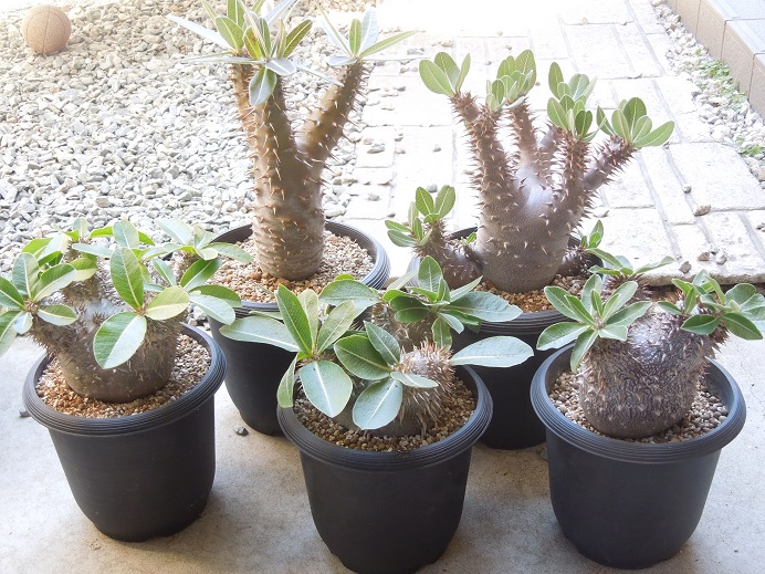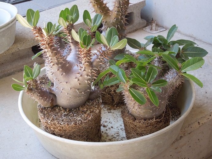昨年植え替えをしたロスラツム(後列中央)は少しだけ余裕がありましたが、他のパキポはどれもしっかりと根鉢になっていました。2年に1度は植え替えをしないとだめですね。