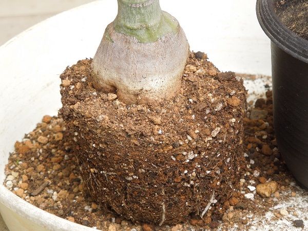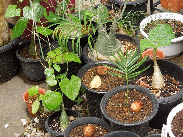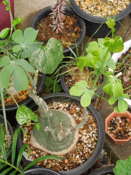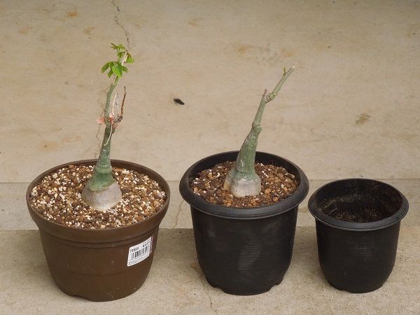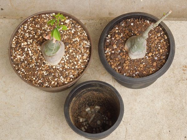 室内にまだ置いてあった小さいアデニアグラウカも新芽を出し始めました。何年たってもあまり大きくならないのて少し大きめの鉢に植え替えることにしました。
