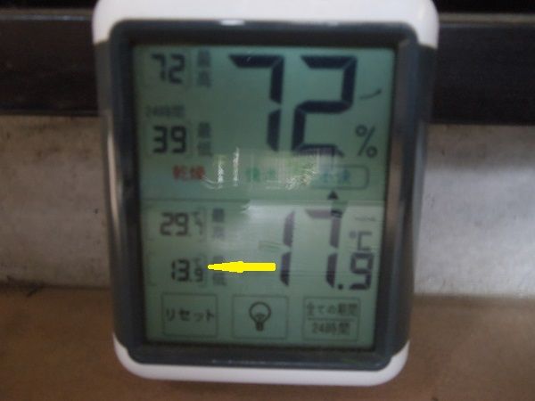 北風の当たらない場所に置いた最低気温は13度台後半でしたが・・・バオバブの置いてあった場所は家の南東角になので、北風が巻き込んで冷えたか・・・