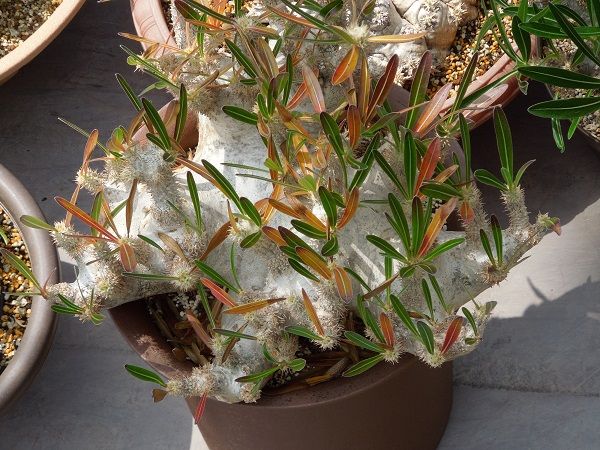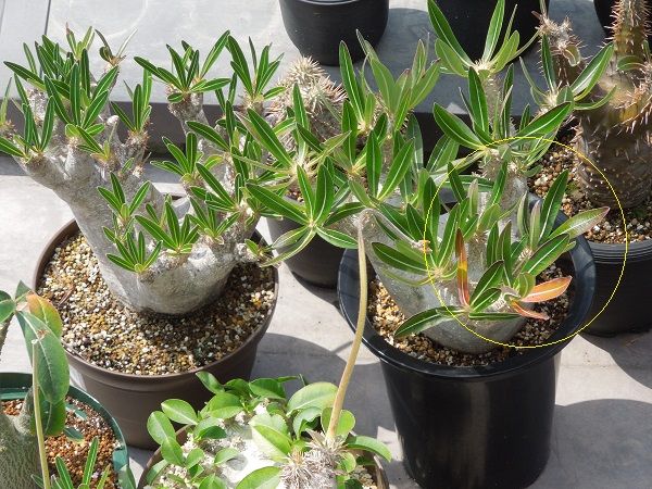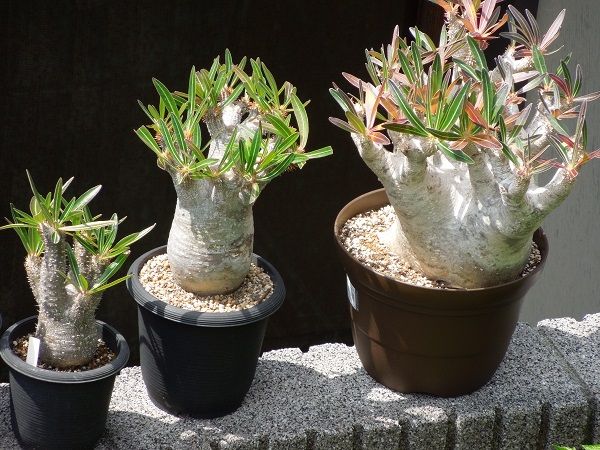 5月に入ってから外に出し始めたパキポディウム、イノピナツムが紅葉してしまった。同じ場所のエブレネウムとえびす笑いは大丈夫そうだ。