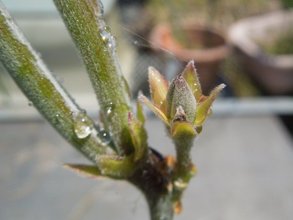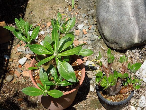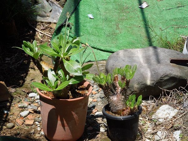 普及種ということで小田園芸さんに分けてもらったパキポディウム。花の感じはデンシフローラムみたいだった。水を遣りに行ったら大きな莢が出来ていた。同じころ実生のえびす笑いにも花が咲いていたので、我が家から猫の髭を持って行き受粉させたのが結実したのだと思う。えびす笑いとデンシフローラムのクロスで、「えびす大黒」か・・・