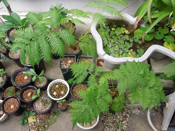 そこで、真夏の強い日差しも弱まってきし、苗も少し大きくなってきたので直射日光の当たる場所に出してみた。大きいヒカゲヘゴは屋内から屋外に出した当初こそ葉が日焼けしたがその後は全く問題ない。小さいやつらはどおなるか・・・
