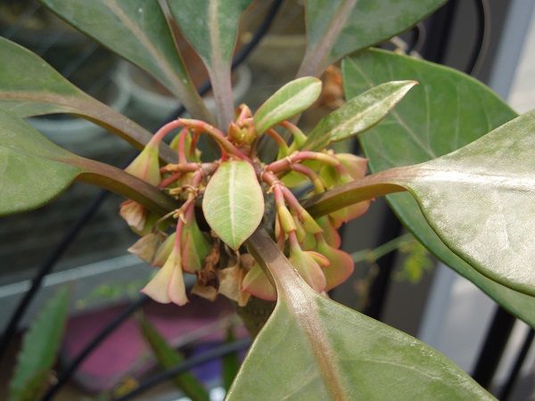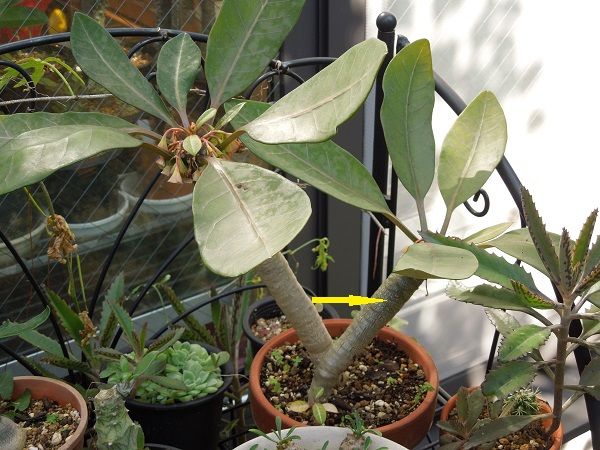 ユーフォルビア・ミロッティが花盛り。といっても目立たない花ですが・・・