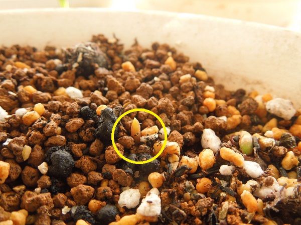 左の芽は根が見えている種の物だと思うが、土を足しているので右の芽はどの種から出たかわからない。