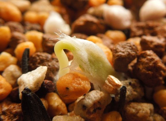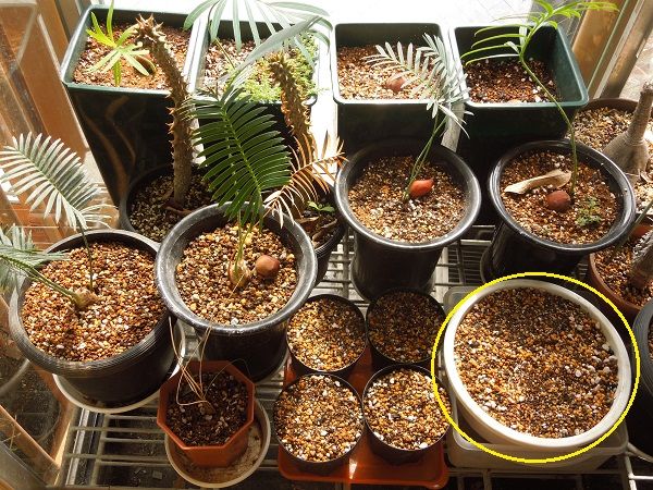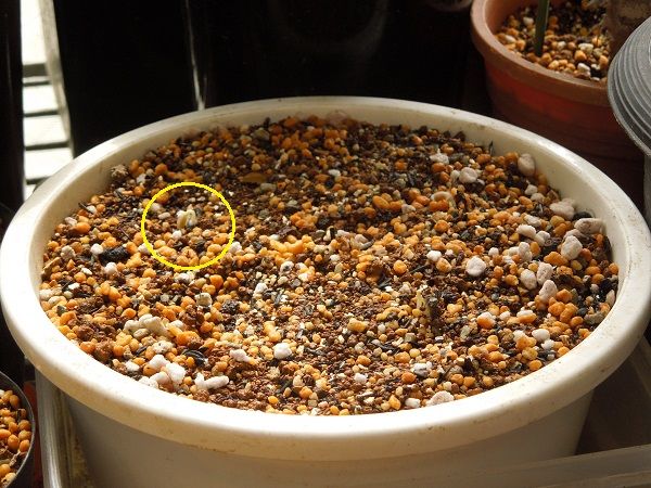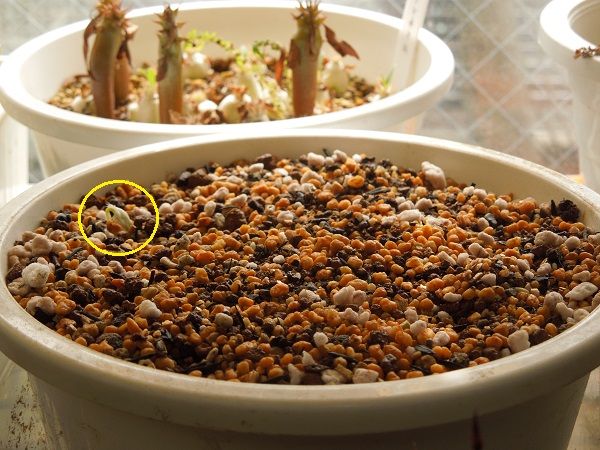 早いとは聞いていたが、一昨日蒔いたフォークイエリアコルムナリスがどちらの鉢も1つづつだが発芽した。