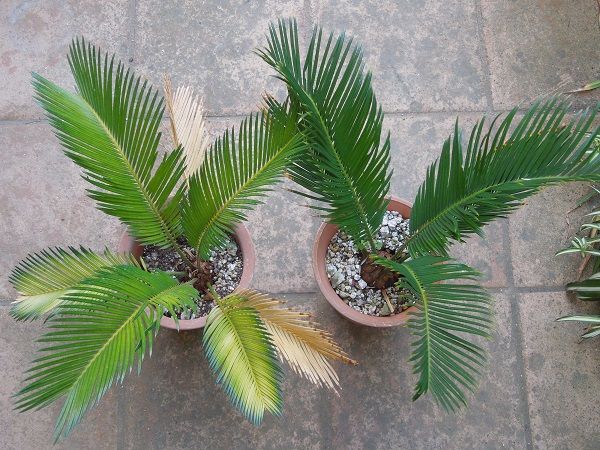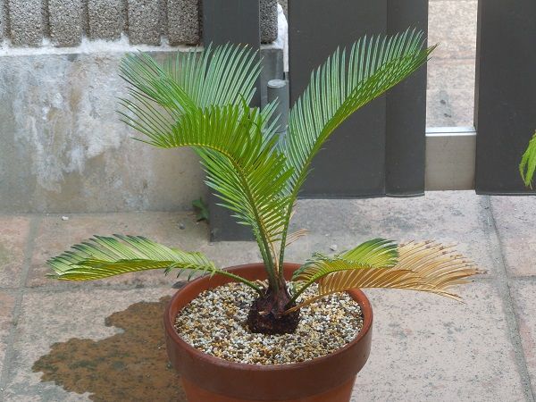 右が自宅に置いてあった金環蘇鉄。届いた時はどちらも同じ様な感じの葉だったが、ずいぶんと違っている。